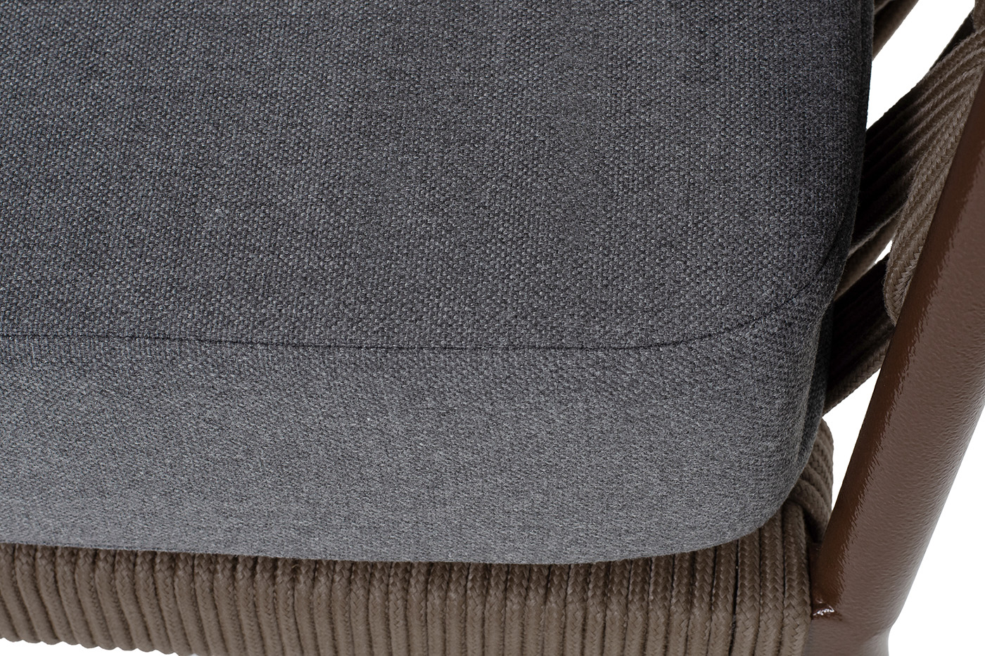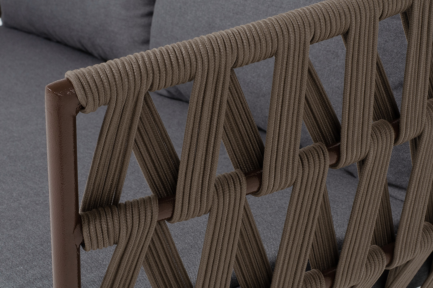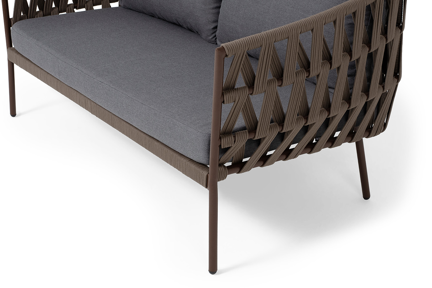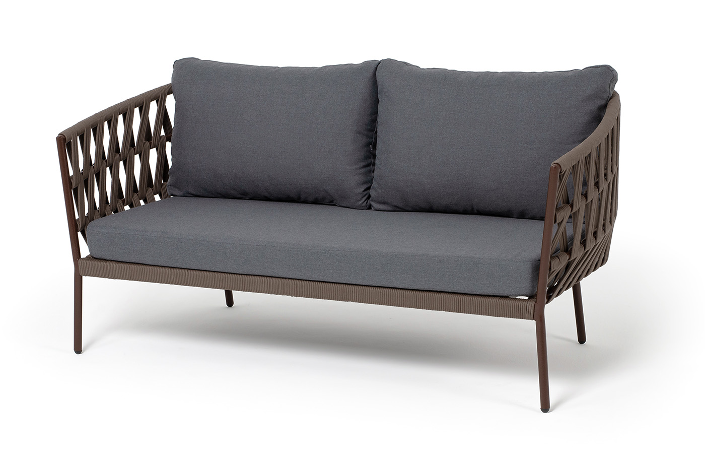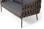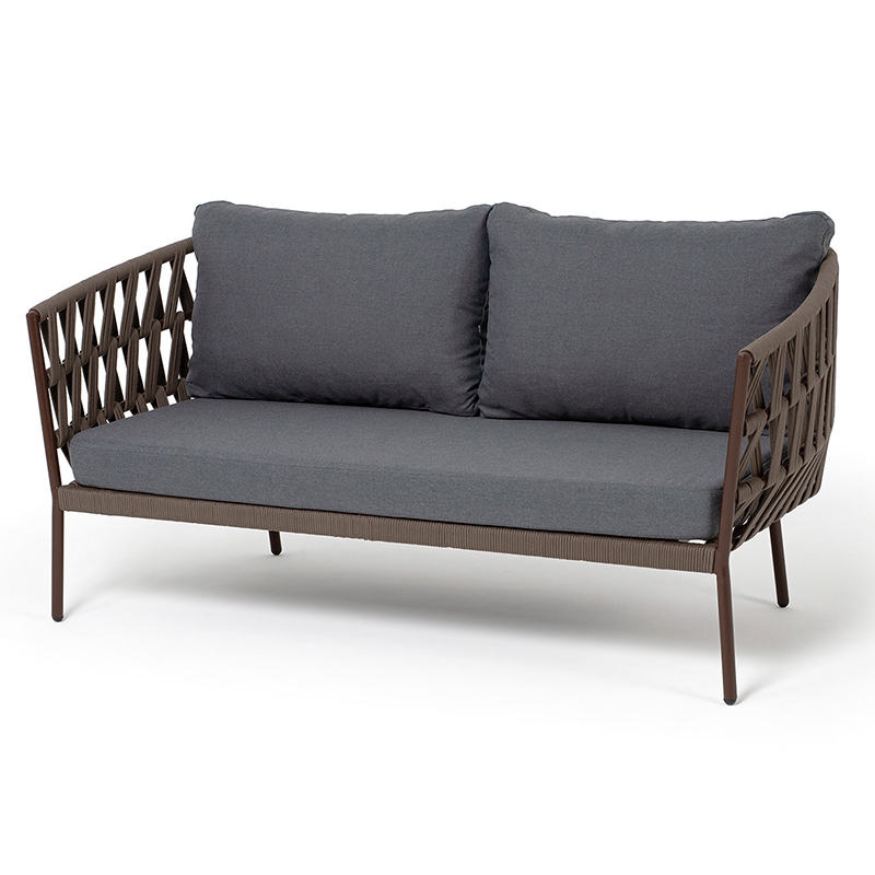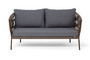 "Диего" диван 2-местный плетеный из роупа, каркас алюминий коричневый (RAL8016) муар, роуп коричневый круглый, ткань темно-серая 027