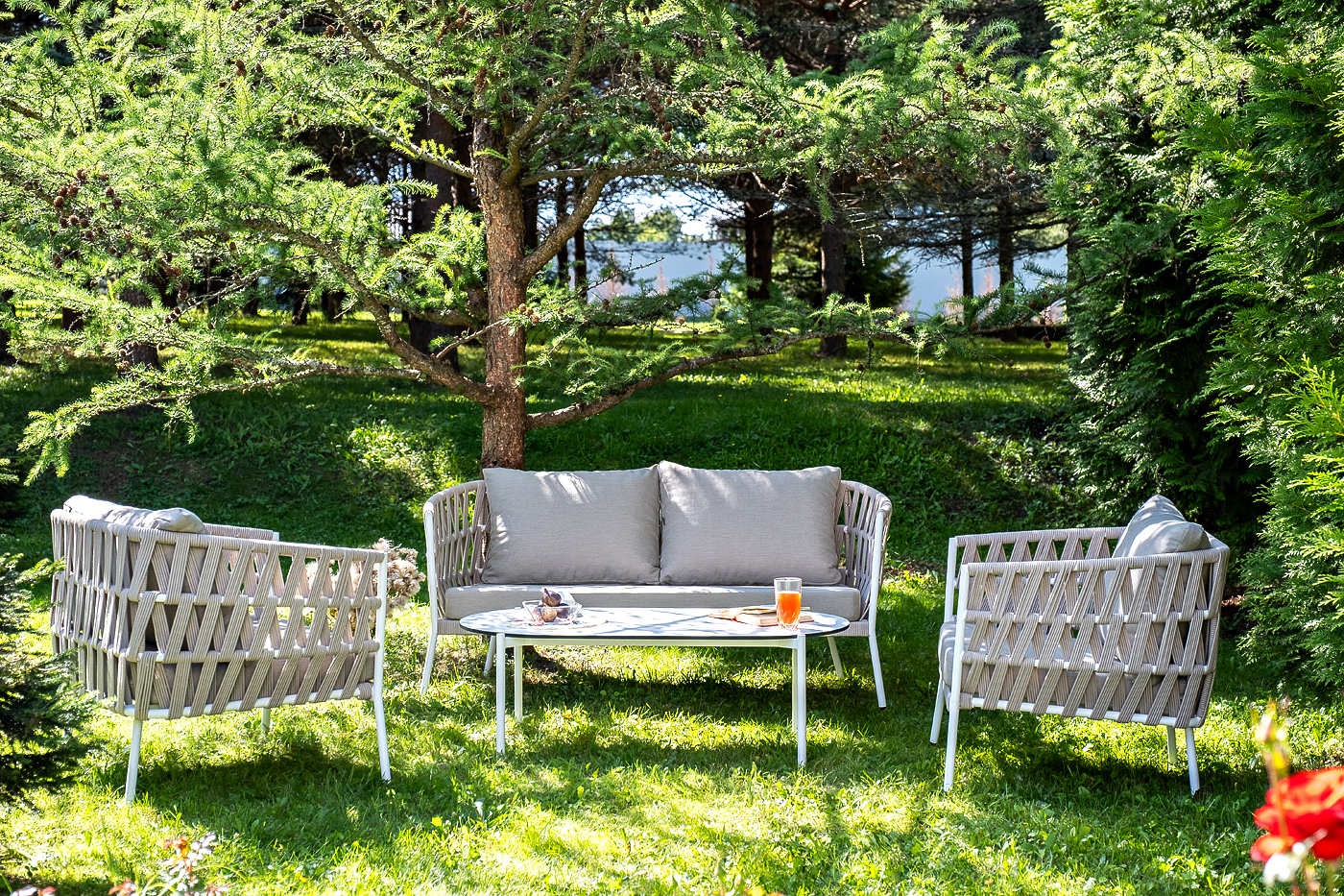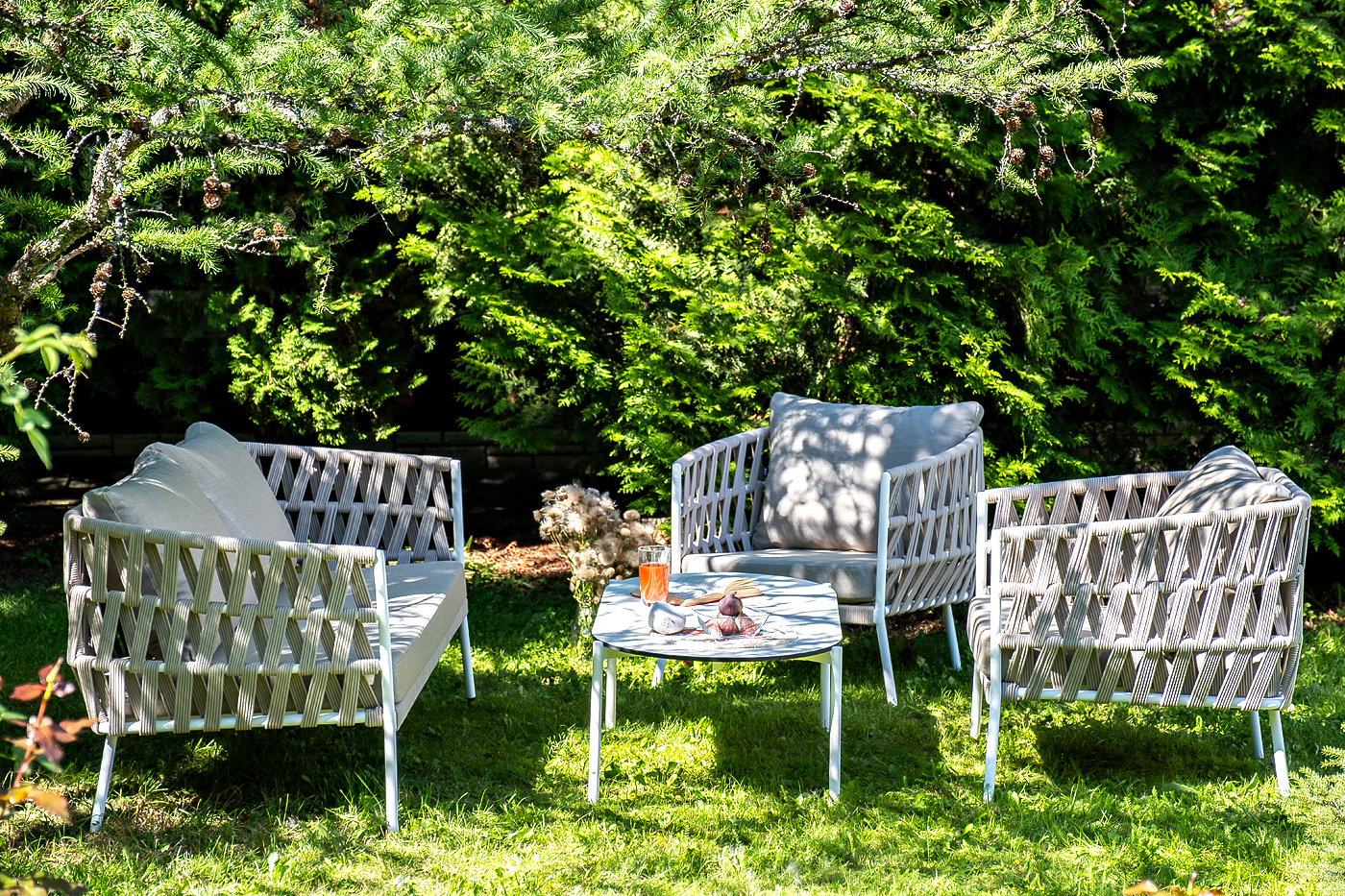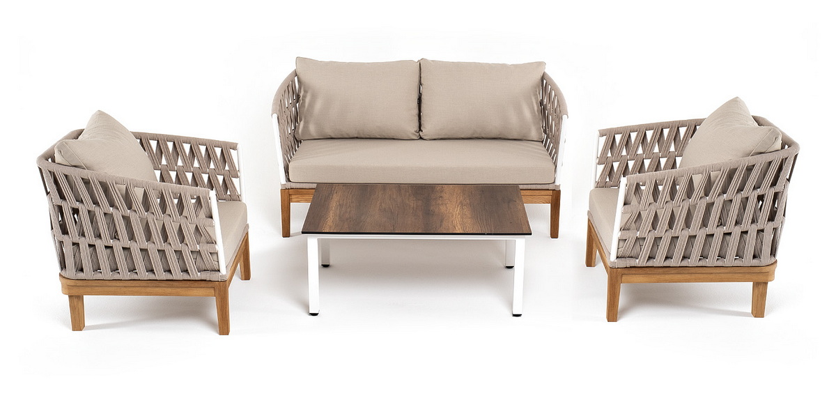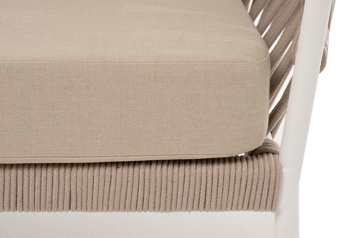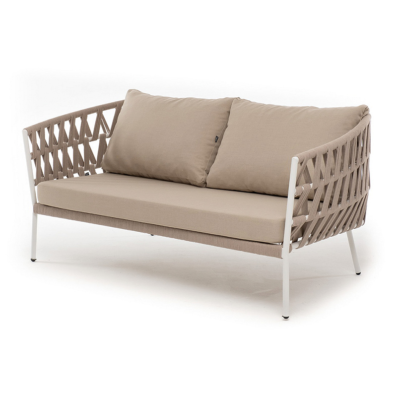 "Диего" диван 2-местный плетеный из роупа, каркас алюминий белый муар, роуп бежевый круглый, ткань бежевая 052