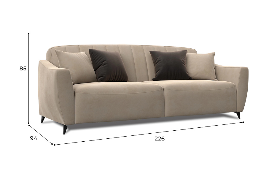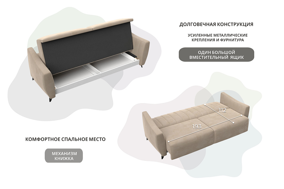 При своих габаритах 226х94х85 см подойдет для комнат любых размеров, легко раскладывается, обеспечивая спальное место 112х194 см.