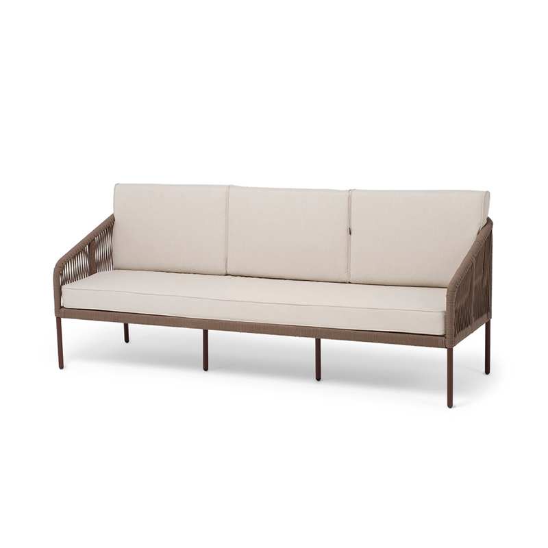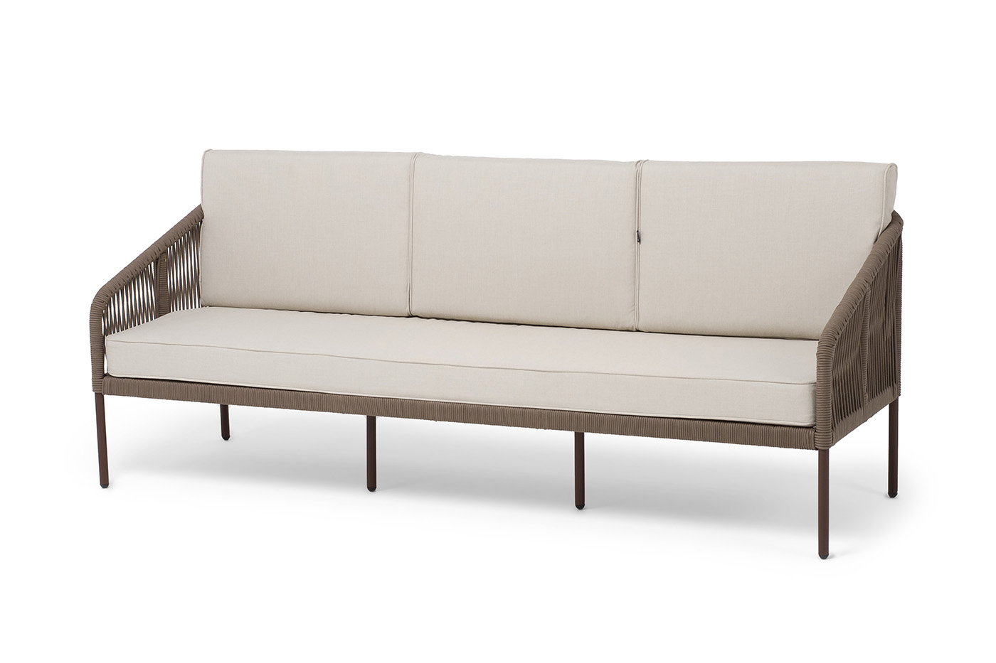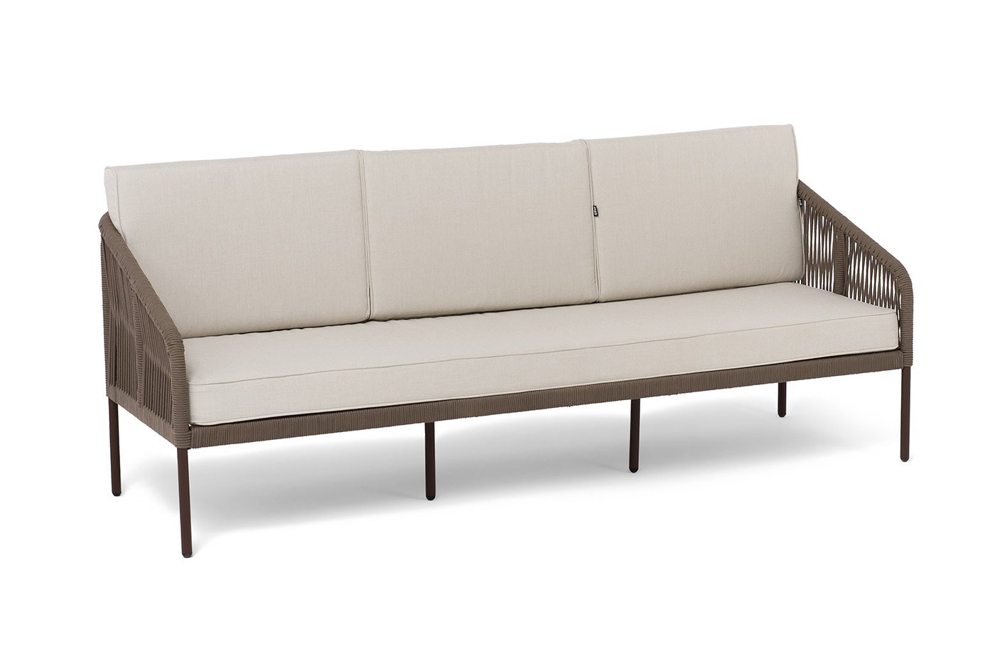 "Канны" диван 3-местный плетеный из роупа, каркас алюминий коричневый (RAL8016) муар, роуп коричневый круглый, ткань бежевая 15052