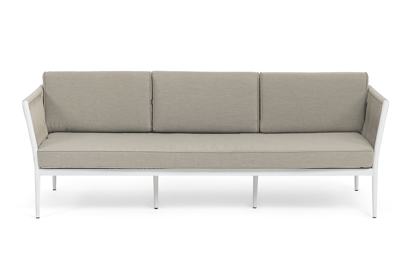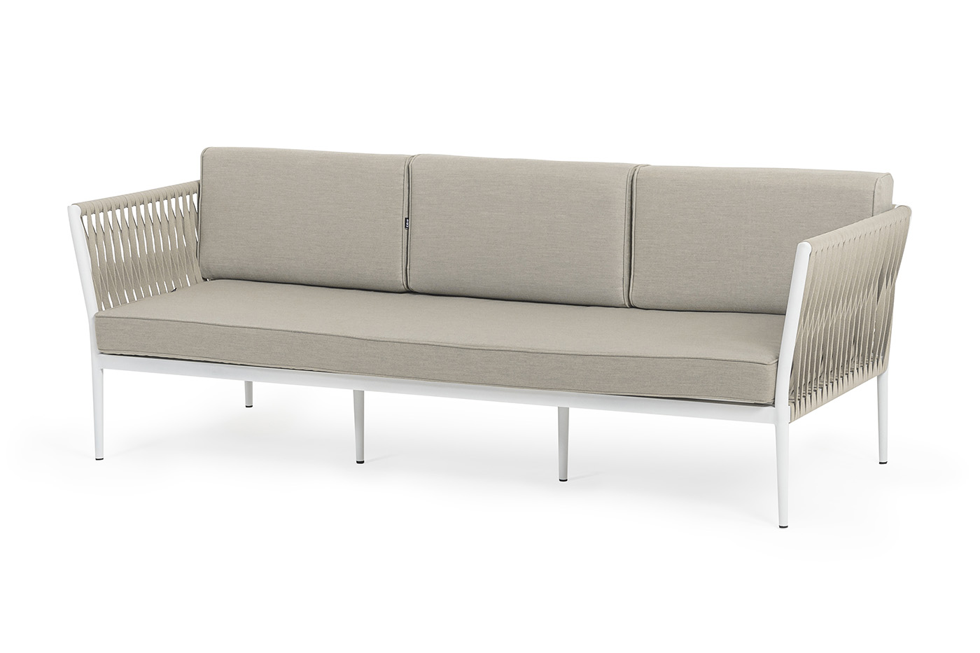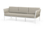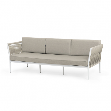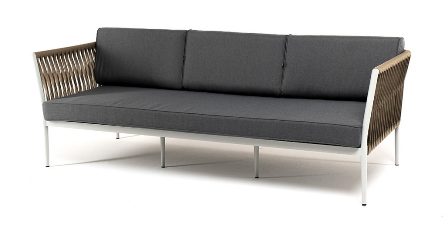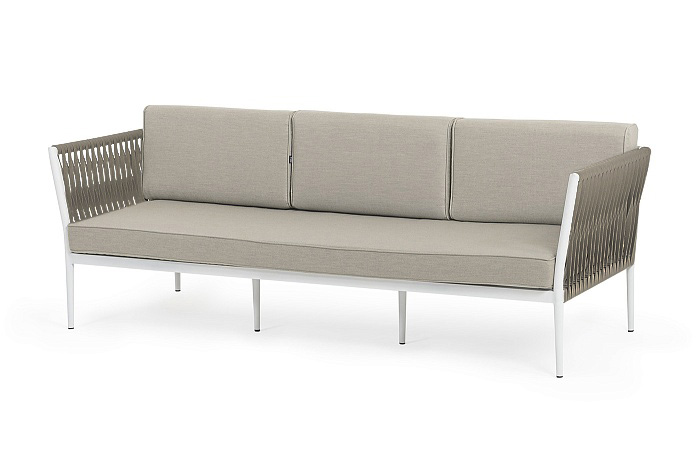 "Касабланка" диван 3-местный плетеный из роупа, каркас алюминий белый муар, роуп бежевый 20мм, ткань бежевая 15052