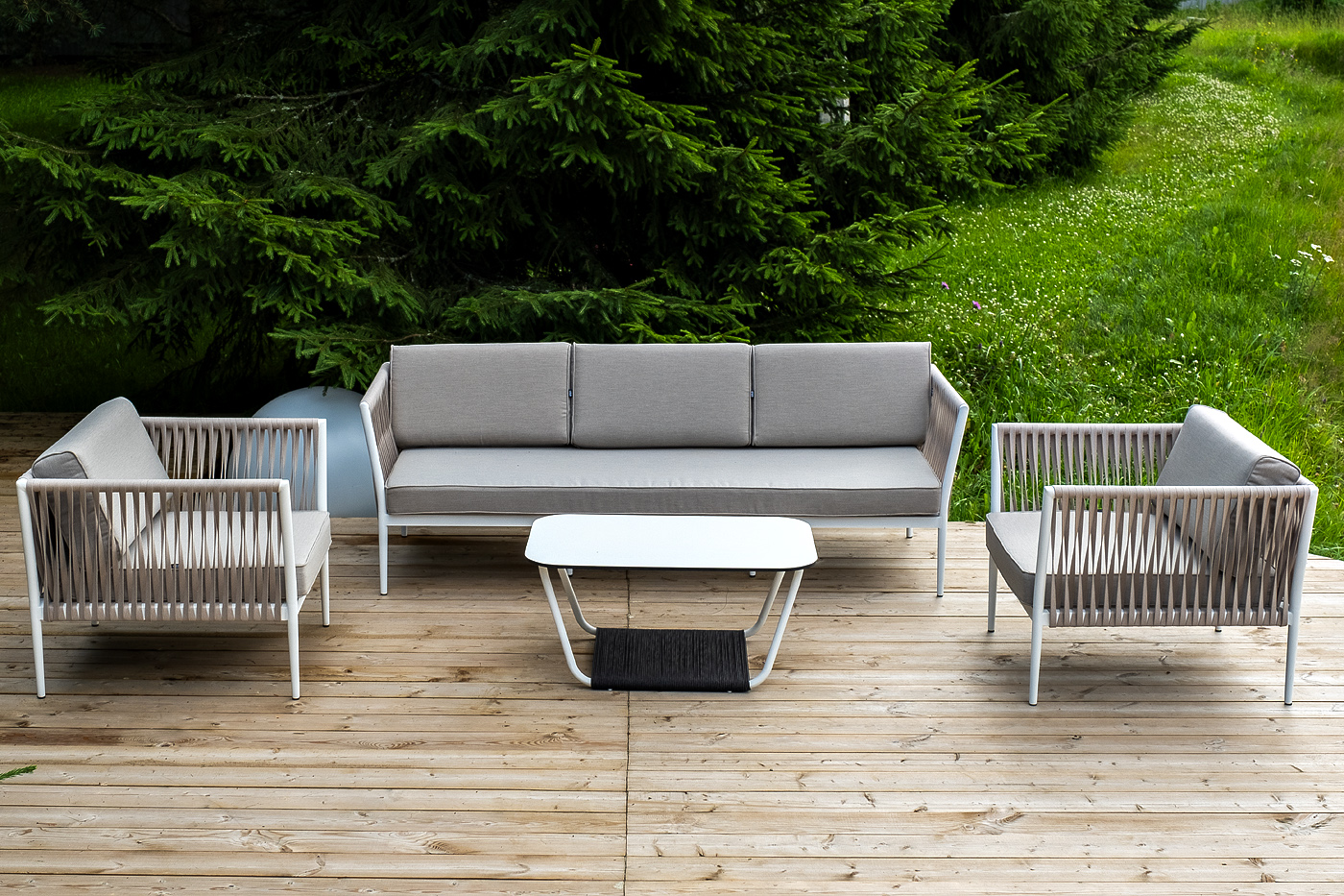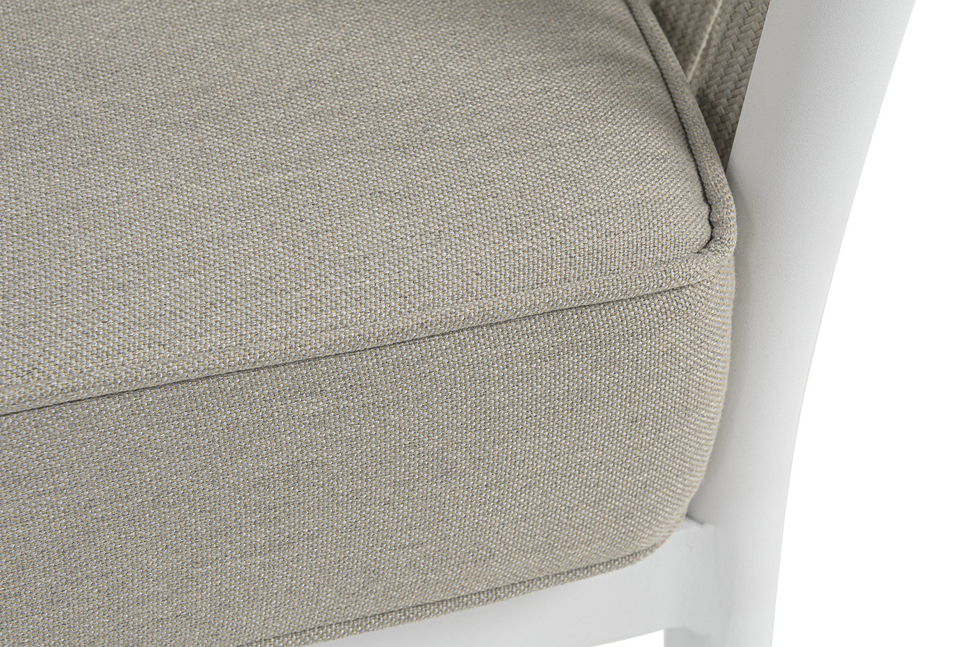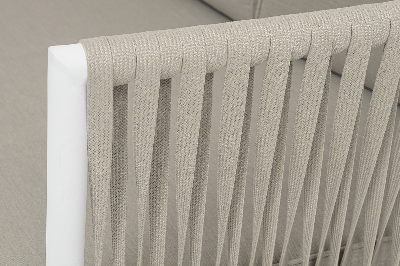 "Касабланка" диван 3-местный плетеный из роупа, каркас алюминий белый муар, роуп бежевый 20мм, ткань бежевая 15052