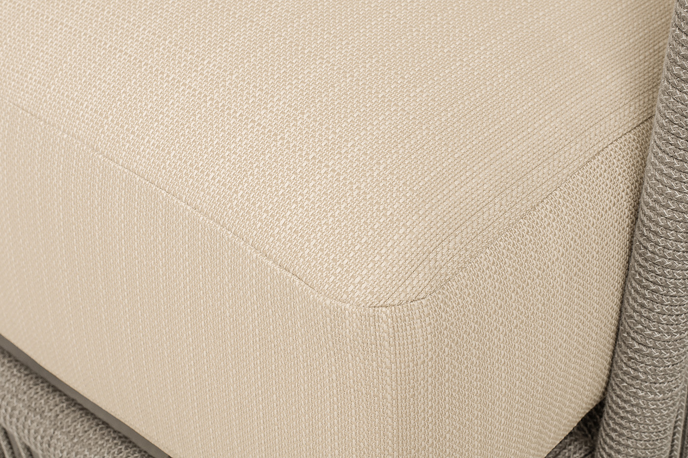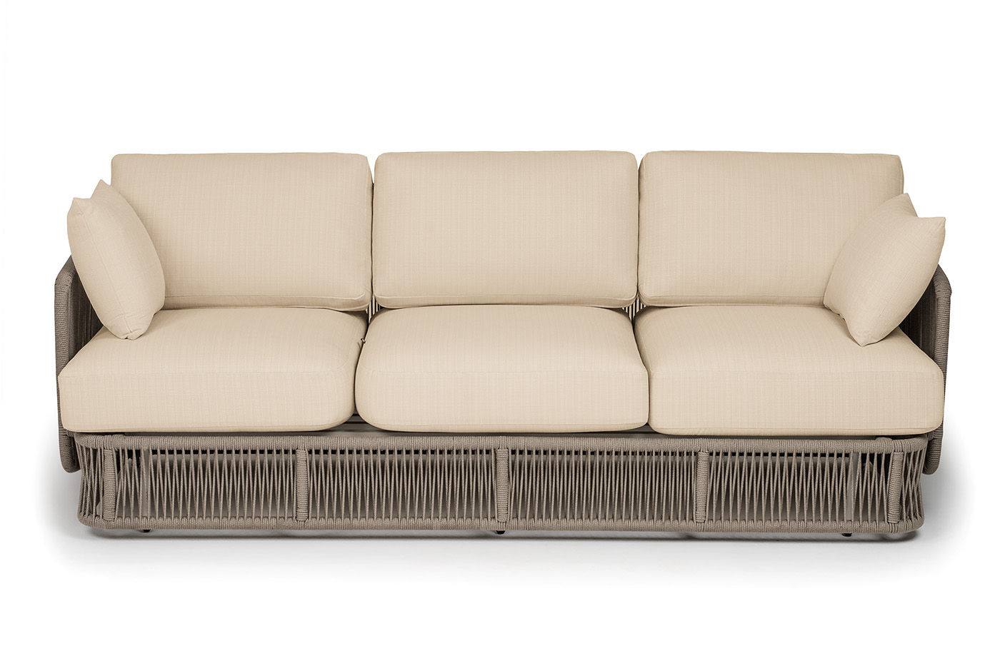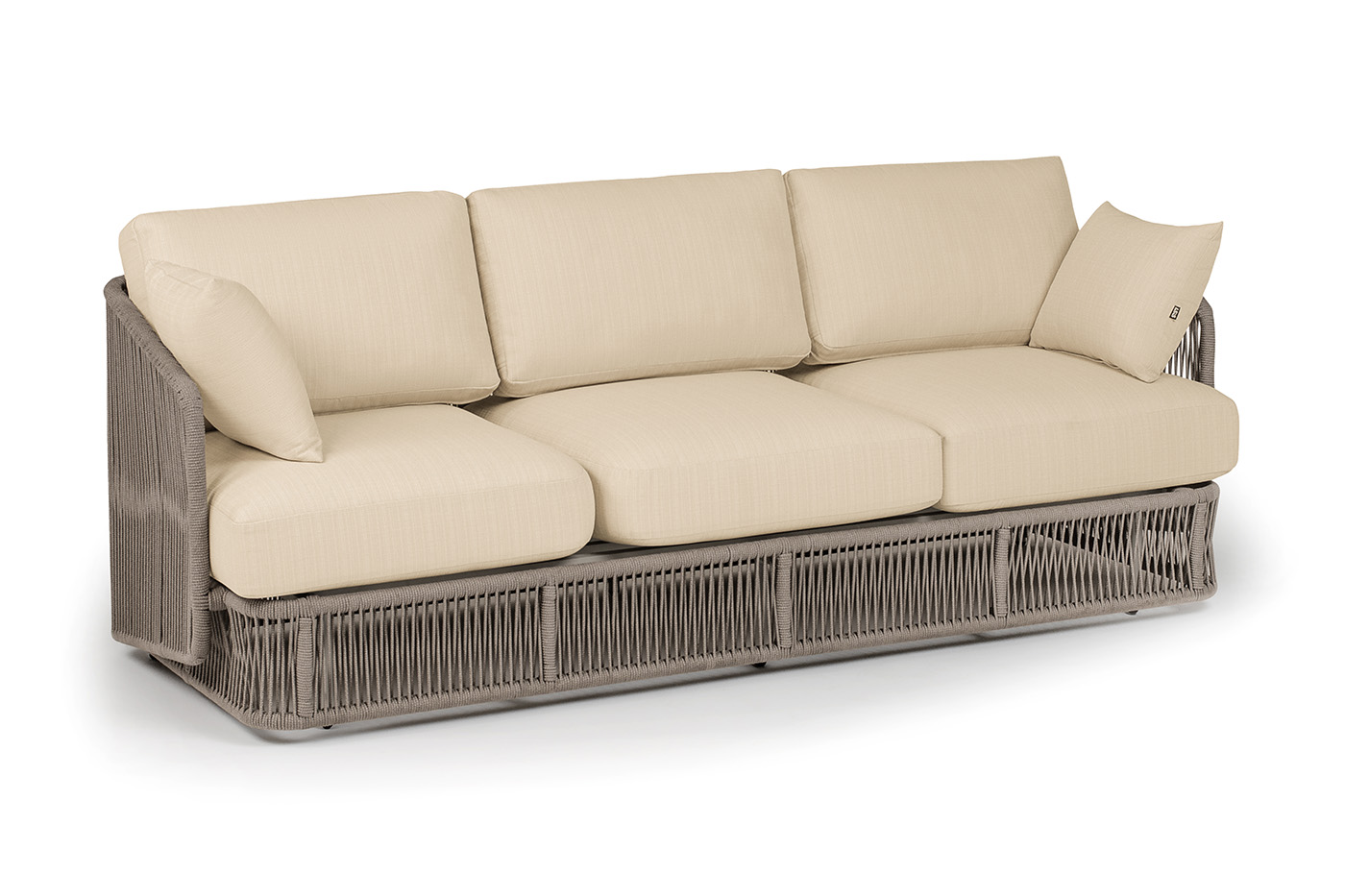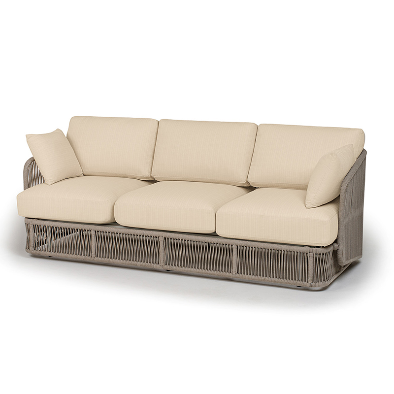 "Альбано" диван 3-местный плетеный из роупа, каркас алюминий светло-серый (RAL7035) муар, роуп бежевый круглый, ткань Mossle светло-бежевая
