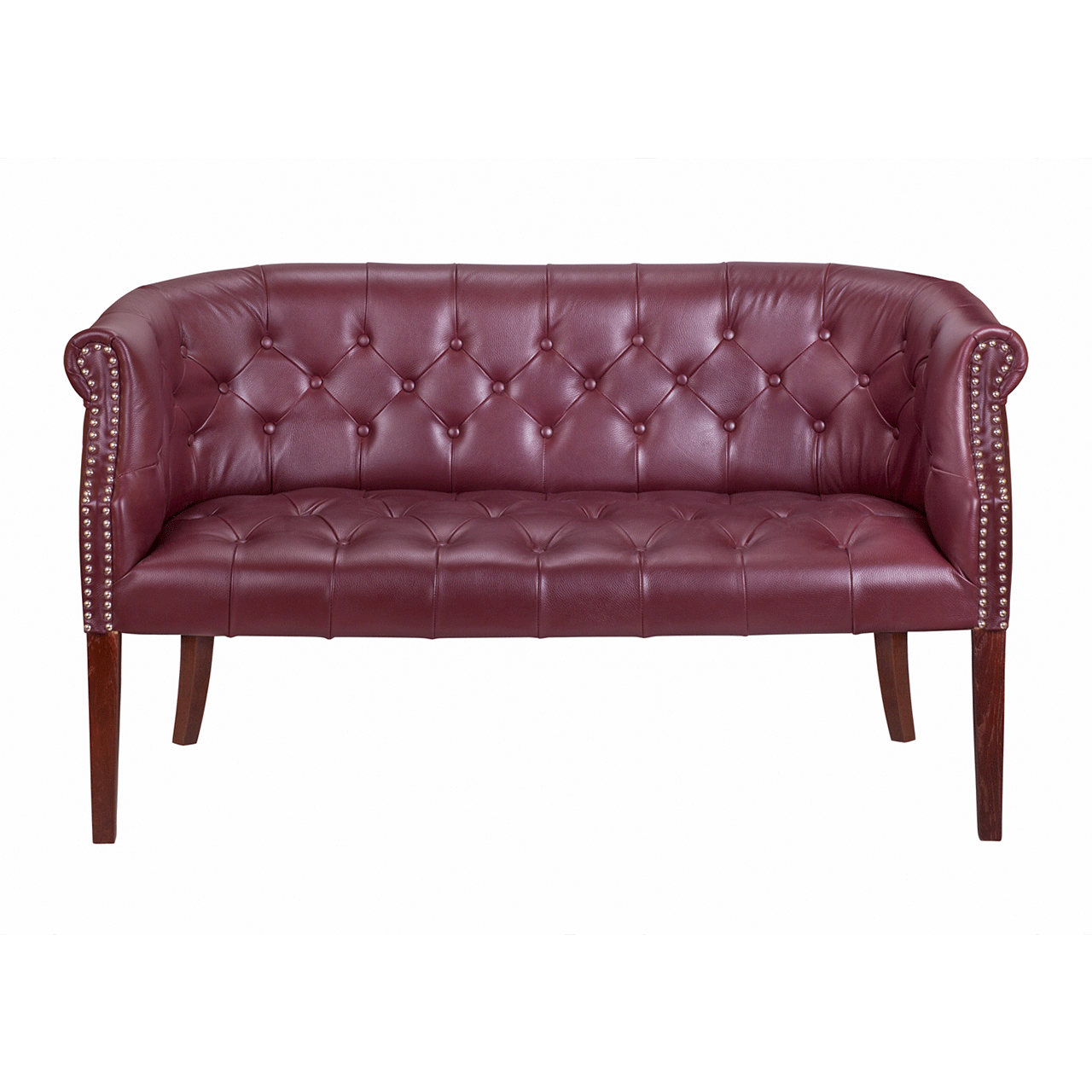 Запросить индивидуальное предложениеДиван «Grace» на изящных высоких ножках. Прочный каркас модели изготовлен из деревянного массива, верх выполнен из натуральной кожи красно-коричневого цвета. Спинка плавно загибается и переходит в боковые стороны, с образованием уютного полузакрытого пространства. Обивка декорирована ромбовидной стяжкой с мебельными пуговицами, по бокам – серебристые заклепки.