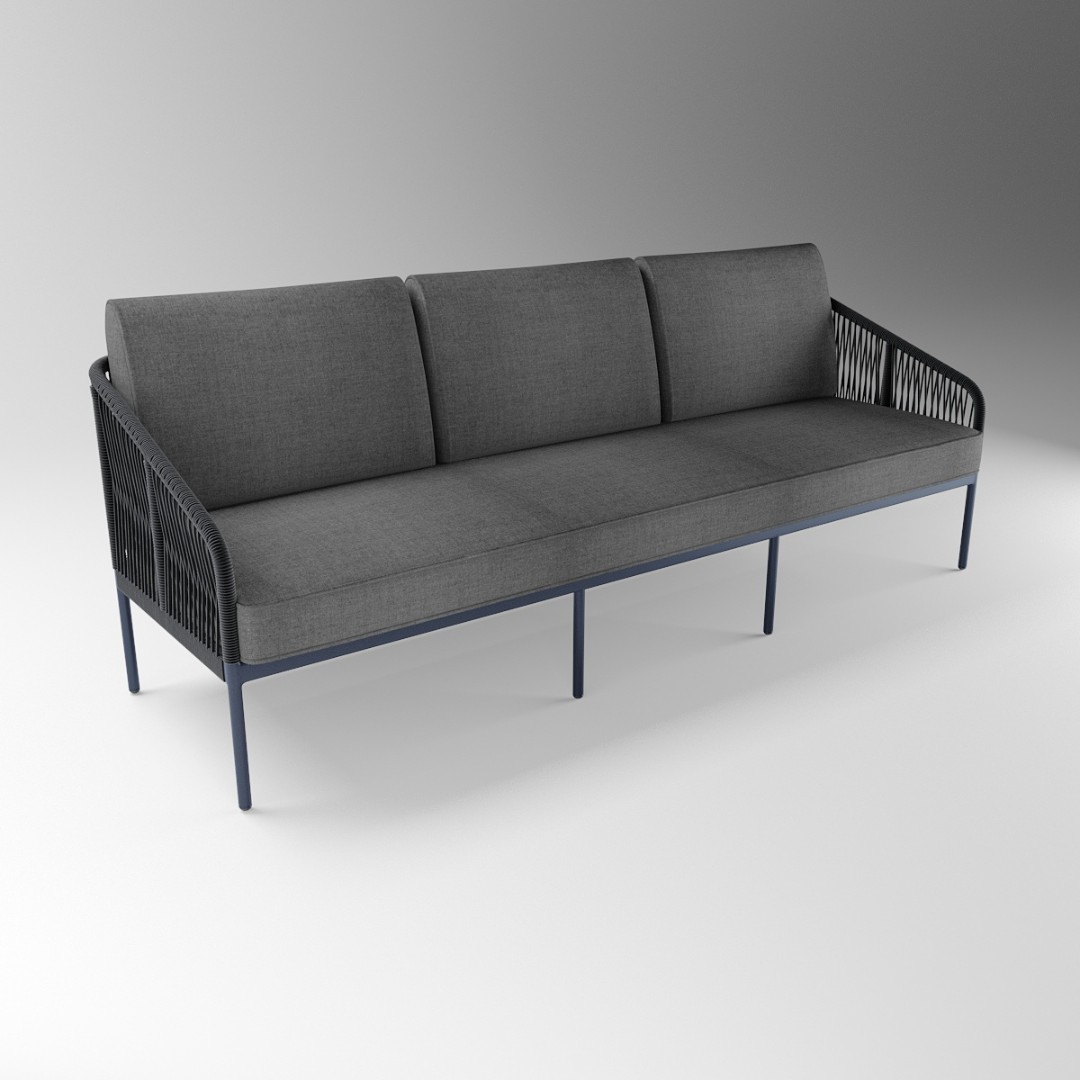"Канны" диван 3-местный плетеный из роупа, каркас алюминий темно-серый (RAL7024) муар, роуп темно-серый круглый, ткань темно-серая 027