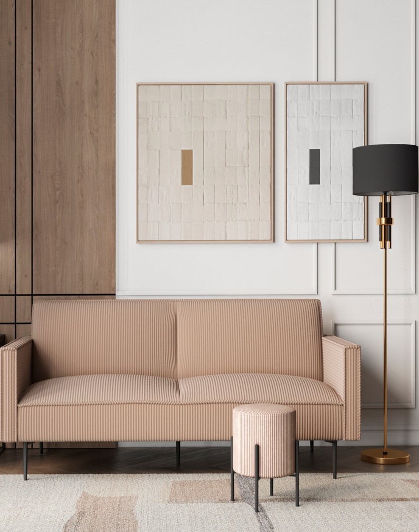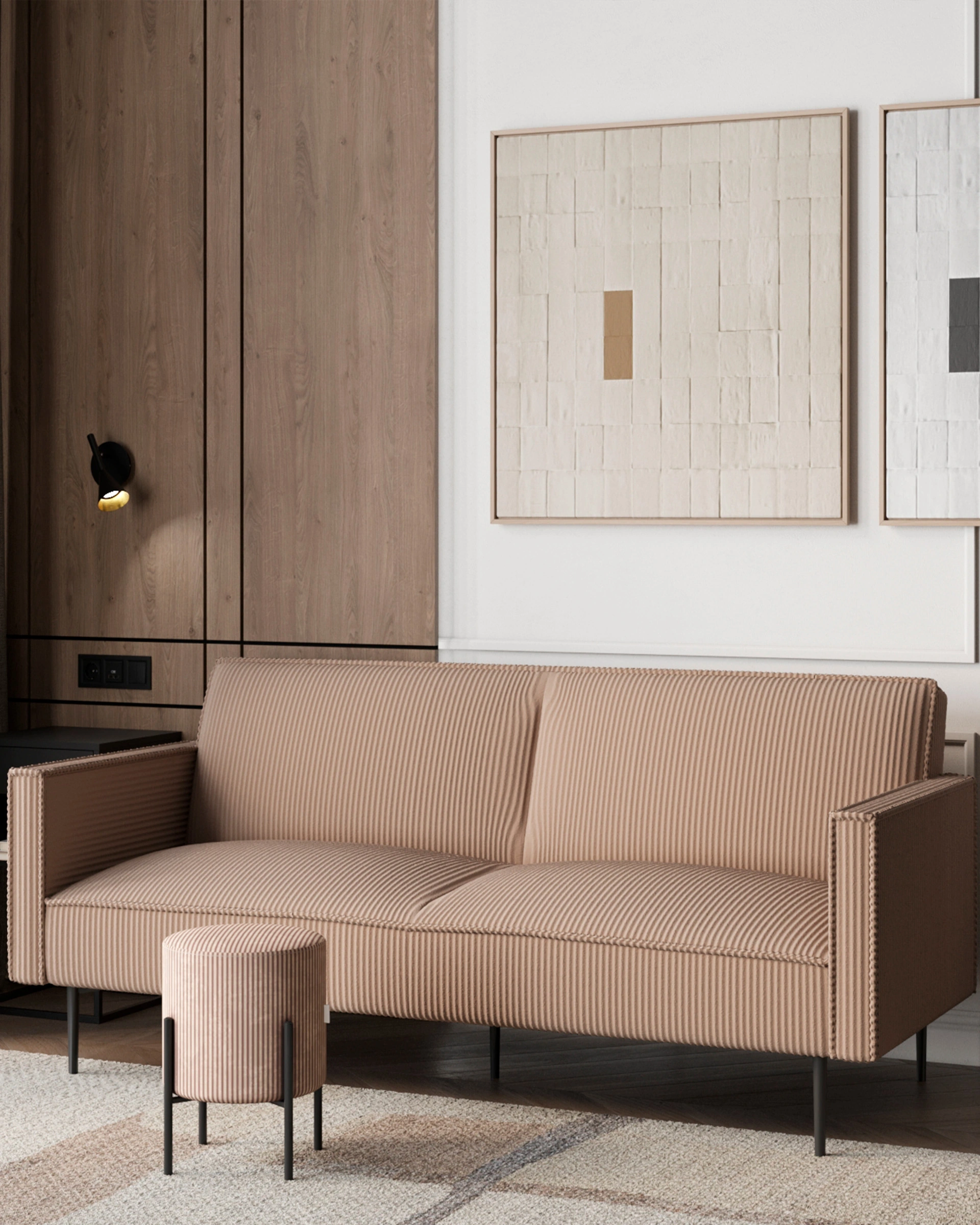 Мягкая обивка выполнена из износостойкого рельефного велюра, тактильно приятный и долговечный материал. Металлические ножки высотой 14,5 см выдерживают нагрузку до 80 кг. Подпятники в основании ножек делают пуф более устойчивым и предотвращают скольжение. Отличное дополнение в интерьер спальни, прихожей или зала.