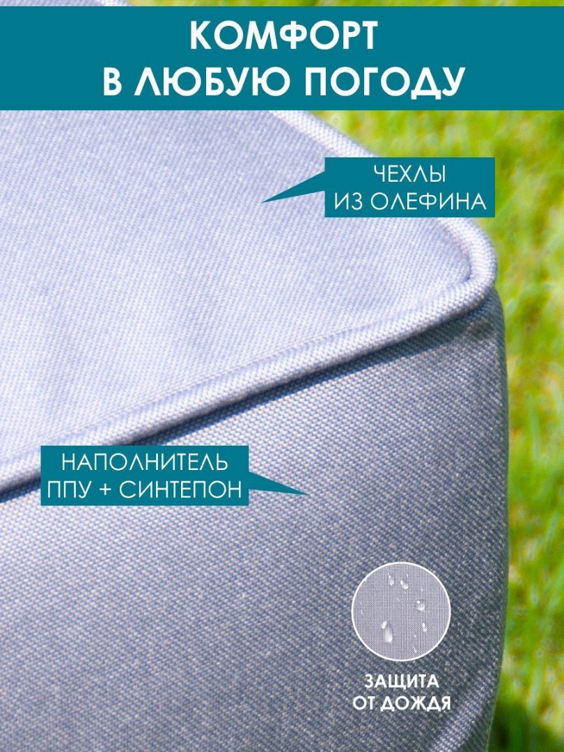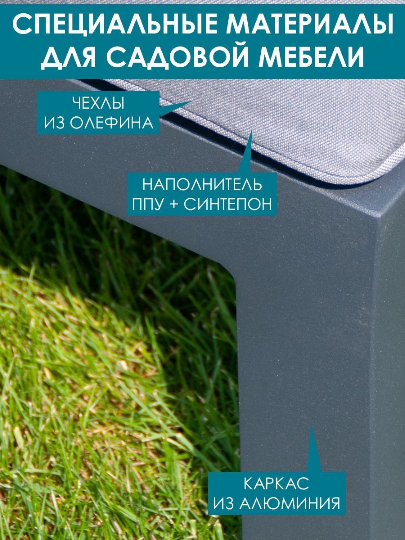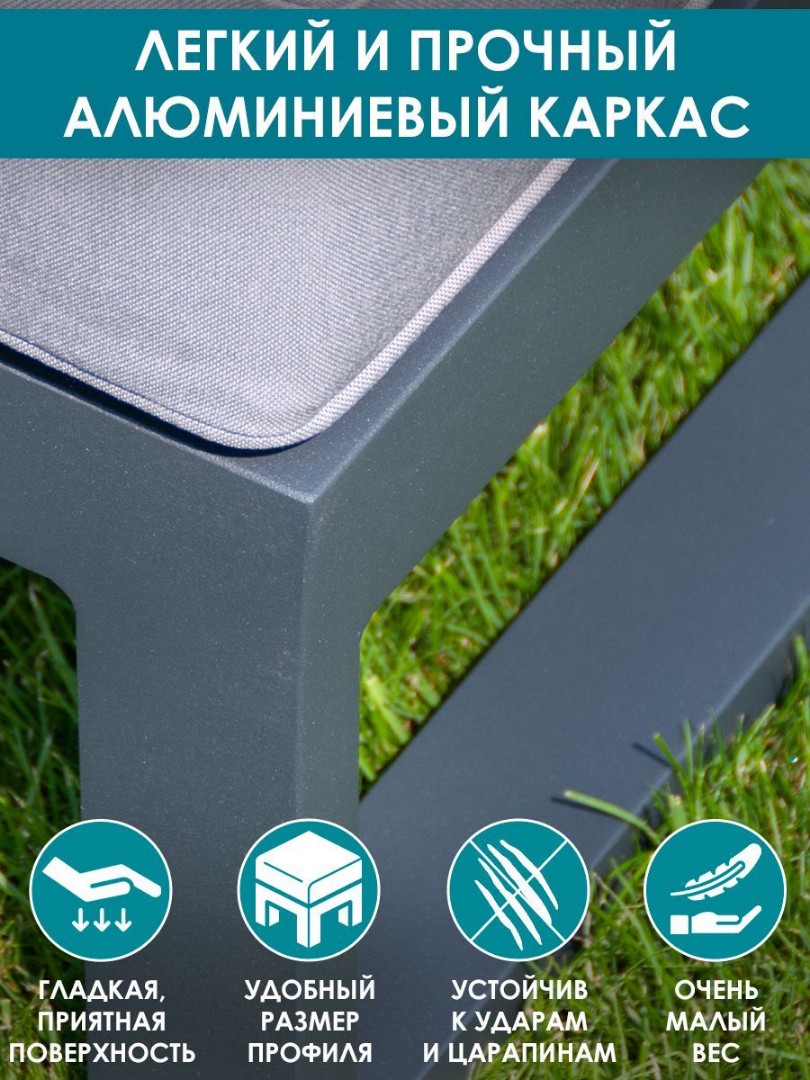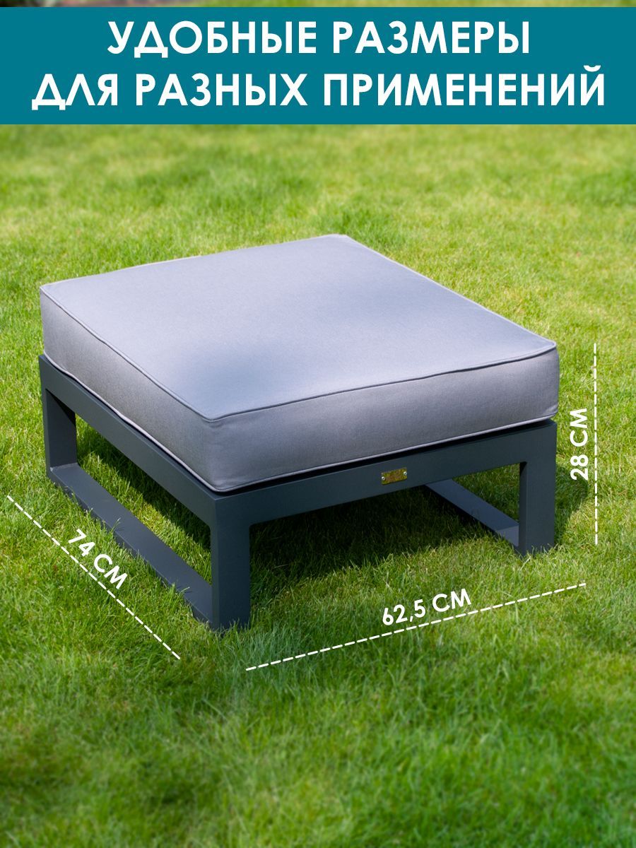 Запросить индивидуальное предложениеПуф «Лагуна». Каркас: Аллюминий, окрашенный в цвет антрацит. Размеры пуфа ШхВхД 625х280х745 мм. Размер подушки: ШхВхД 660х120х800 мм; Вес: 3 кг. Ткань олефин, устойчива к истиранию, выгоранию на солнце, влагоотталкивающая. Наполнитель: многослойный формованный ППУ различной плотности, синтепон и спанбонд. Чехол подушки на молнии. Вес каркаса: 5,9 кг. Продукция поставляется в собранном виде (пуф + 1 подушка). Нагрузка до 120 кг. Гарантия: 12 месяцев.