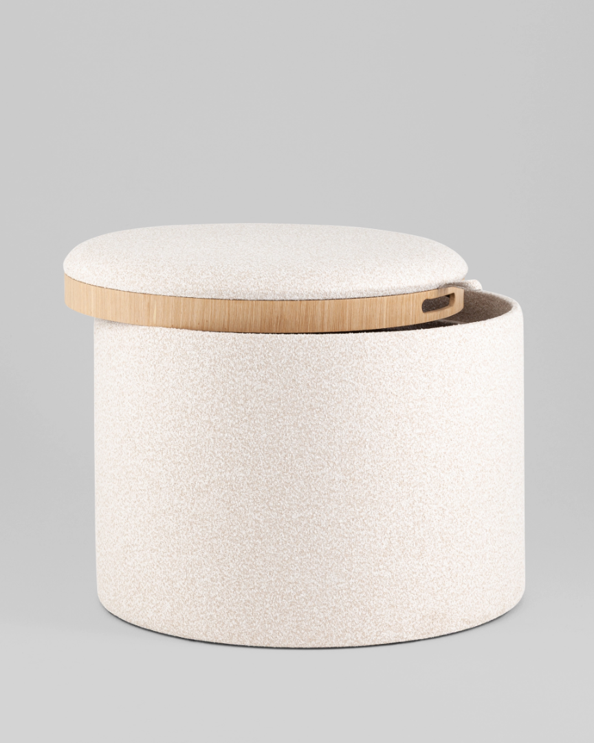 Мягкая обивка выполнена из букле. Прочный каркас из фанеры не утяжеляет изделие и выдерживает нагрузку до 150 кг. Небольшие подпятники в основании пуфа защищают напольные покрытия от царапин и предотвращают скольжение.