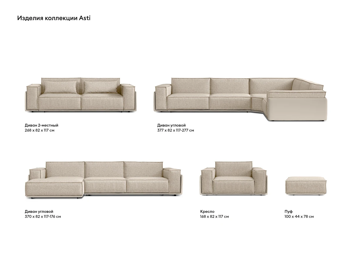 Диваны имеют функцию раскладывания. Характеризуются большой вместимостью, упругой, в меру мягкой, поверхностью. Благодаря конструкции диван можно разместить у стены, в углу комнаты или в центре. Можно выбрать цвет и фактуру обивки, которая будет соответствовать вашим индивидуальным предпочтениям. Устойчивая и функциональная мягкая группа Asti выведет любое пространство на новый уровень комфорта.