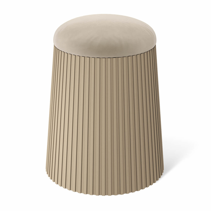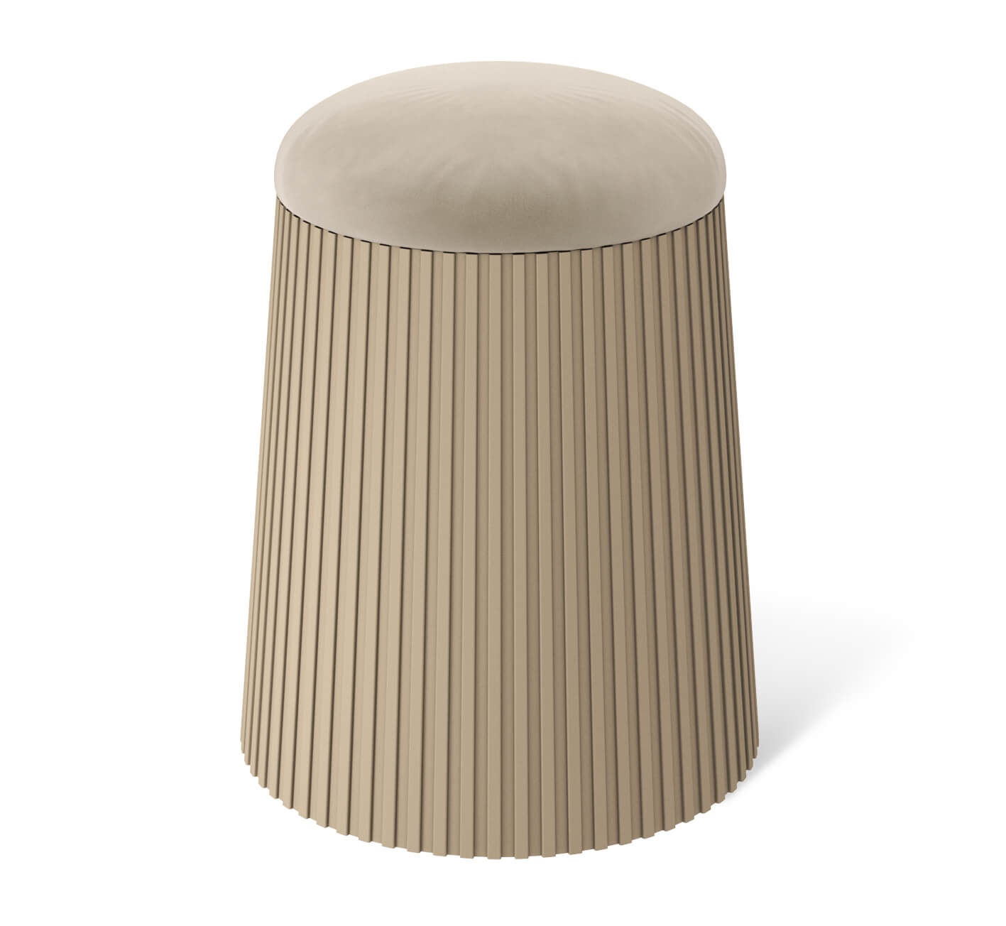 Сиденье пуфика выполнено из микровелюра, в качестве мягкого наполнителя используется поролон. Основание пуфа выполнено из полипропилена с армирующими добавками, за счёт чего повышается жесткость и надёжность изделия.