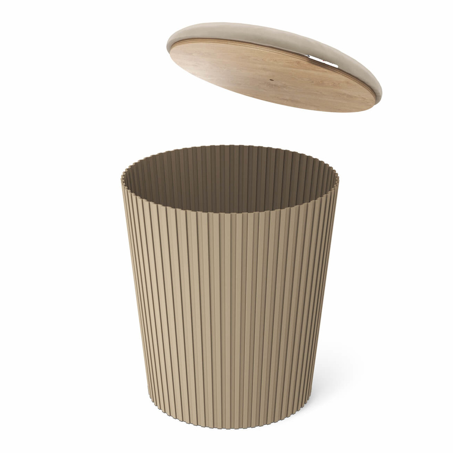 Верхняя часть пуфика открывается, образуя удобное внутреннее пространство для хранения. Внутрь можно убрать пледы, журналы, аксессуары или другие мелочи, поддерживая порядок и визуальную чистоту интерьера. Такое решение делает пуфик не только декоративным элементом, но и практичным помощником в повседневной жизни.