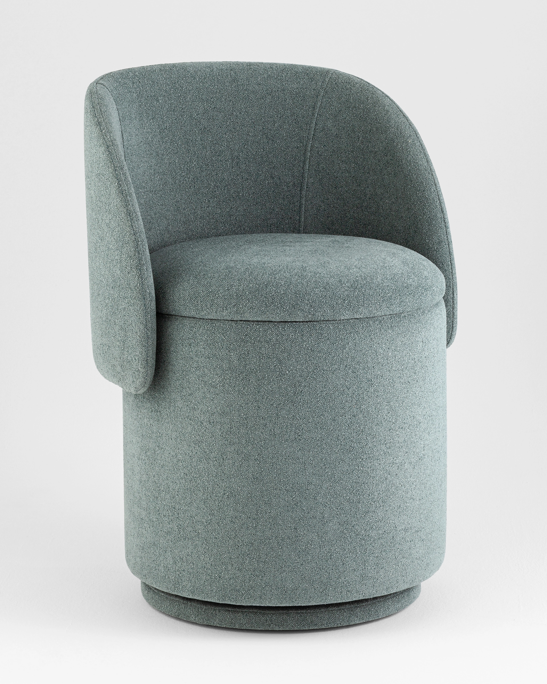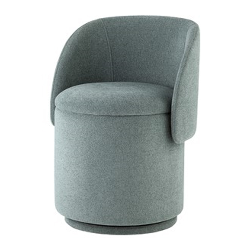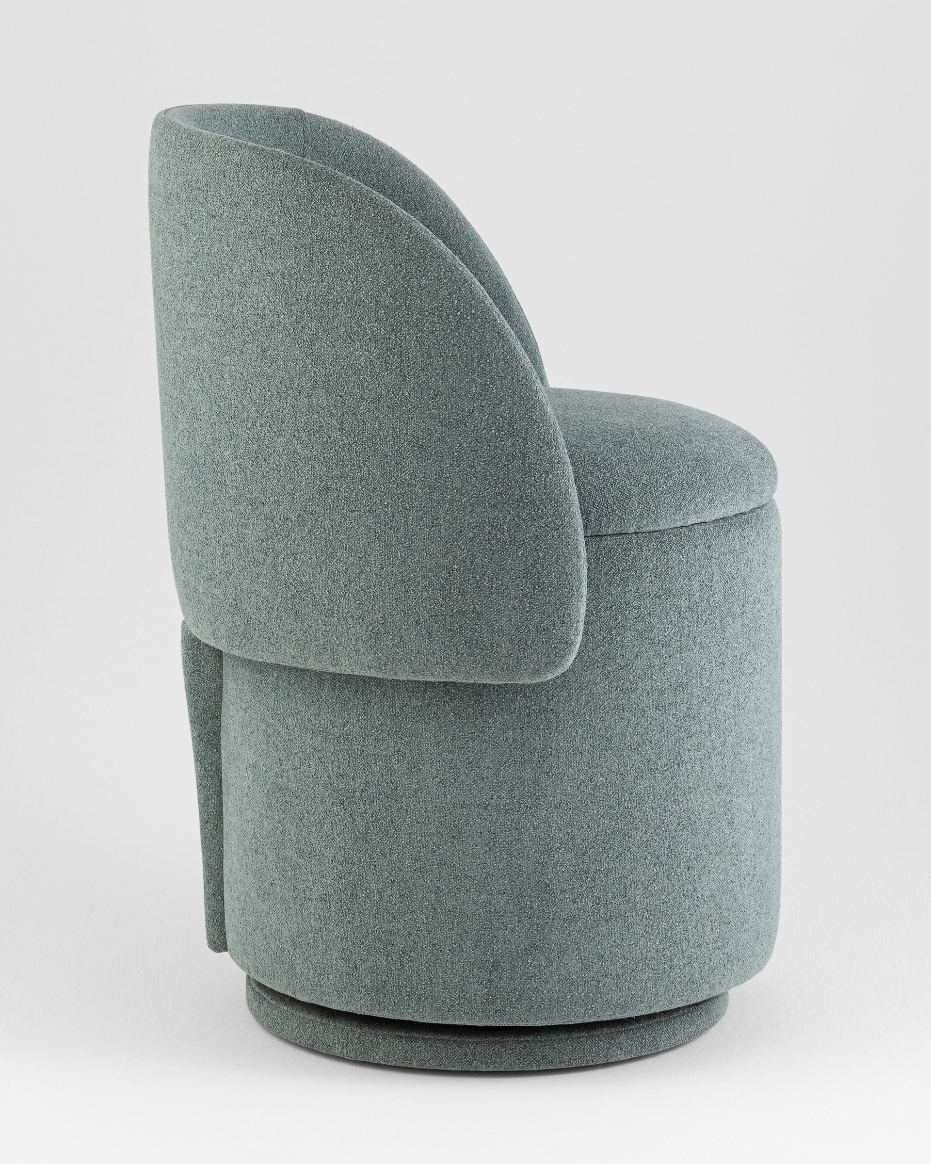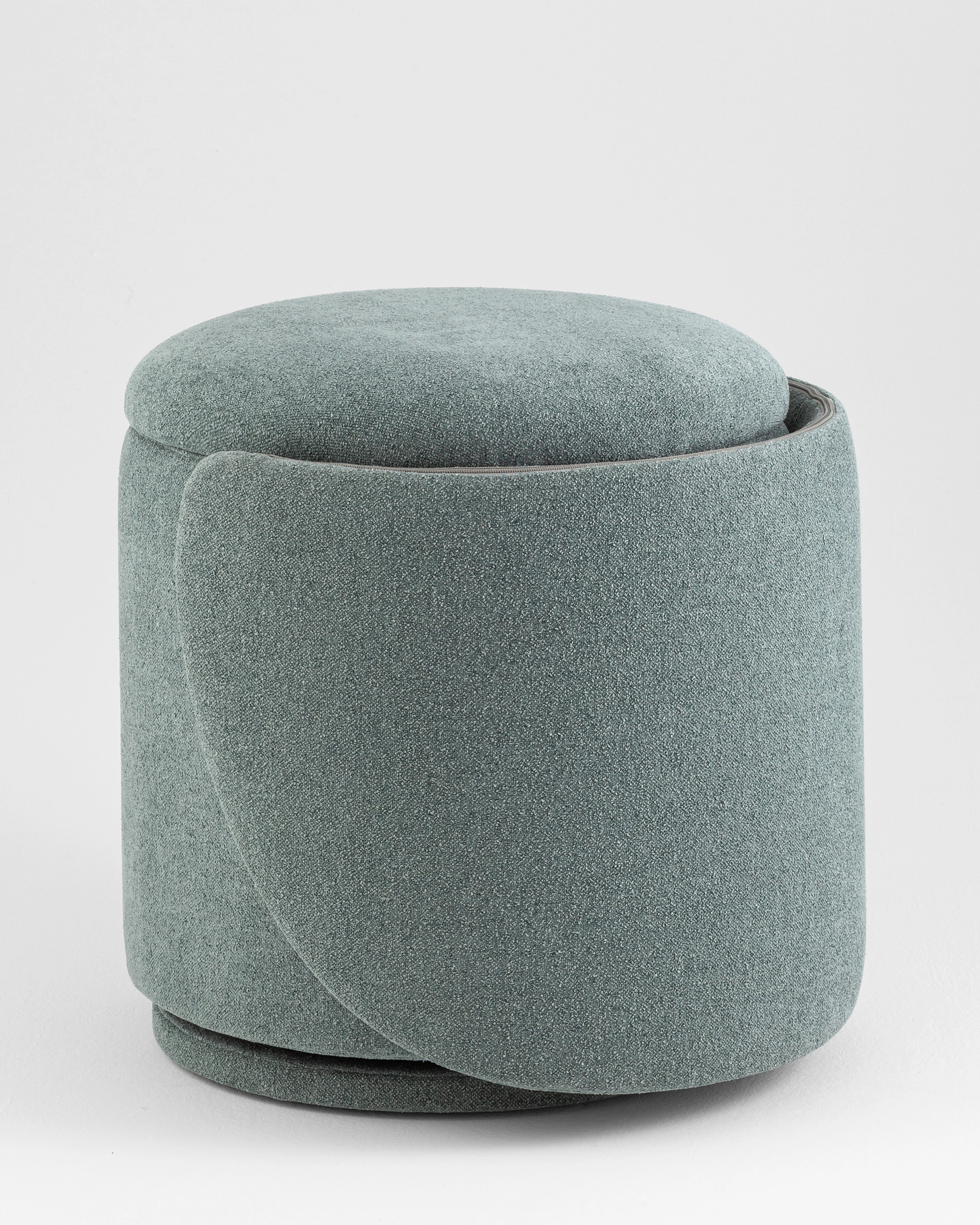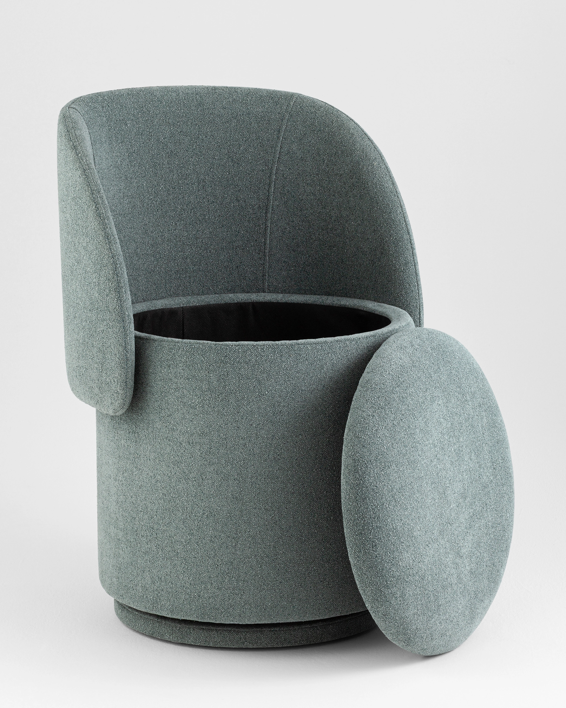 Сиденье наполнено эластичным ППУ, обеспечивающим удобную посадку. Пуф оснащён спинкой, которую при необходимости можно опустить, превратив изделие в полноценный пуф. Модель вращается вокруг своей оси на 360° — чтобы изменить направление, достаточно оттолкнуться ногами. Дополнительным плюсом станет встроенный ящик для хранения — внутри легко разместить плед, книги или другие мелочи.
