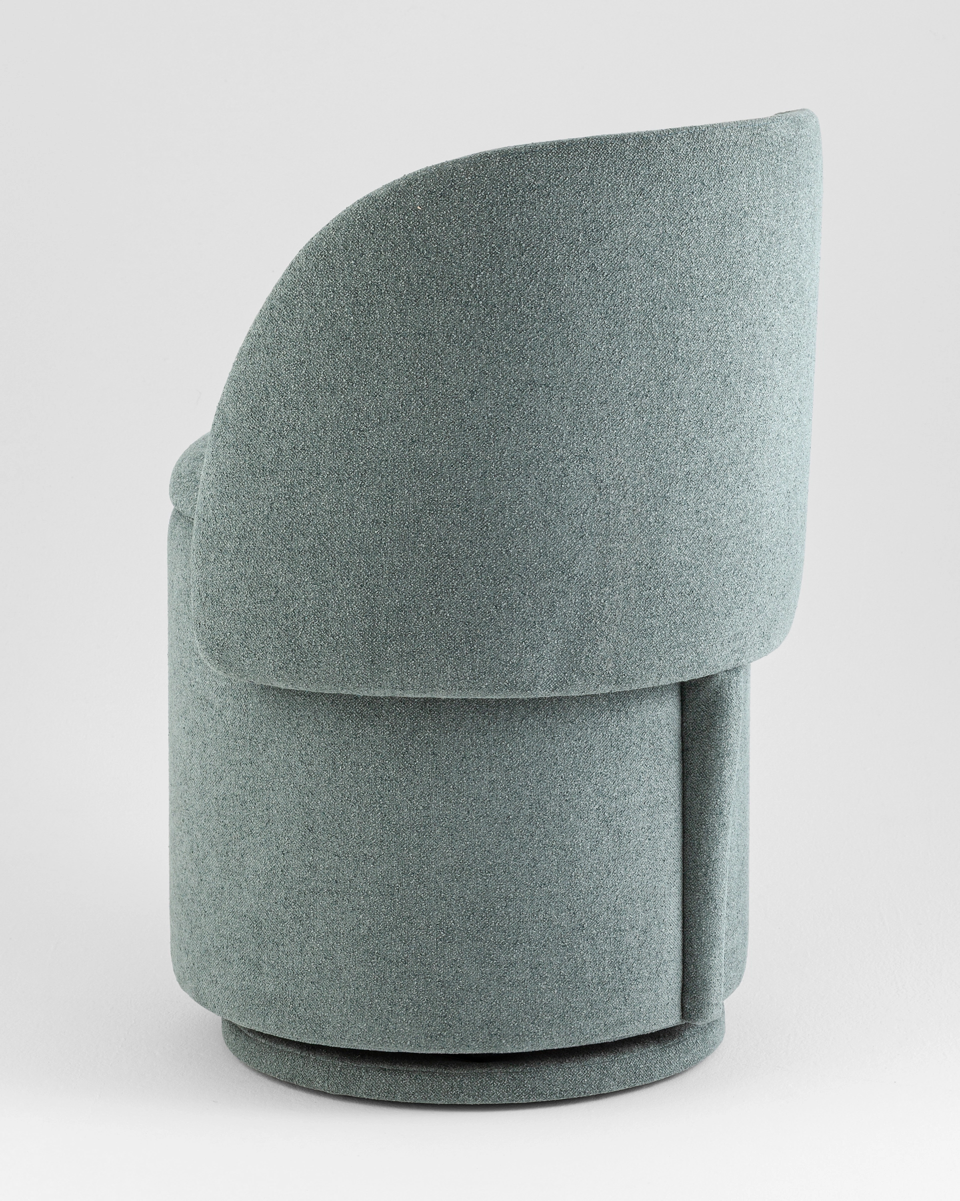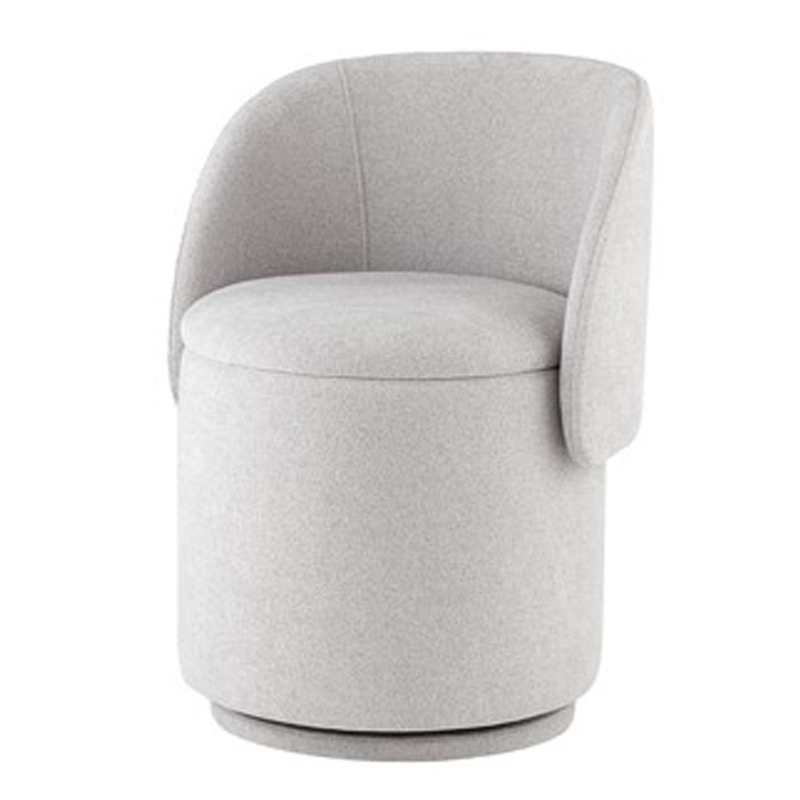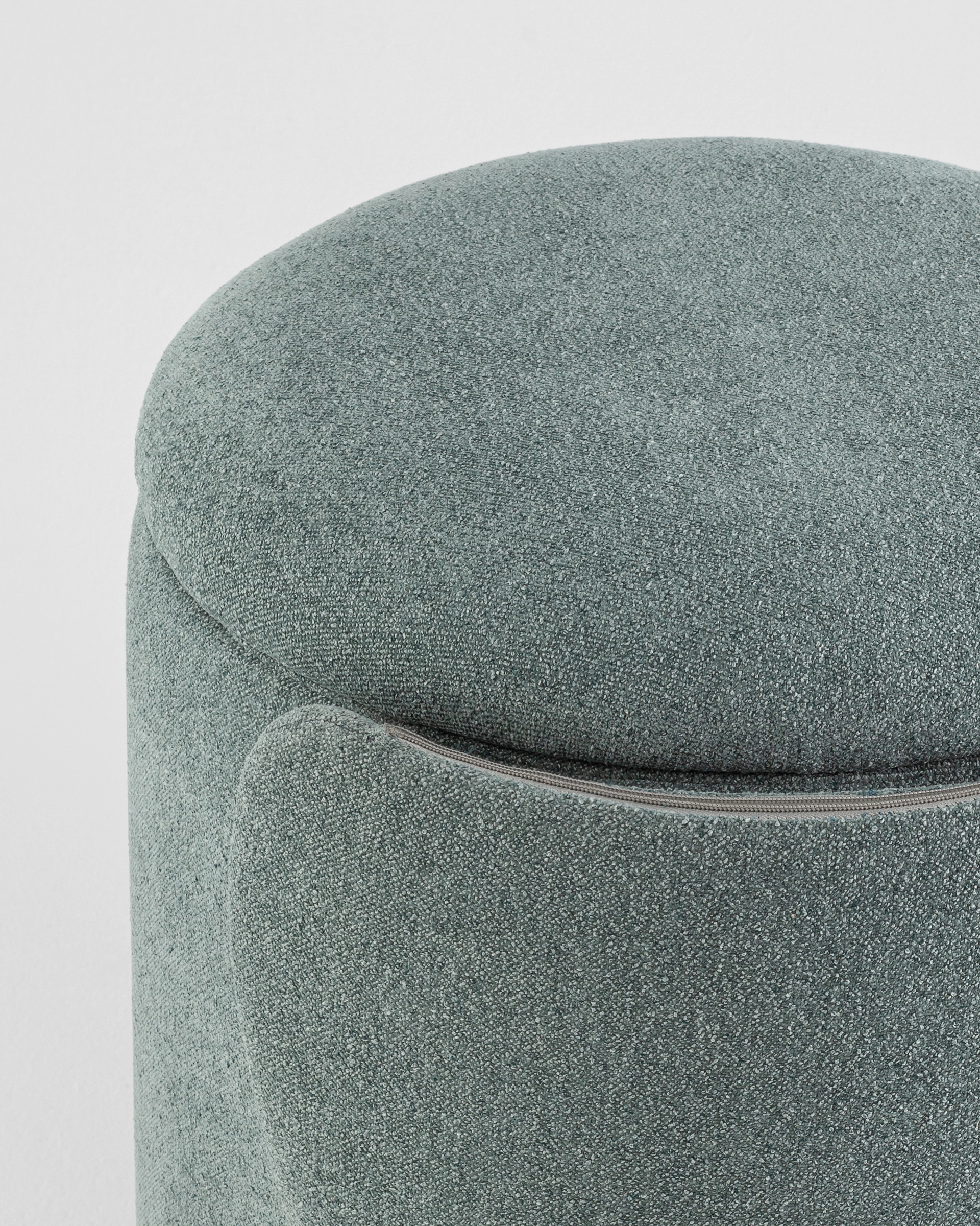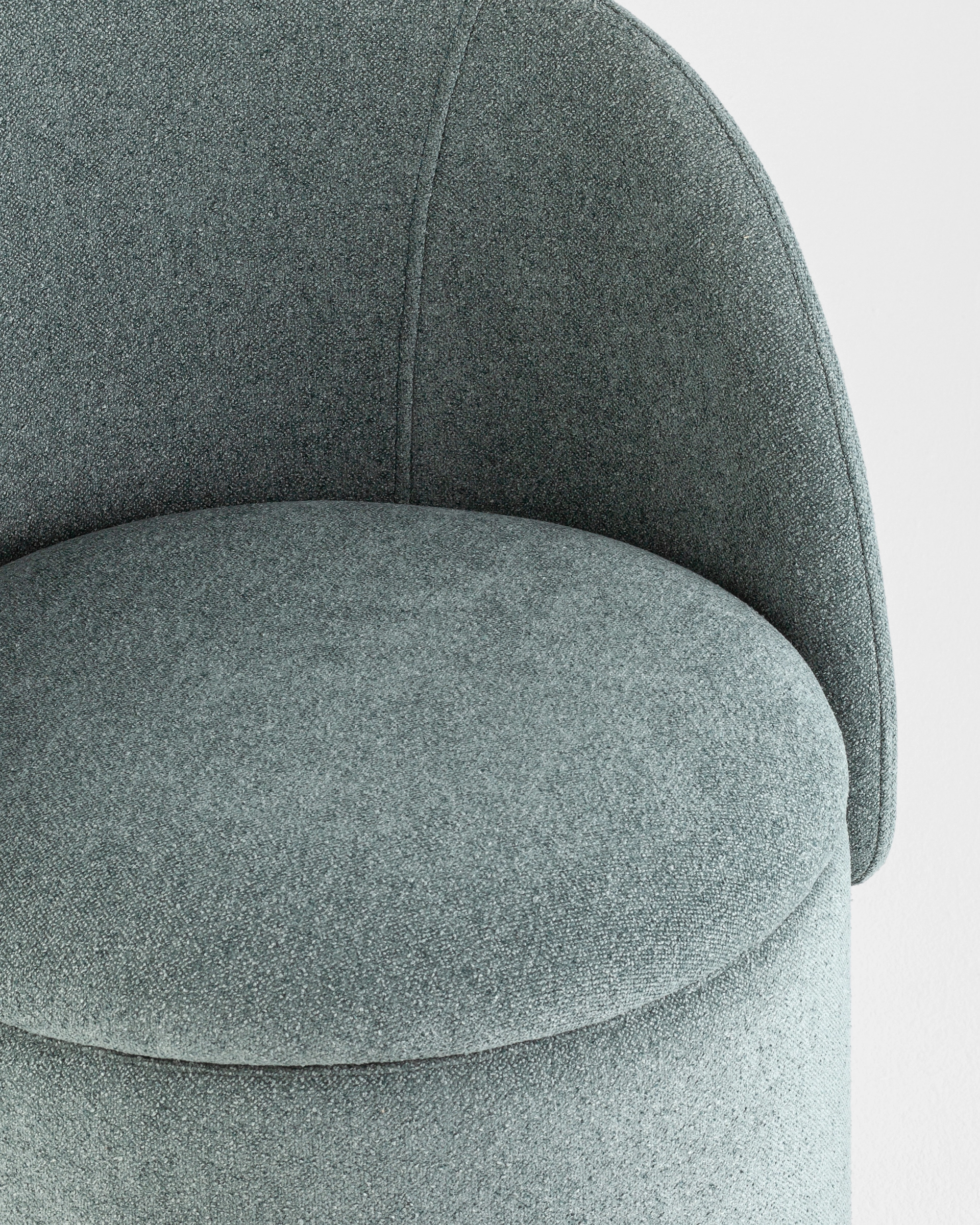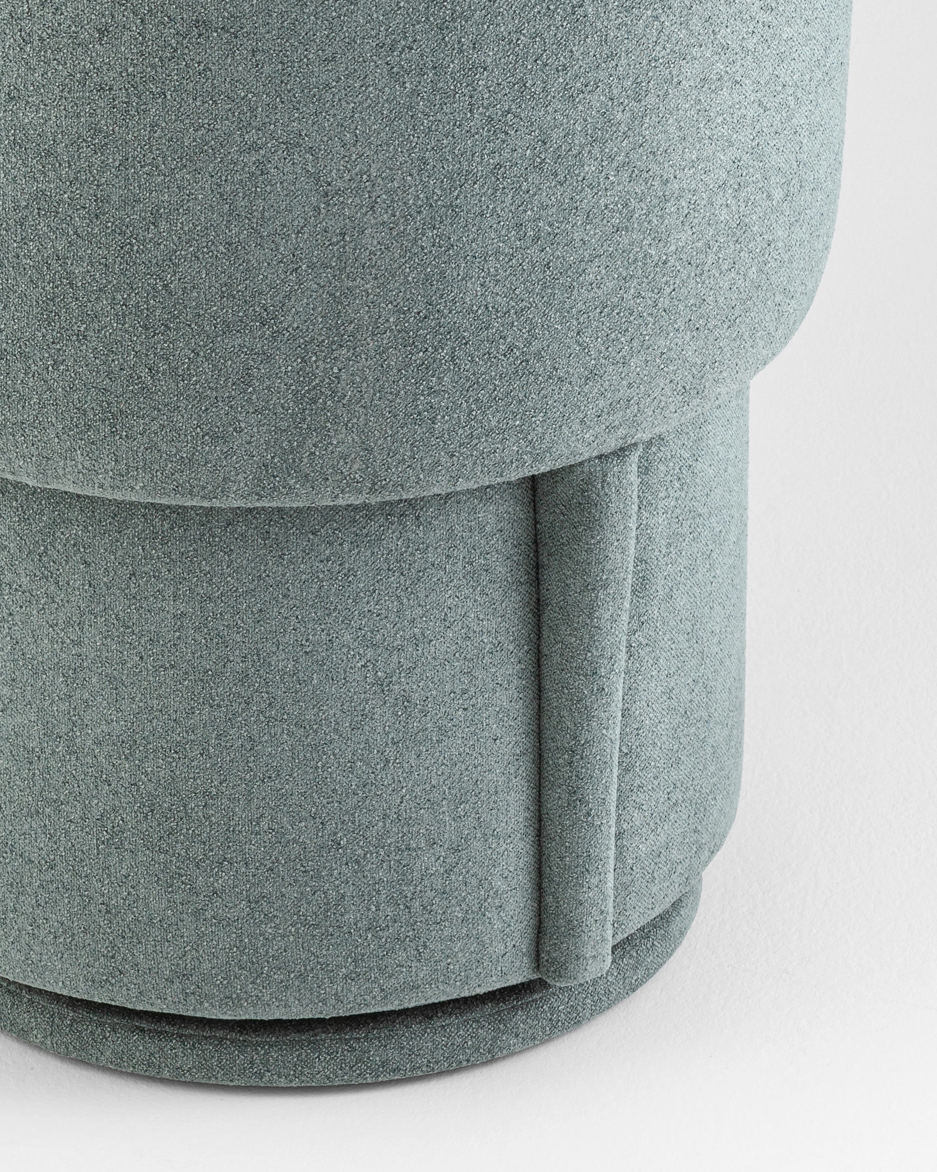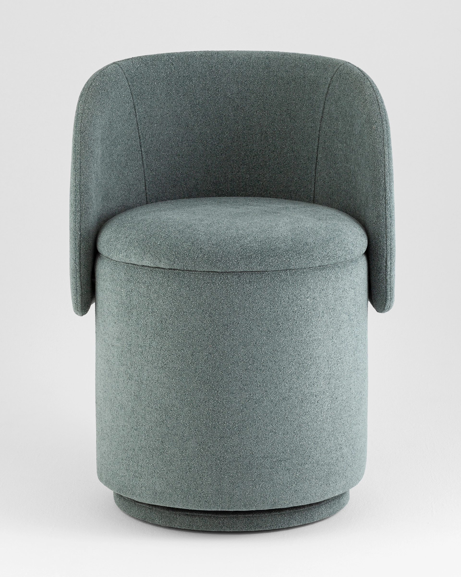 Сиденье наполнено эластичным ППУ, обеспечивающим удобную посадку. Пуф оснащён спинкой, которую при необходимости можно опустить, превратив изделие в полноценный пуф. Модель вращается вокруг своей оси на 360° — чтобы изменить направление, достаточно оттолкнуться ногами. Дополнительным плюсом станет встроенный ящик для хранения — внутри легко разместить плед, книги или другие мелочи.
