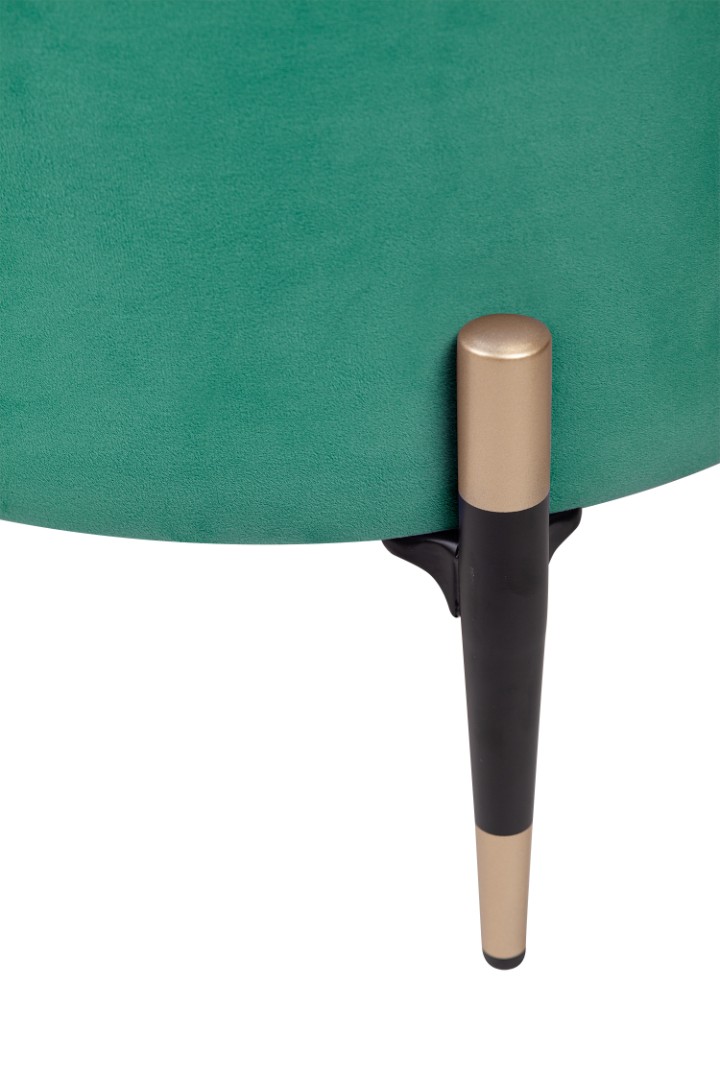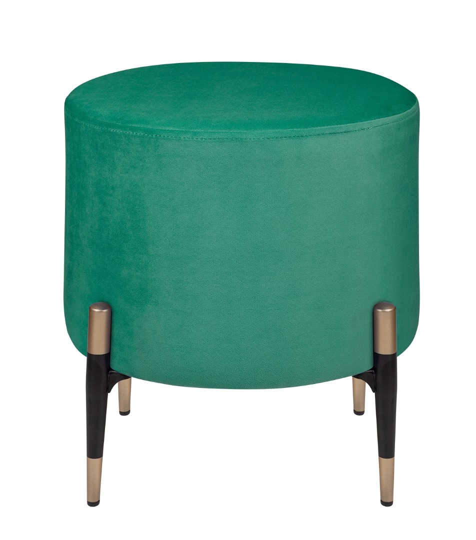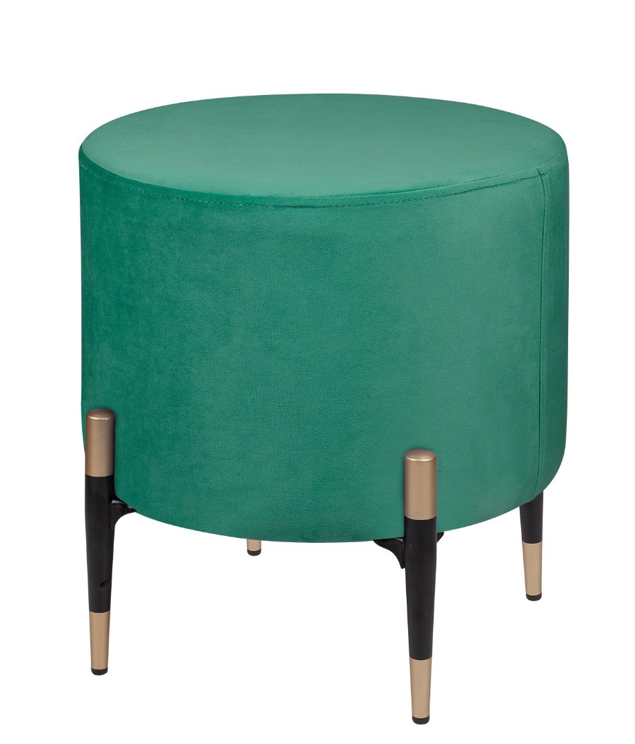 Круглый розовый пуф Lutor из мягкого велюра зеленого цвета. Особого внимания заслуживают ножки: изящные, конусовидные, чёрные — с деликатной золотой окантовкой внизу. Именно эта деталь создаёт элегантный контраст с нежно-розовой обивкой и придаёт пуфу законченный, дизайнерский вид. Легко впишется в любой интерьер.