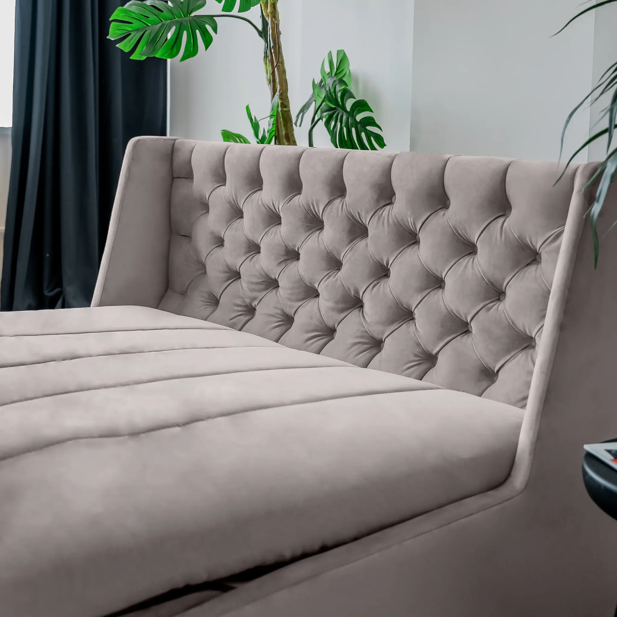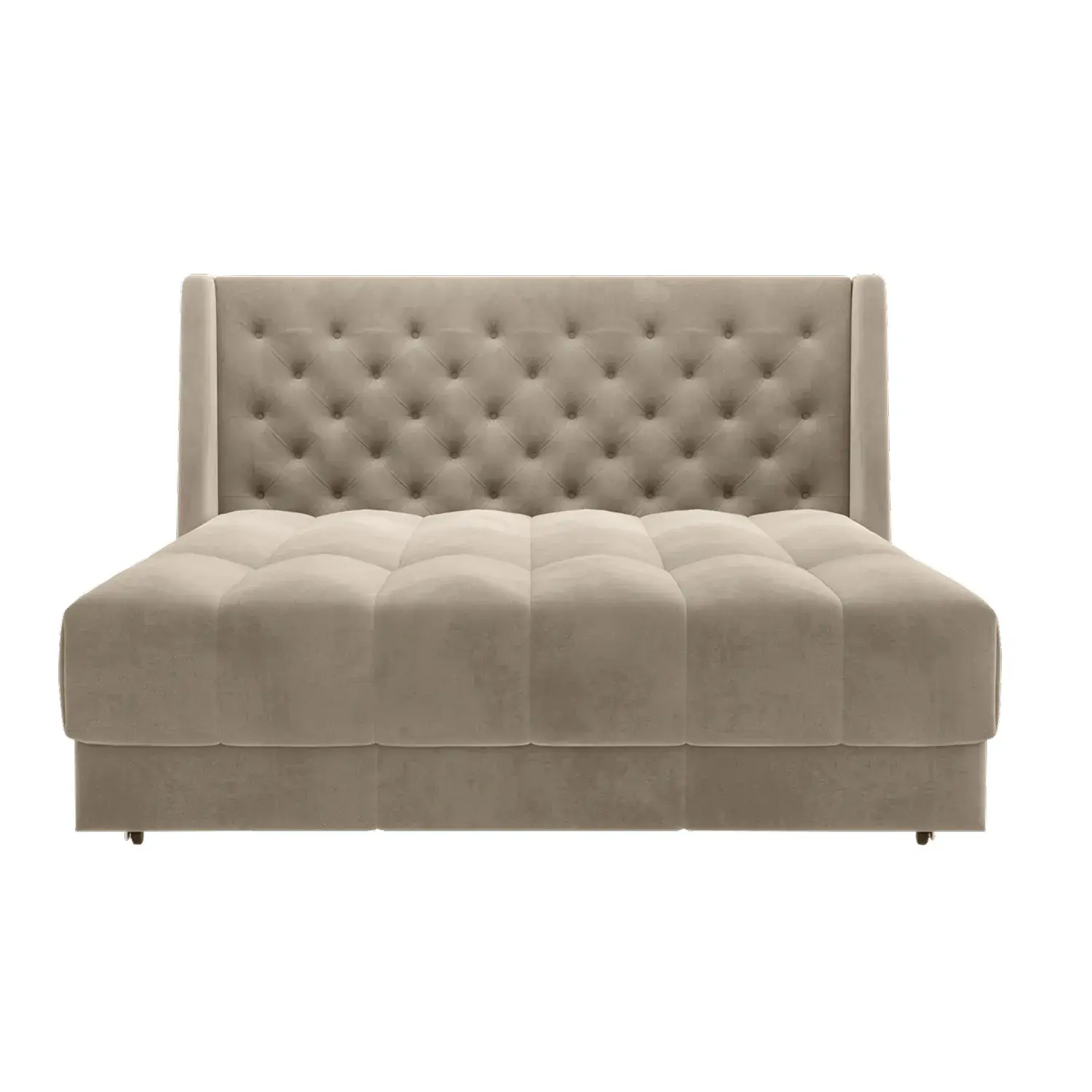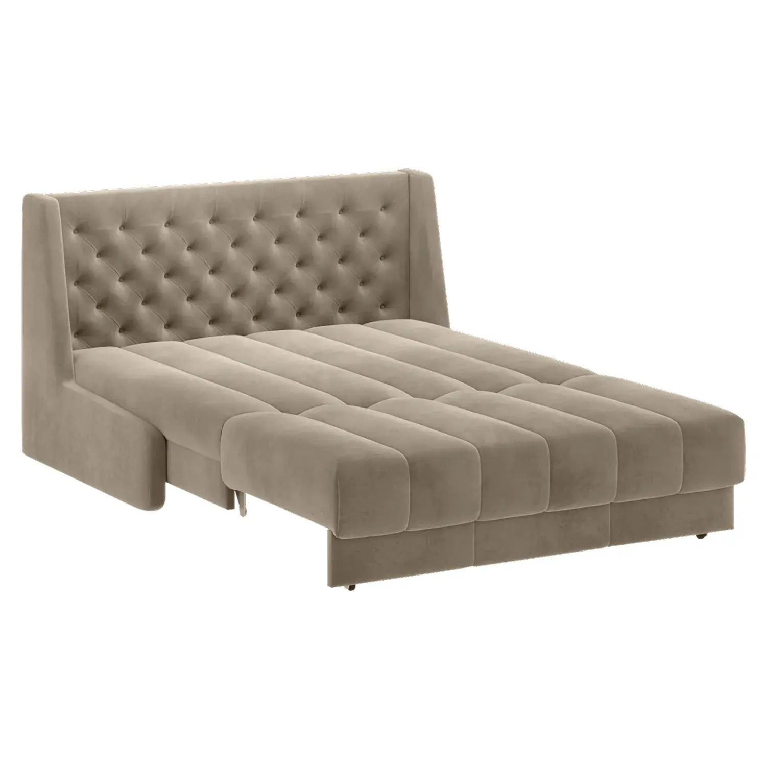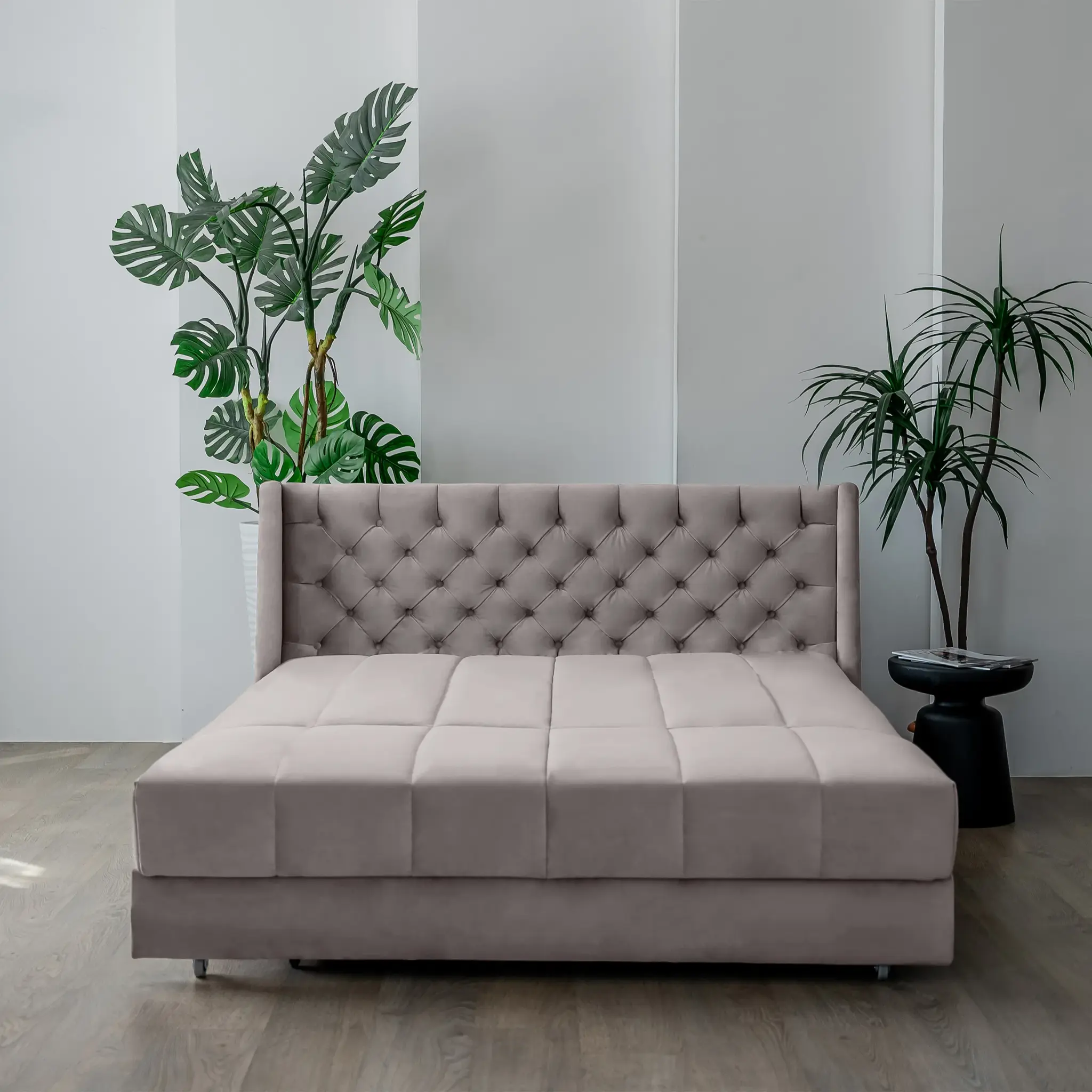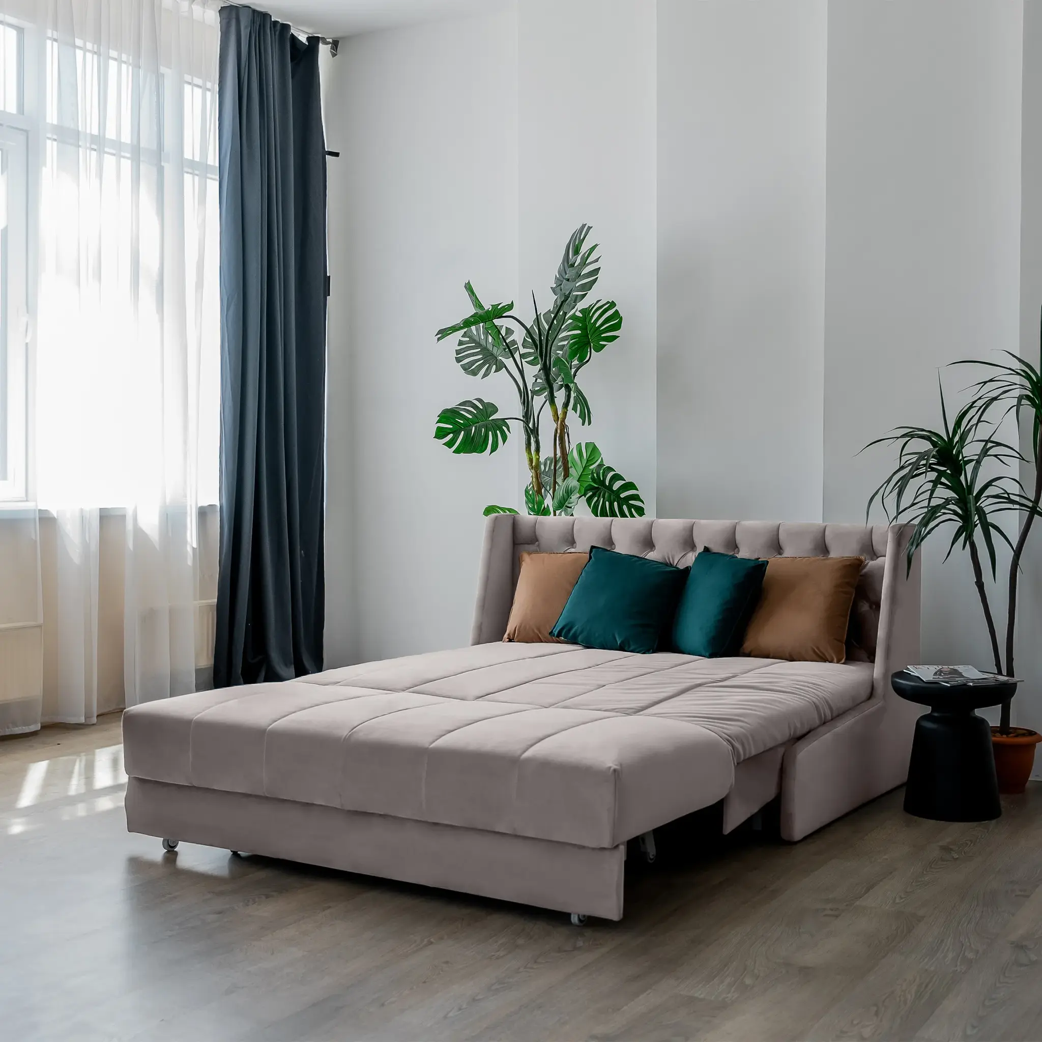 Эстетика дизайна. Высокая спинка с каретной стяжкой делает складную кровать стильной деталью интерьера. А спинка в основной ткани позволяет использовать её для зонирования пространства.