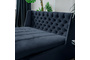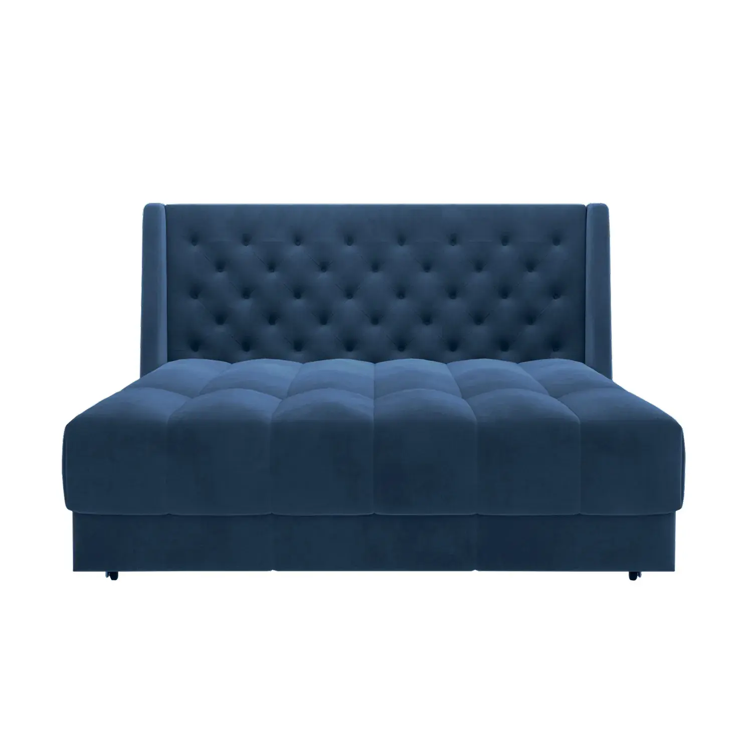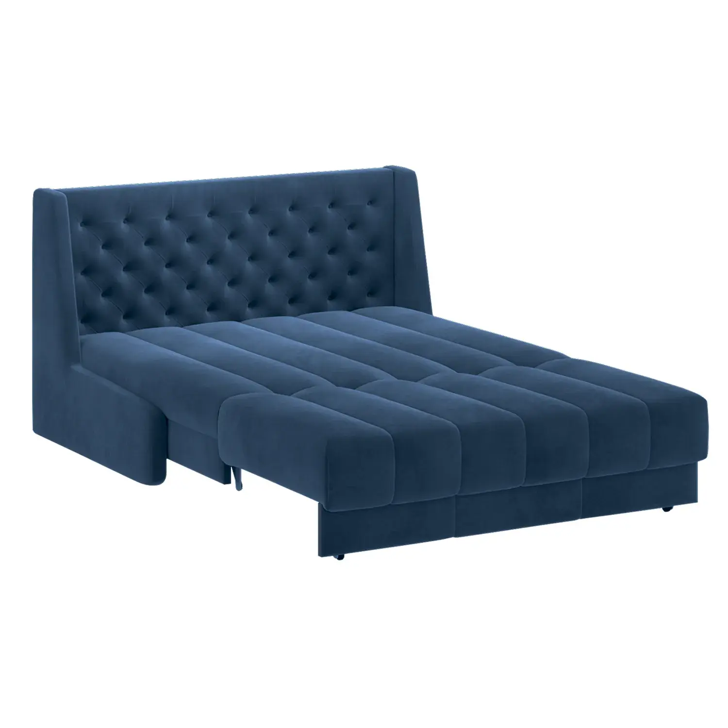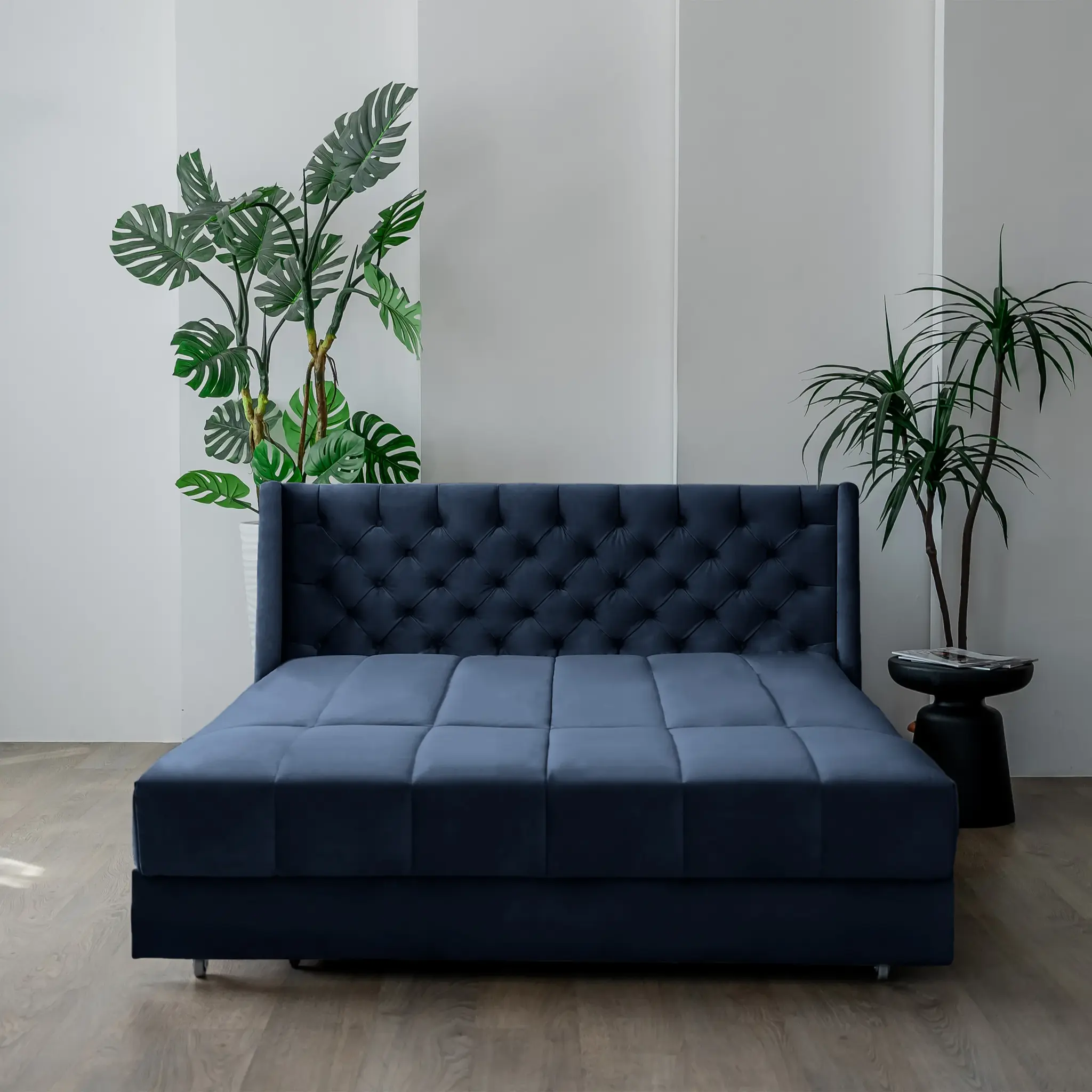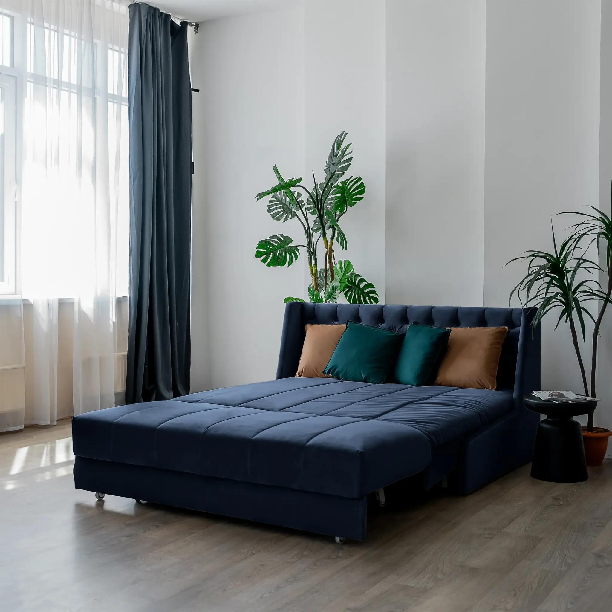 Эстетика дизайна. Высокая спинка с каретной стяжкой делает складную кровать стильной деталью интерьера. А спинка в основной ткани позволяет использовать её для зонирования пространства.