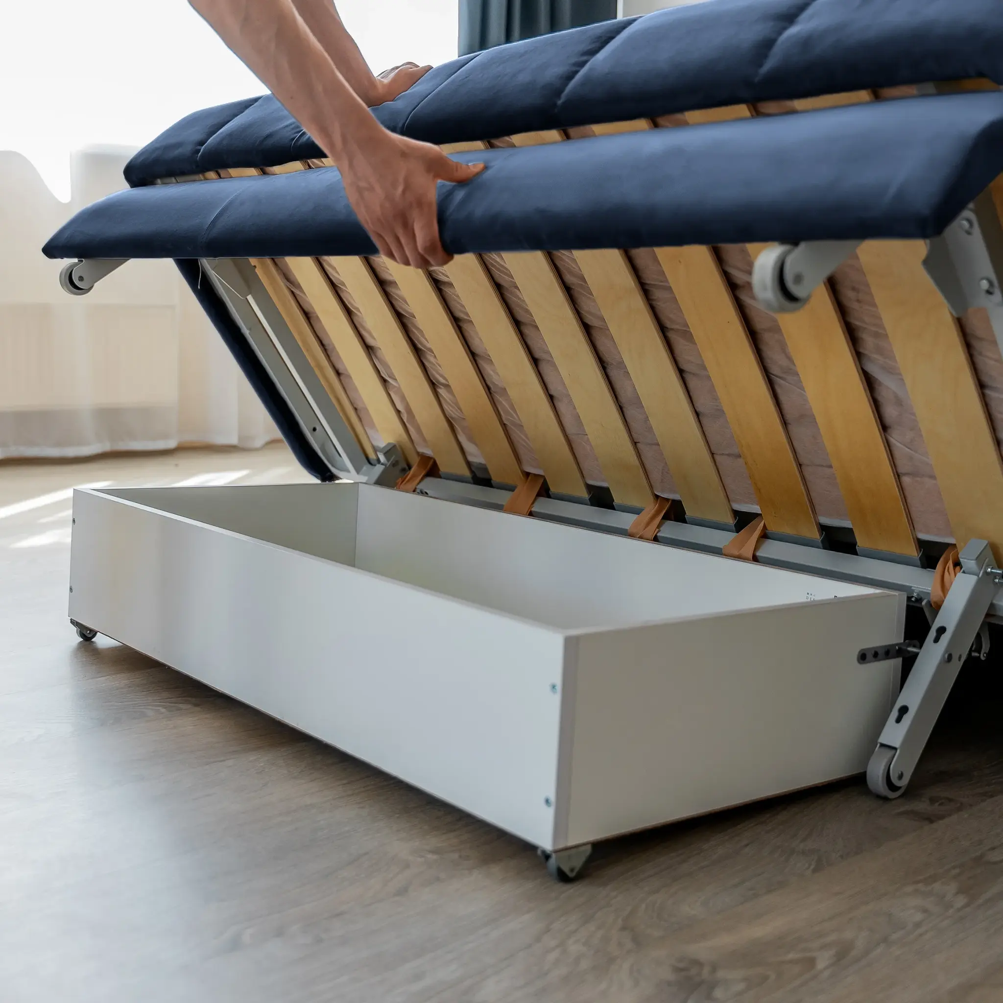 Лёгкая трансформация. Чтобы сложить кровать, достаточно поднять основание до щелчка и задвинуть механизм. Раскладывание происходит одним лёгким движением. Лёгкость обеспечивают прорезиненные колёсики и специальный механизм аккордеонного типа.