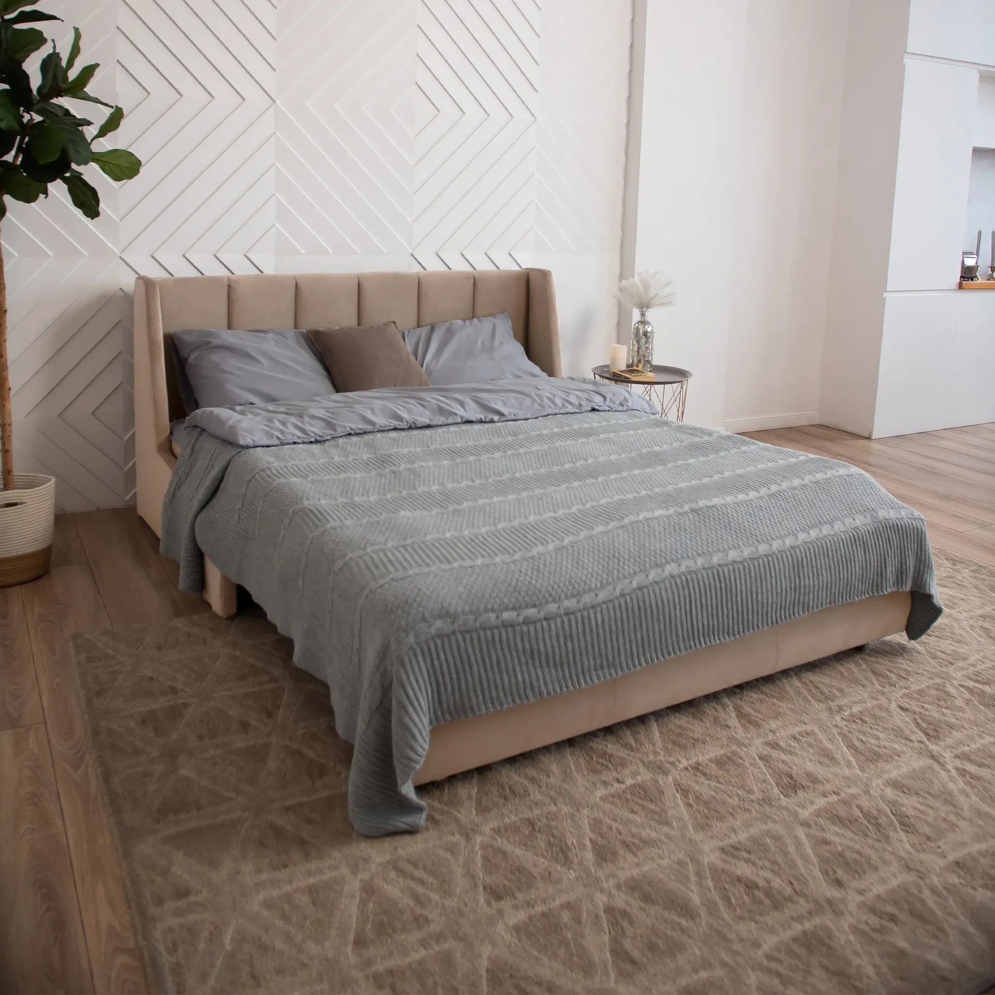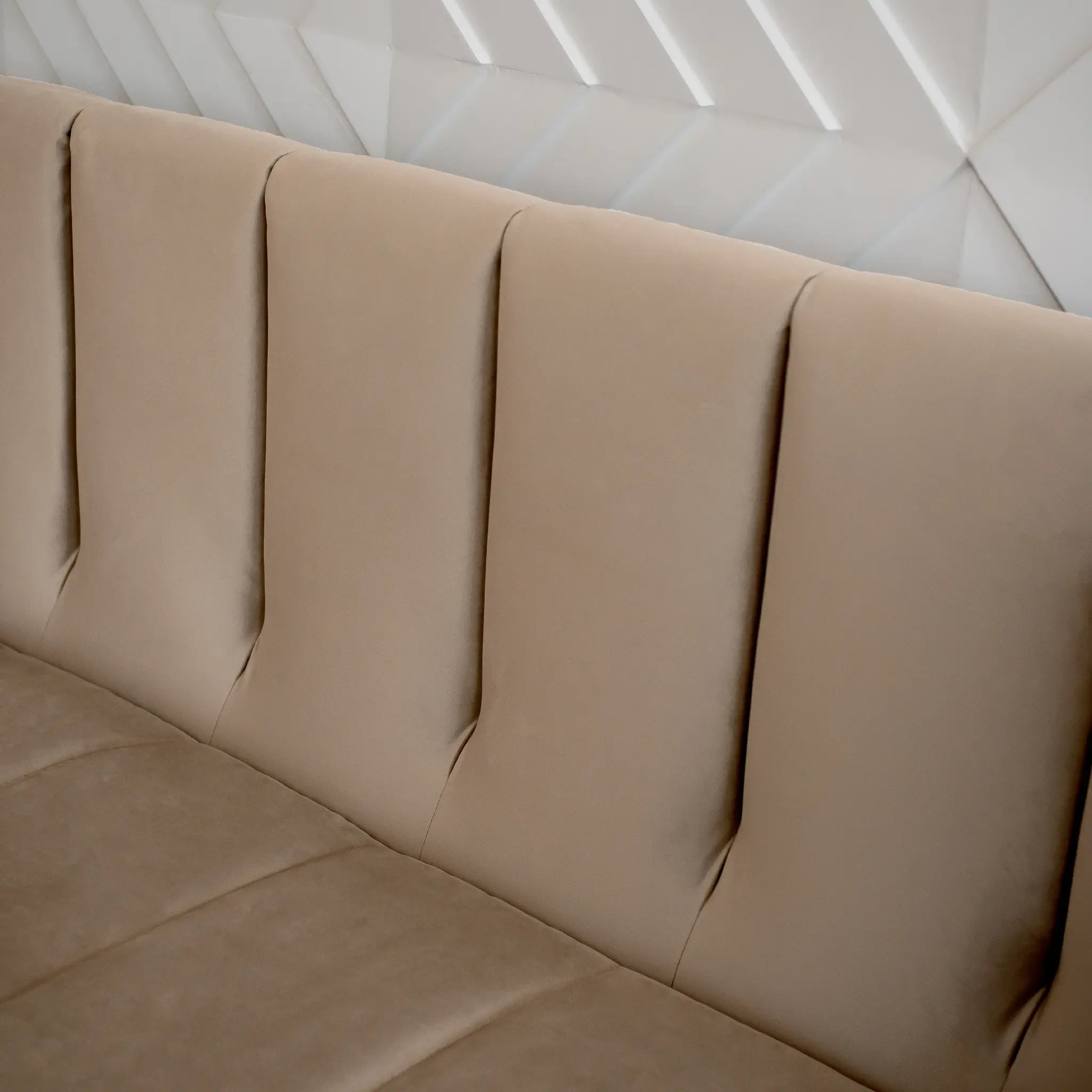 Эстетика дизайна. Высокая спинка с вертикальными утяжками делает складную кровать стильной деталью интерьера. А спинка в основной ткани позволяет использовать её для зонирования пространства.
