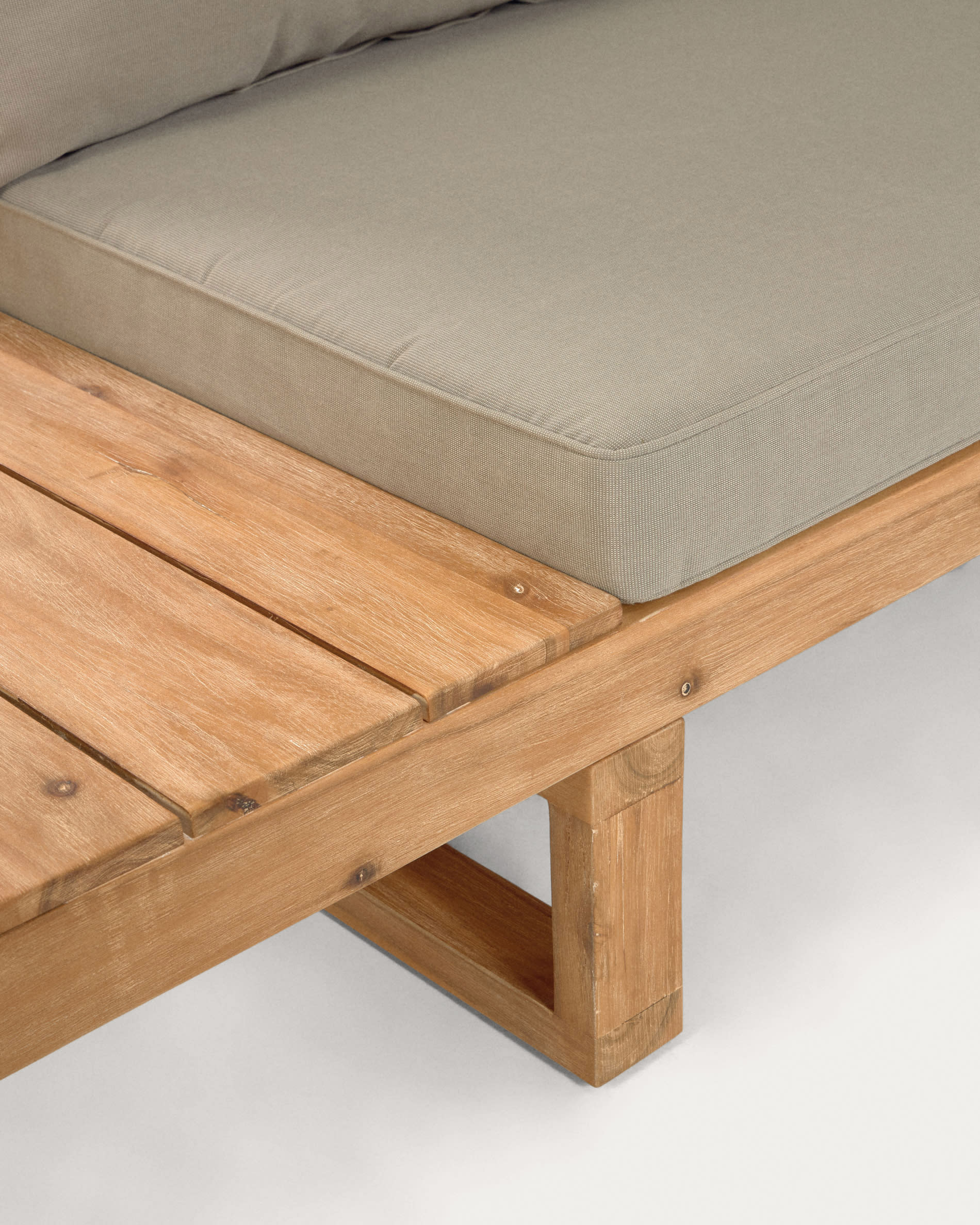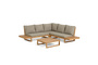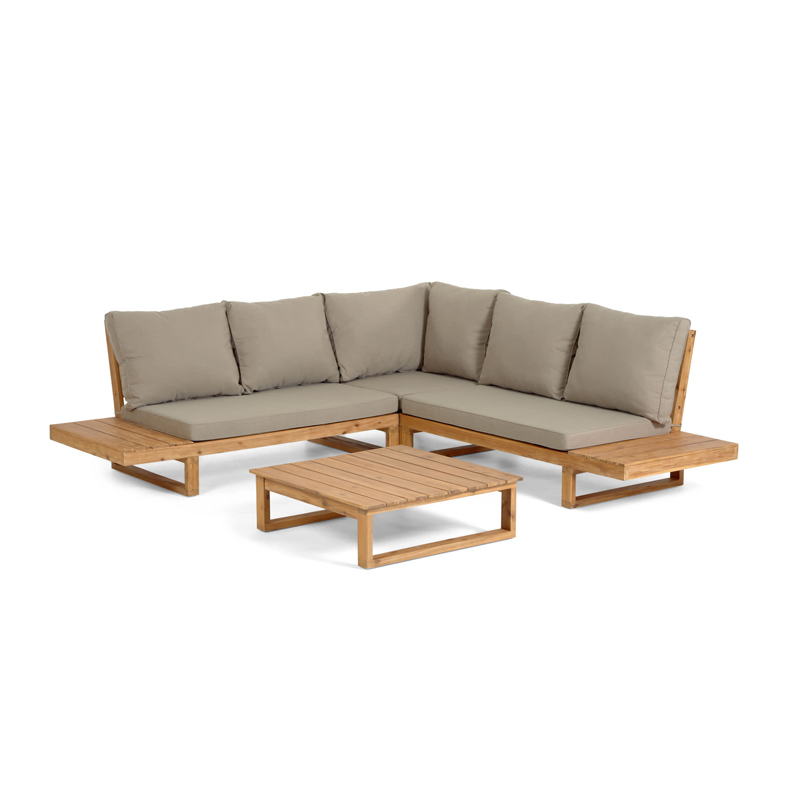 Угловой диван Flaviina вместе со столом – это комплексное решение для обустройства вашего уличного интерьера. Набор уникален тем, что создан из натуральной древесины. Она подготовлена к уличной эксплуатации также, как и подушки. Они безупречны в своем виде и легко чистятся благодаря съемным чехлам. Подарите себе лакшери отдых на террасе.