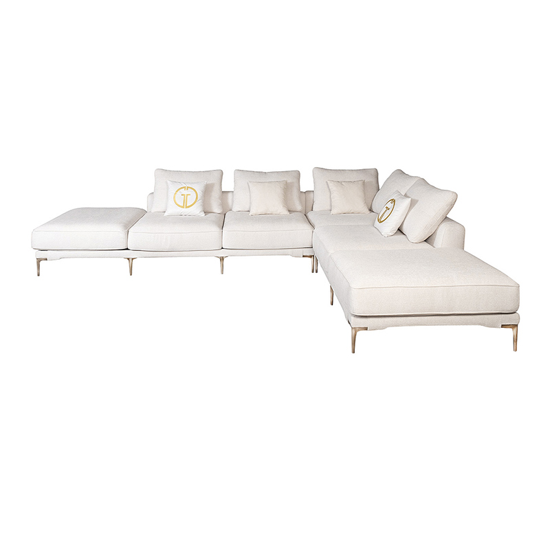 Запросить индивидуальное предложениеКомплект мебели №51 модульный Диван Tesoro (левый угол). В состав комплекта входит: модуль прямой DO+P-1шт, модуль угловой правый DR+P- 1шт. Комплект выполнен в ткани из коллекции Garda Decor- шенилл Mobi Ecru. В состав комплекта входят декоративные подушки: 45*45см в ткани Atmosphera 010-2шт, 45*45см в ткани Atmosphera 000-2шт с вышивкой эмблема GD в цвет золото. Металлические опоры 18см, цвет бронза. Габариты комплекта: ширина- 2900мм, глубина-3800мм, высота- 900мм. Глубина сиденья- 750мм, высота посадочного места- 440мм.