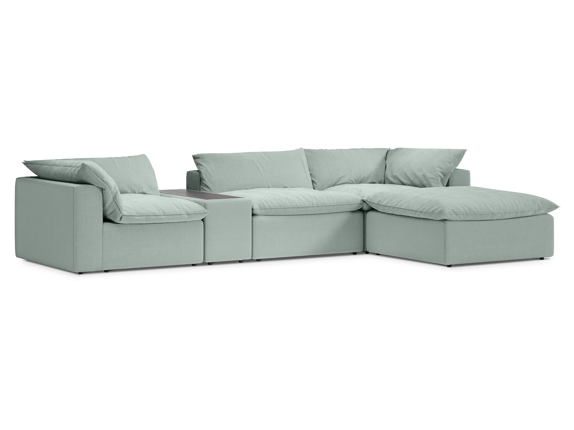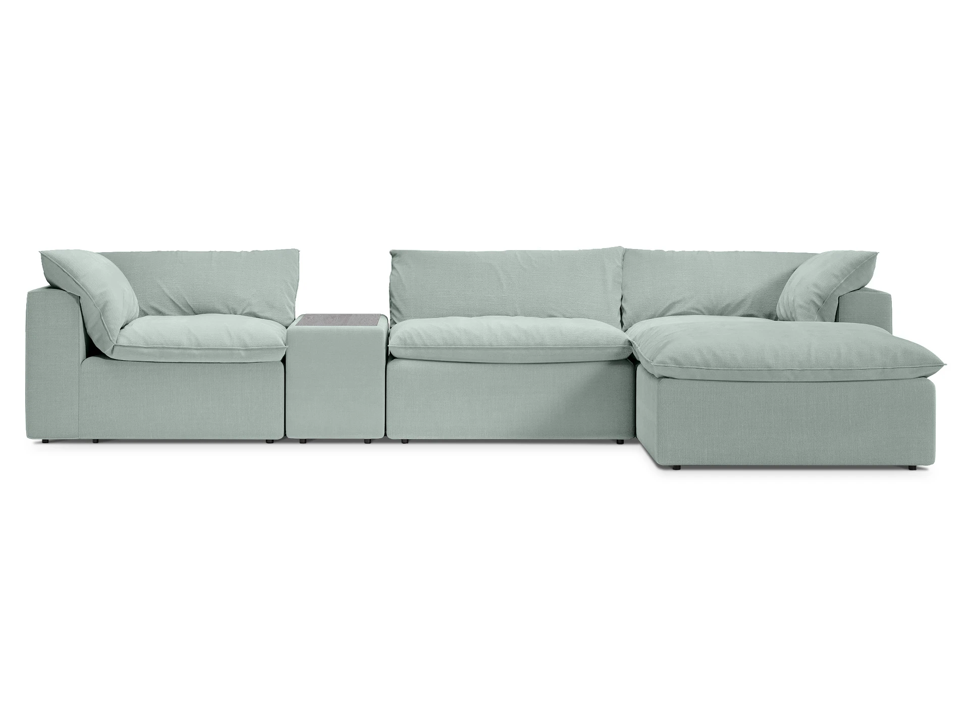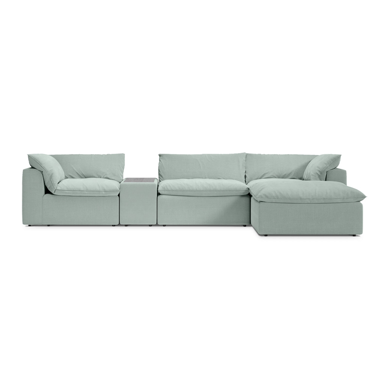 Каркас модулей монолитный, подлокотники не съемные. Каждый модуль комплектуется индивидуальной покровной подушкой, зафиксированной на карабины. Сидение дивана корпуса мягкое, дополнительную мягкость изделию придают верхние покровные мягкие перьевые подушки.