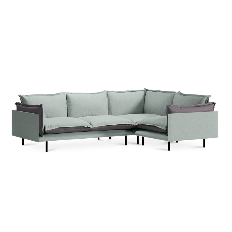 Угол и завершение дивана могут находиться справа или слева. Модули соединяются друг с другом с помощью металлических зацепов.