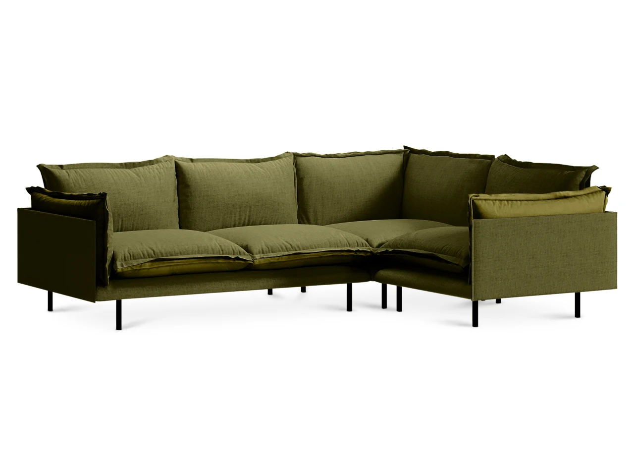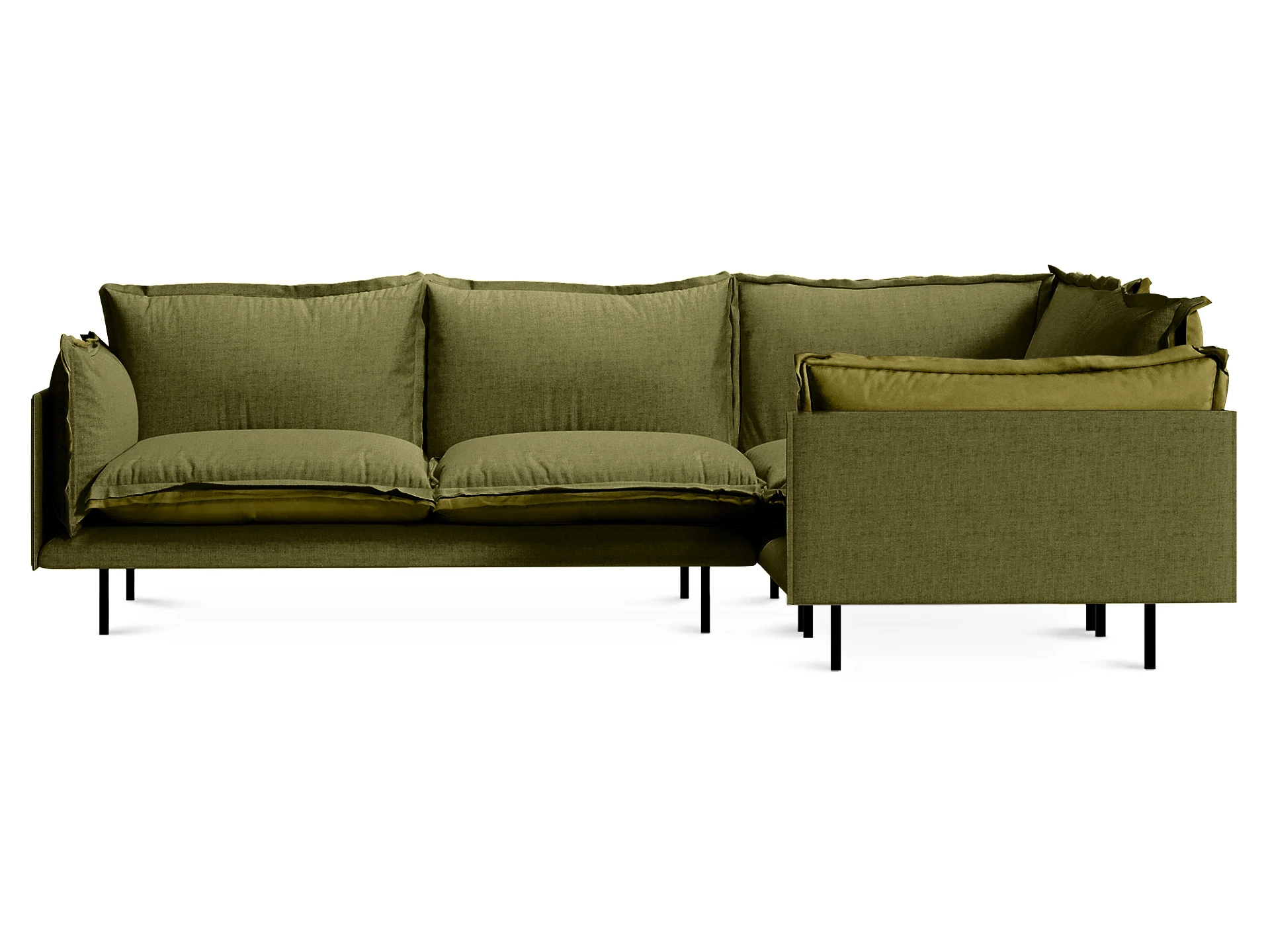 Металлические опоры высотой 175 мм окрашены черной матовой эмалью. Они не только визуально делают конструкцию легче, но и позволяют легко поддерживать порядок под диваном. Ножки снабжены защитными подпятниками.