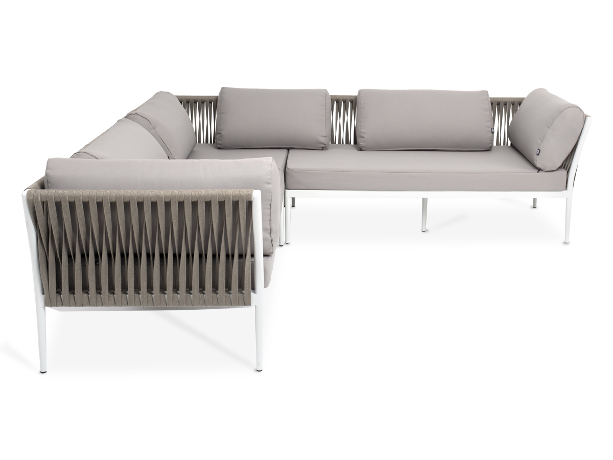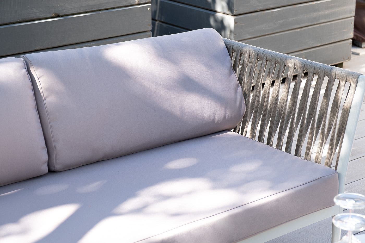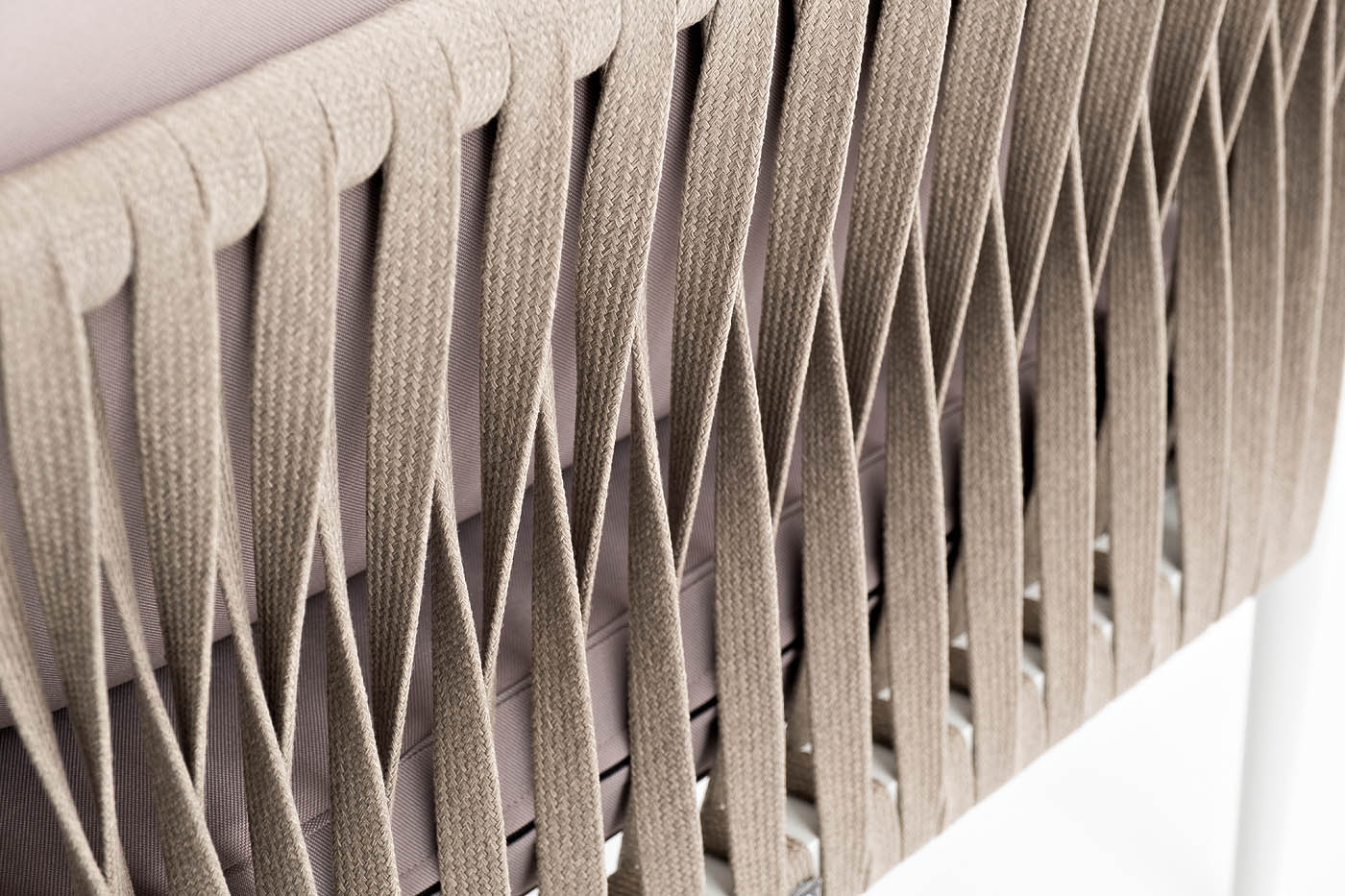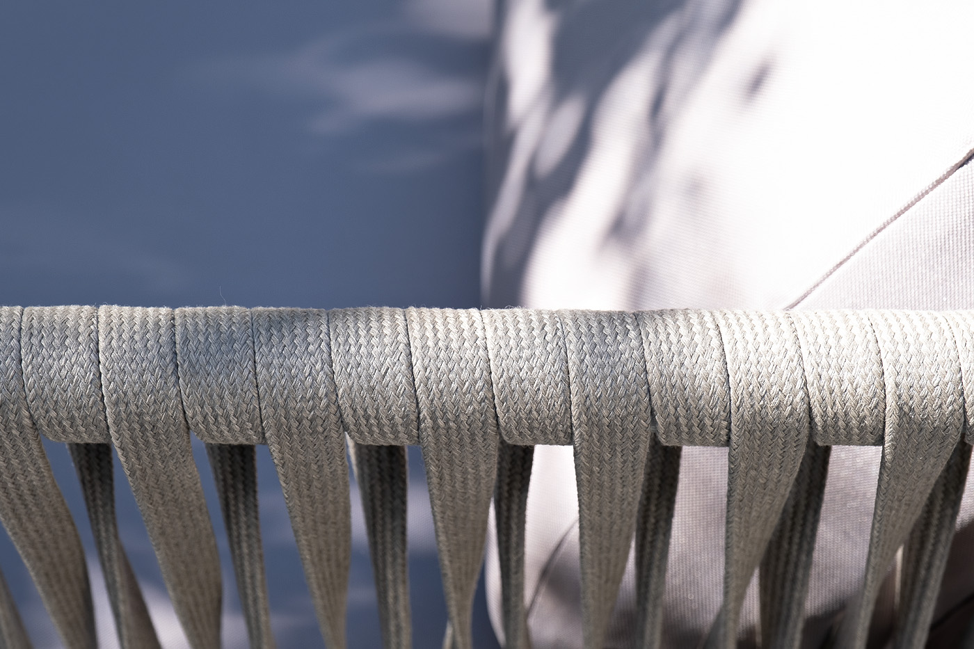 Диван имеет алюминиевый каркас, окрашенный порошковой краской в светло-серый (RAL7035) цвет. Боковины каркаса вручную оплетены плоским роупом - эластичными синтетическими лентами, изготовленными из высокопрочных полиэфирных волокон. Цвет оплетки - серо-коричневый.