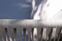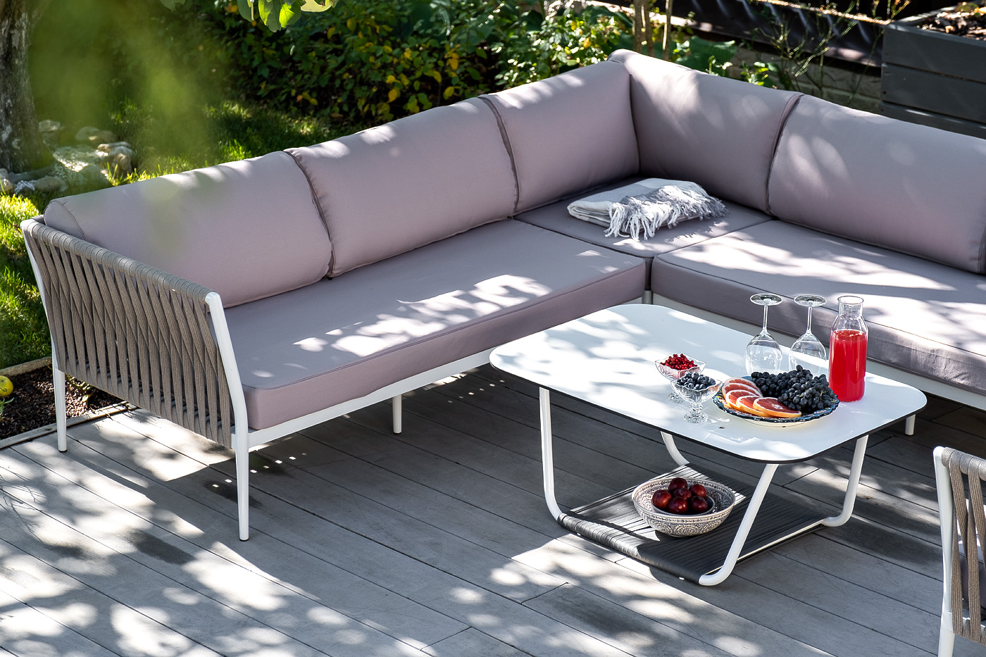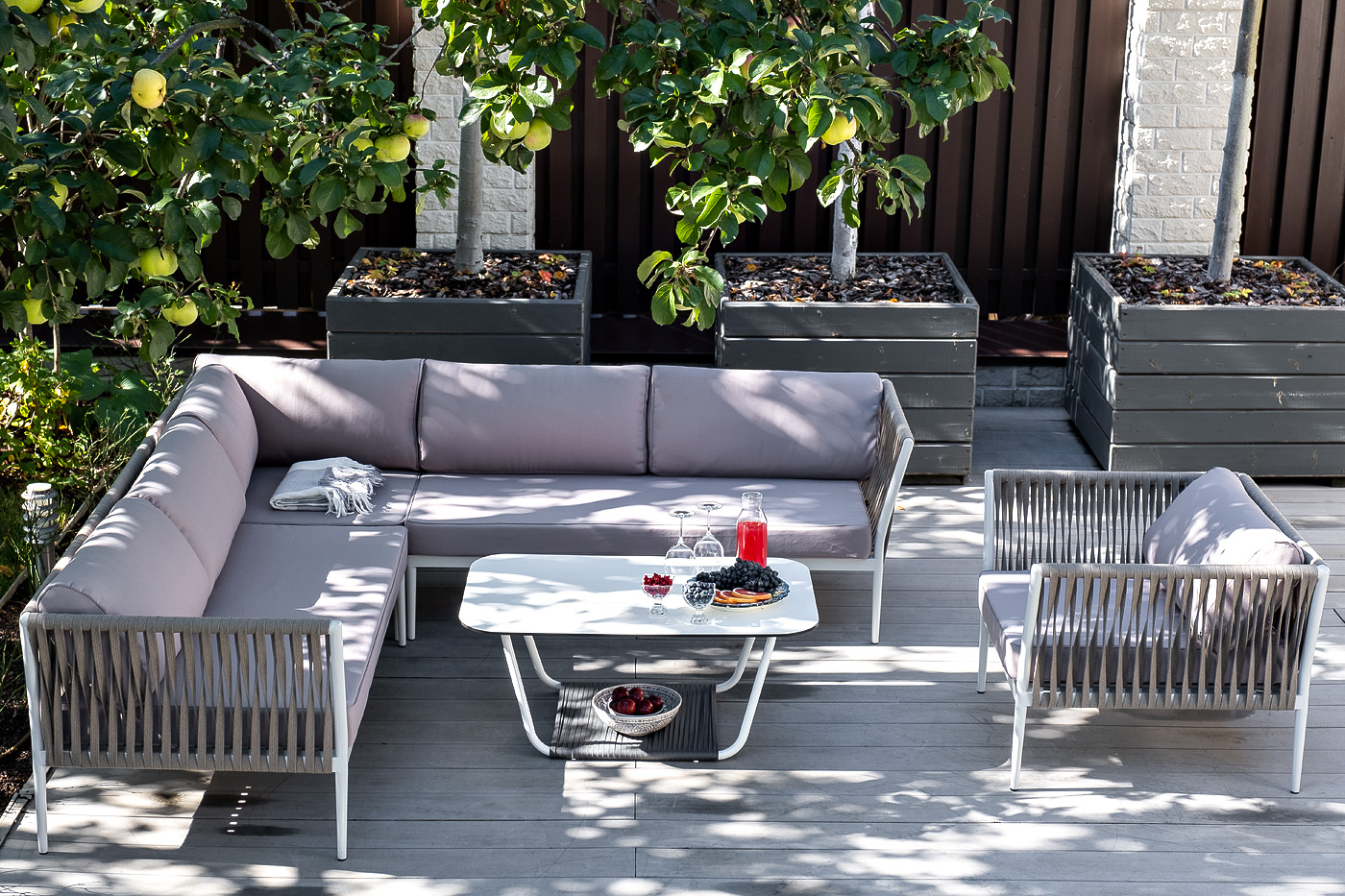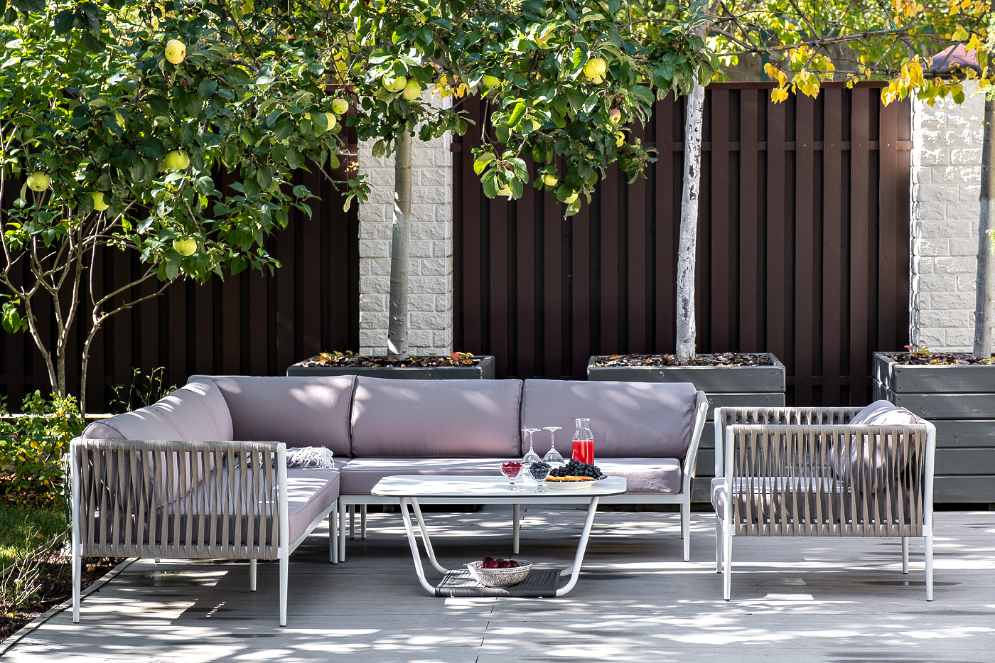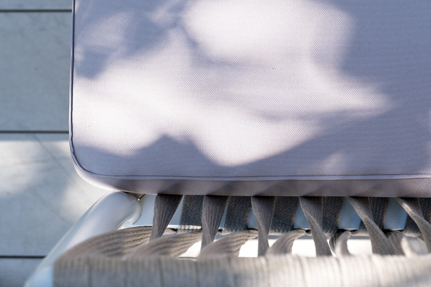 Диван имеет алюминиевый каркас, окрашенный порошковой краской в светло-серый (RAL7035) цвет. Боковины каркаса вручную оплетены плоским роупом - эластичными синтетическими лентами, изготовленными из высокопрочных полиэфирных волокон. Цвет оплетки - серо-коричневый.