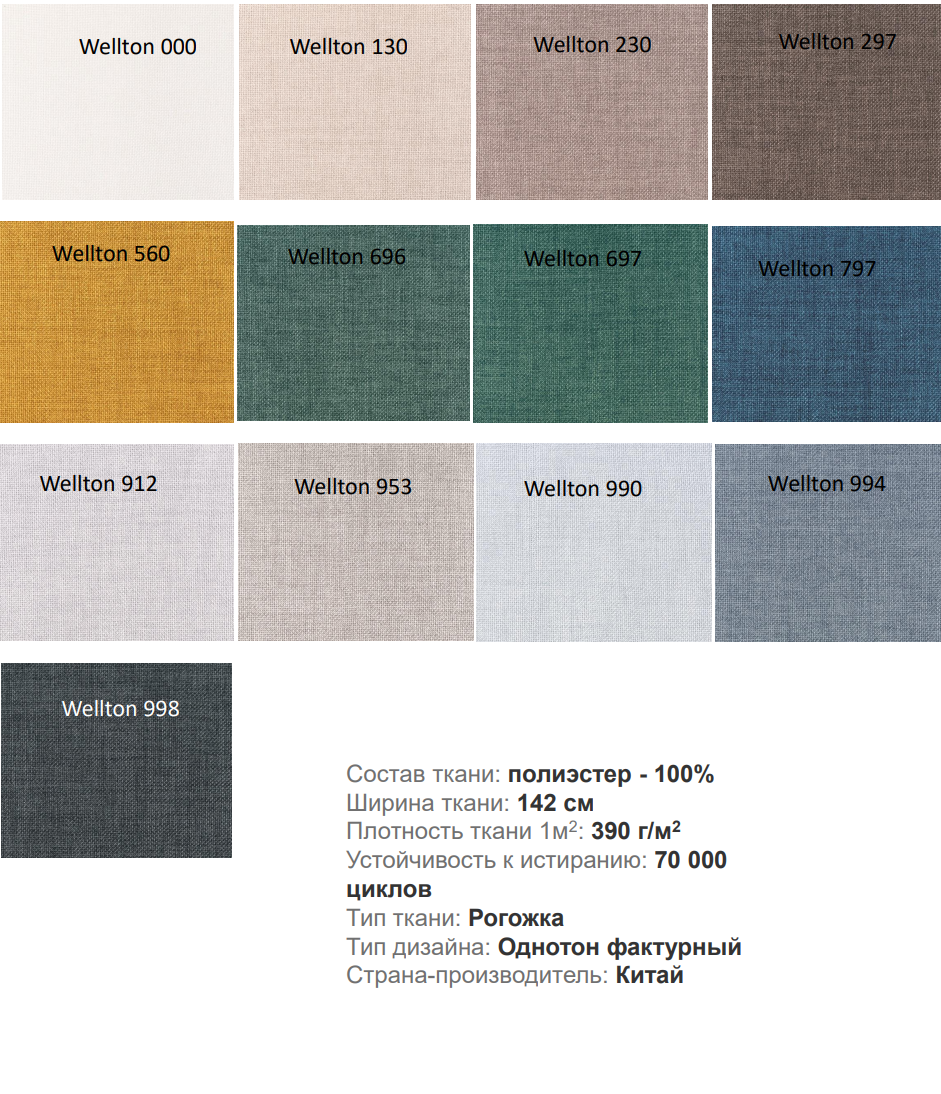 Диван исполнен в рогожке «Wellton», которая имеет хорошую плотность и легко моется, износоустойчивость более 70000 циклов по Мартиндейлу.