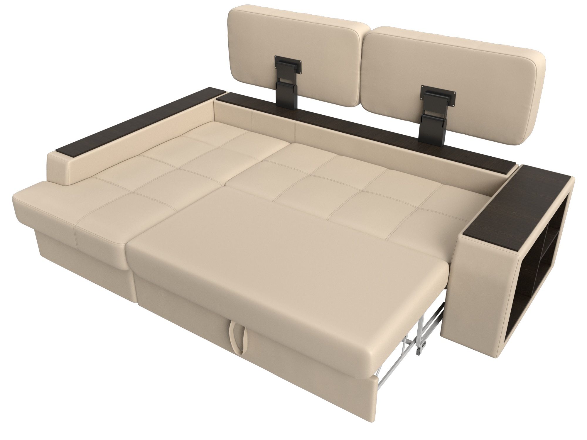 Запросить индивидуальное предложениеШикарный угловой диван Брюссель удобен и функционален в использовании. Подлокотники выполняют роль мини-столиков. Одна из боковин дополнена книжными полками, декорированным «под дерево». Под длинной боковиной расположена ниша для белья. Изделие оснащено удобным механизмом трансформации в двуспальную кровать.