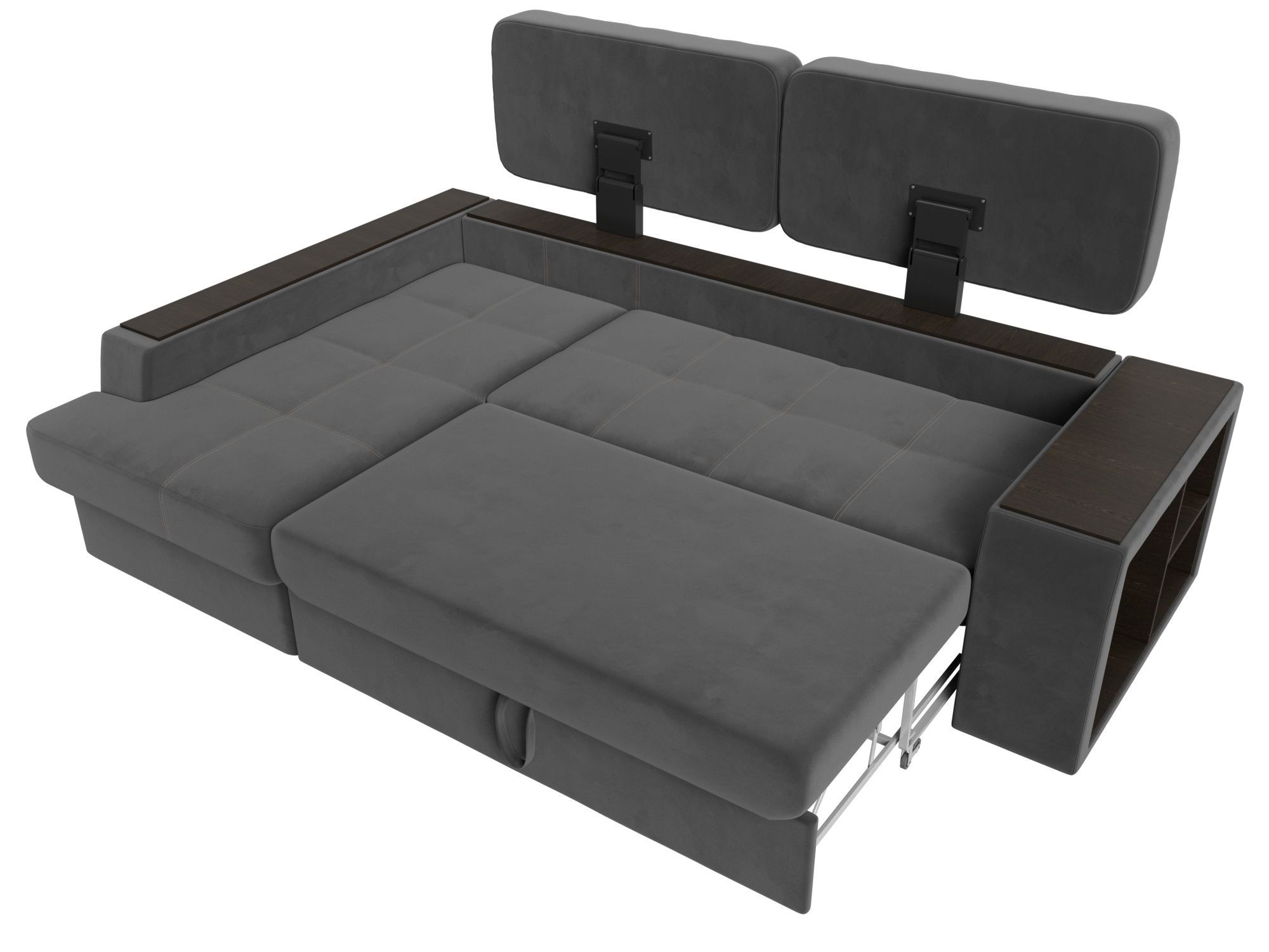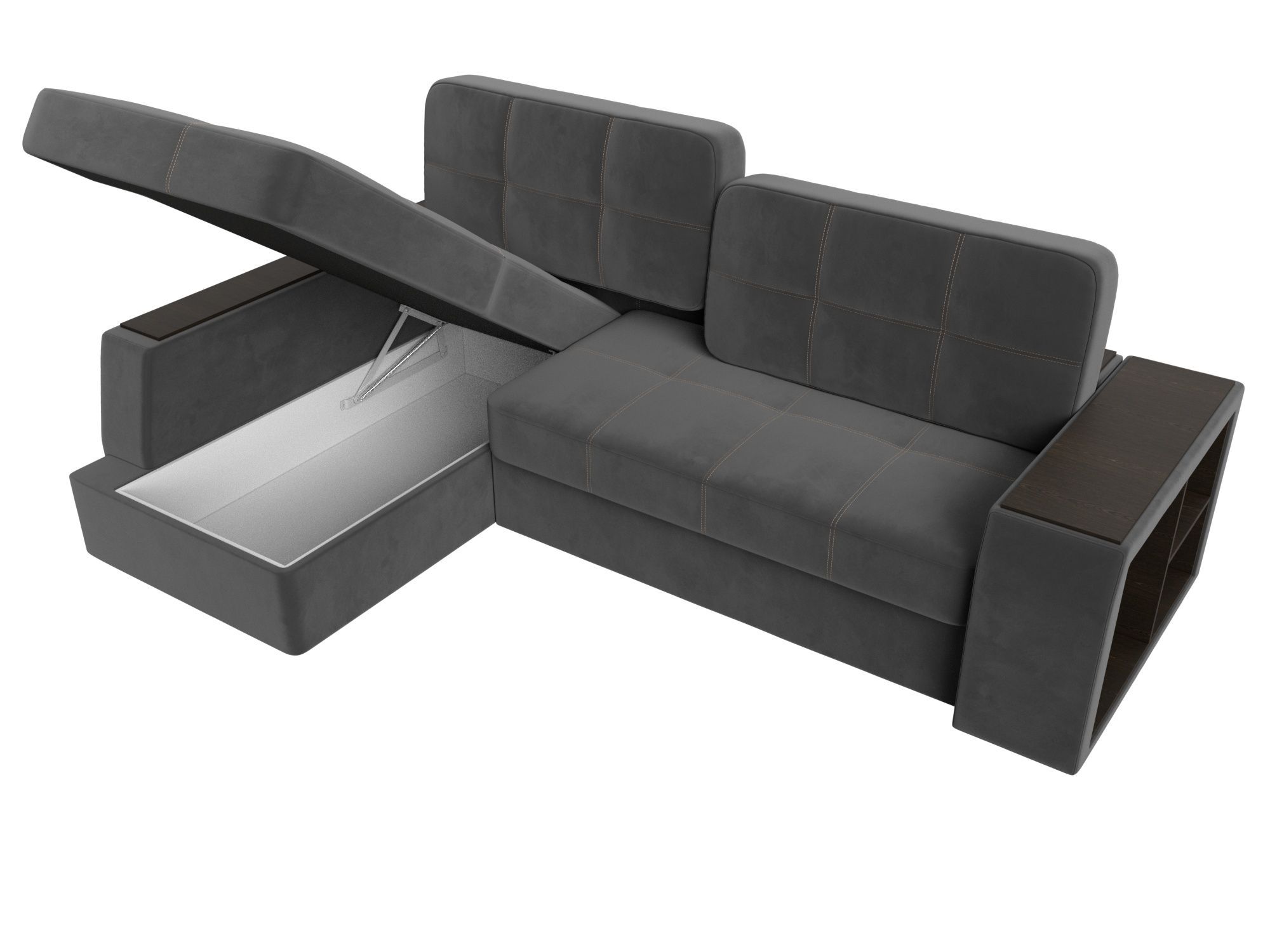 Запросить индивидуальное предложениеШикарный угловой диван Брюссель удобен и функционален в использовании. Подлокотники выполняют роль мини-столиков. Одна из боковин дополнена книжными полками, декорированным «под дерево». Под длинной боковиной расположена ниша для белья. Изделие оснащено удобным механизмом трансформации в двуспальную кровать.