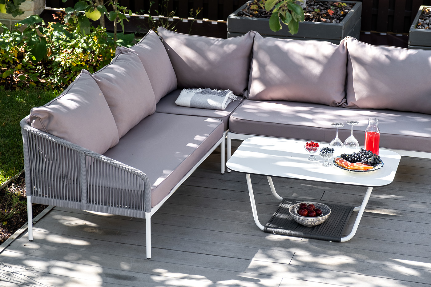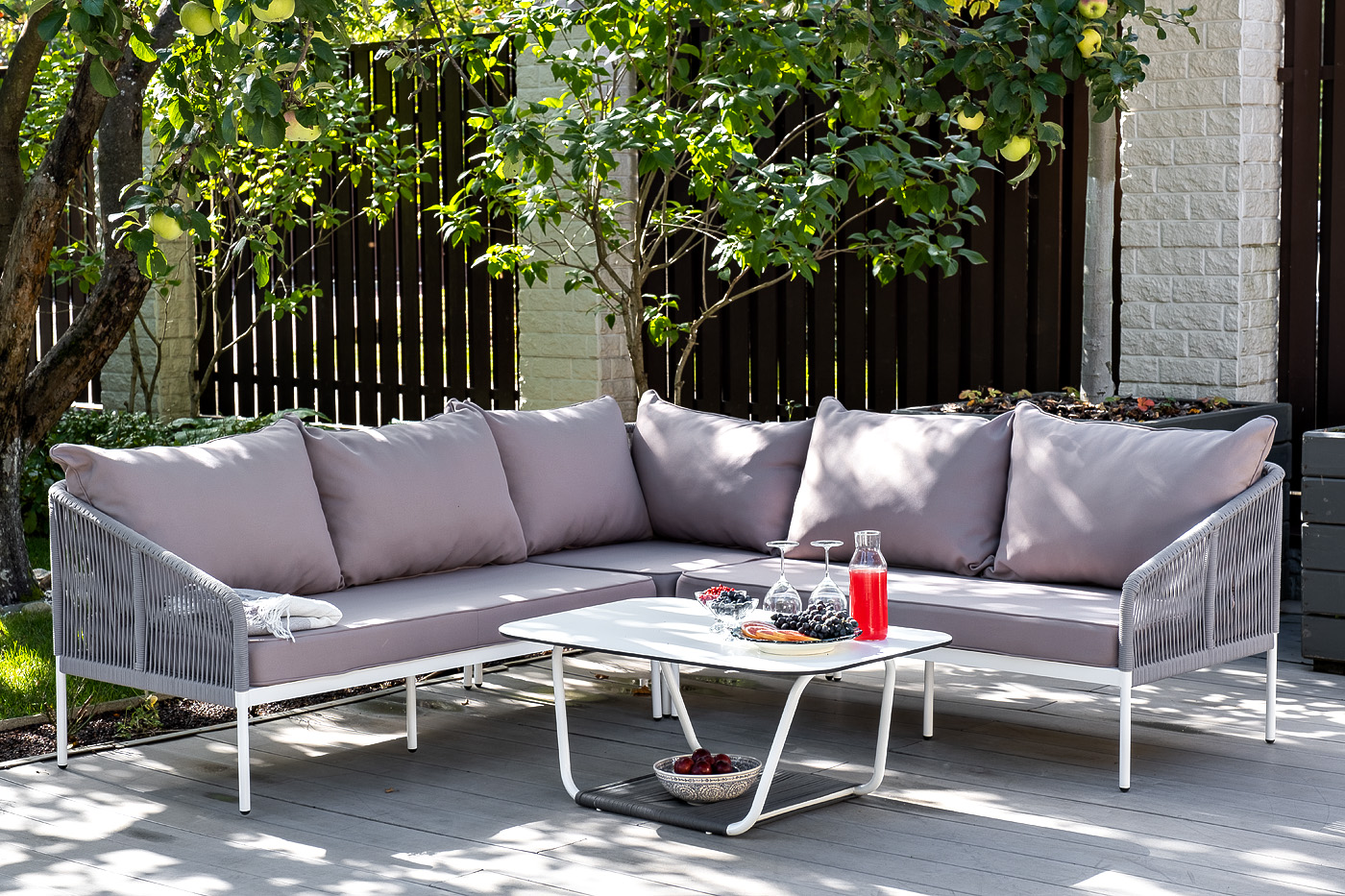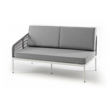 "Канны" правый модуль плетеный из роупа, каркас алюминий светло-серый (RAL7035) шагрень, роуп серый круглый, ткань серая 017