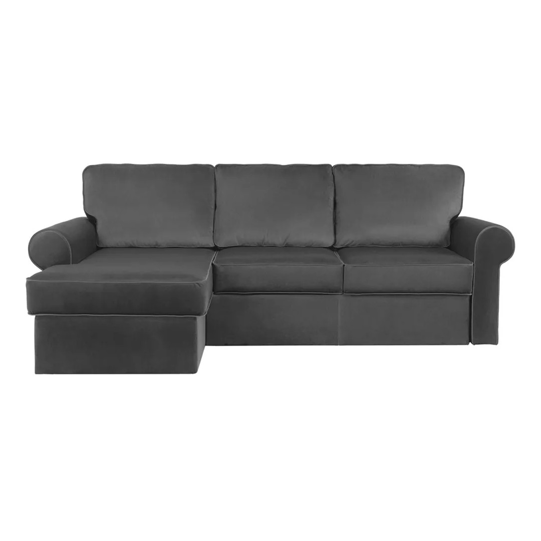 Угловой диван-кровать с оттоманкой и ёмкостью для хранения. Выразительный дизайн в английском стиле. Комфортабельная модель, которая станет местом притяжения в любом помещении. Оттоманка может располагаться как с правой, так и с левой стороны. Угол расположения определяется в момент заказа. Механизм преобразования — «дельфин». Превращение дивана в кровать происходит за счет выныривания одной части сиденья из-под другой. Складывается диван в обратном порядке — половина спального места опускается вниз и ныряет под сиденье основной секции. Механизм перемещается на пластиковых роликах и не царапает покрытие пола. Конструкция дивана надёжна, позволяет ежедневно выполнять трансформацию, не опасаясь за быстрый износ. ||Каркас дивана выполнен из бруса хвойных пород и высококачественной фанеры. Три объёмные подушки на спинке и на сиденье обеспечивают максимально комфортные ощущения. Завёрнутые наружу невысокие подлокотники удобны для отдыха, чтения. Диван отличает большая вместимость, упругая, в меру мягкая, поверхность. Прочная обивка из простроченного полиэстера придаёт объём и уютный вид. Благодаря конструкции, диван можно разместить как в углу комнаты, так и в центре. Возможно выбрать цвет и фактуру обивки, которая будет соответствовать вашим индивидуальным предпочтениям.