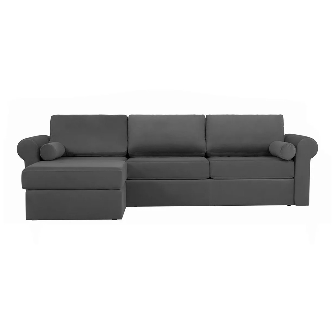 Линейка диванов «Peterhof» собирается из модулей, как конструктор, и позволяет выбрать модель, которая будет отвечать вашим индивидуальным потребностям. Данная модель - угловой диван с оттоманкой и ёмкостью для хранения. Оттоманка может располагаться как с правой, так и с левой стороны. Угол расположения определяется в момент заказа. Наполнением подушек сиденья служит настил из нескольких слоев высокоэластичного пенополиуретана и синтепона. Посадочное место мягкое, глубокое. Наполнитель подушек спинки - синтепух. Он идеально держит форму, гипоаллергенный, не впитывает влагу и запахи. Подушки имеют внутренний чехол из спанбонда, прошитый в три отсека, чтобы наполнитель не скатывался и хорошо держал форму. Внешние чехлы подушек съёмные, на молнии, что позволяет их легко чистить. В модели гармонично соединились скандинавская сдержанность и функциональность. Диван «Peterhof» - идеальный вариант для современного стильного интерьера. Механизм трансформации - «Sedaflex». Это инновационный механизм, который рассчитан на ежедневное раскладывание дивана. Исключаются повреждения напольного покрытия во время складывания и раскладывания. Основание — латы и эластичные ремни, в комплект входит матрас толщиной 90 мм. Латы с помощью латодержателей крепятся на стальной контур, создавая латовую решётку. Она равномерно распределяет вес тела во время сна, создавая ортопедический эффект и повышенную комфортность