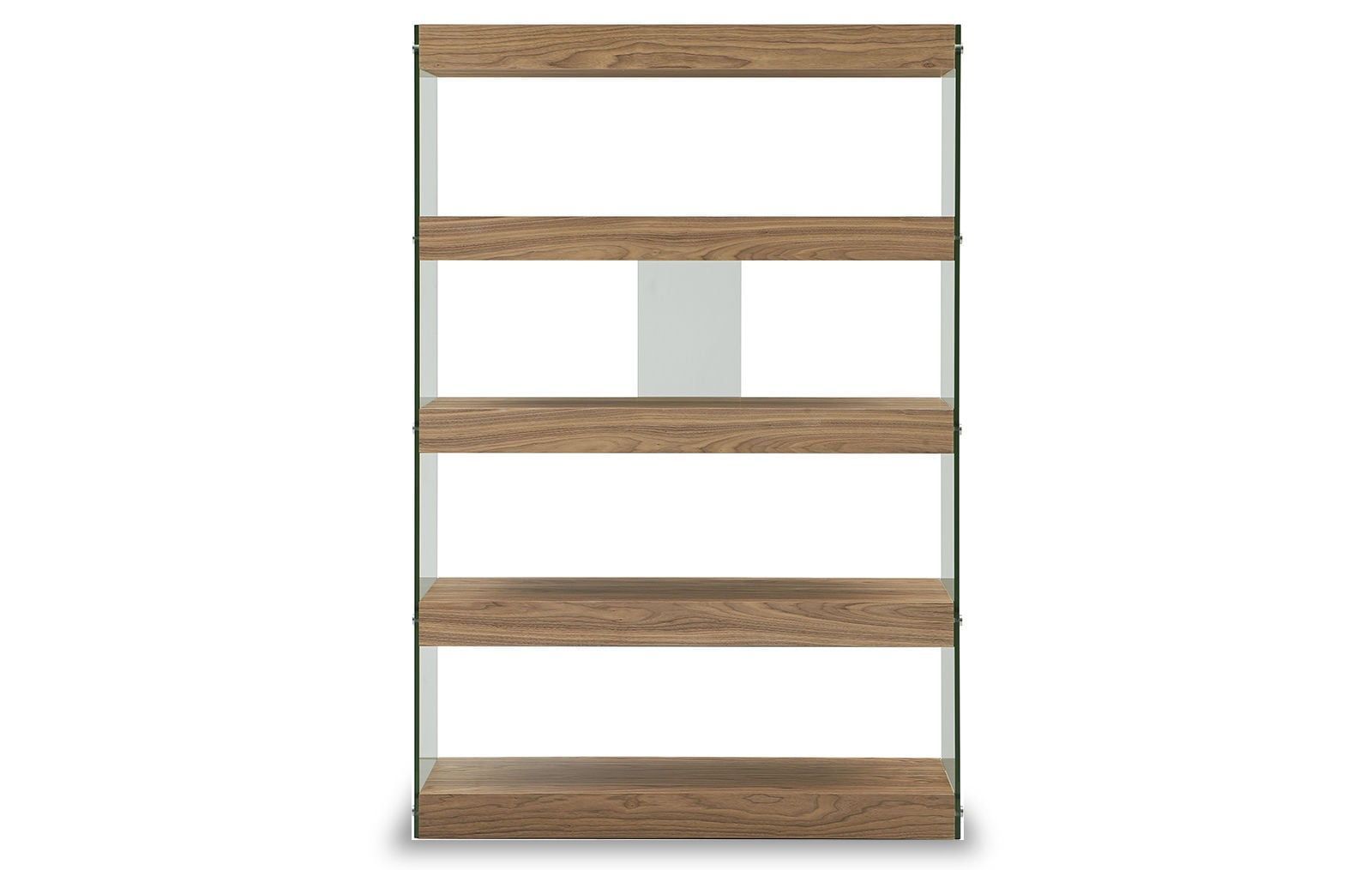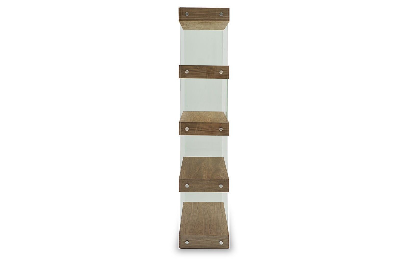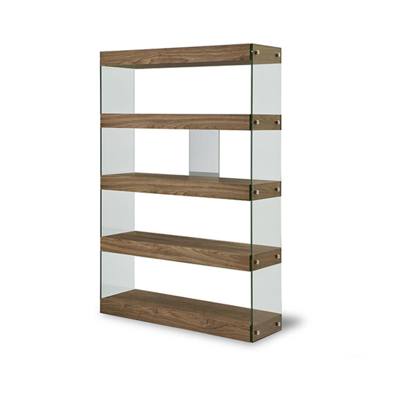 Открытые полки имеют отделку с текстурой американского ореха, боковины из закаленного стекла зафиксированы стильными крепежными элементами.