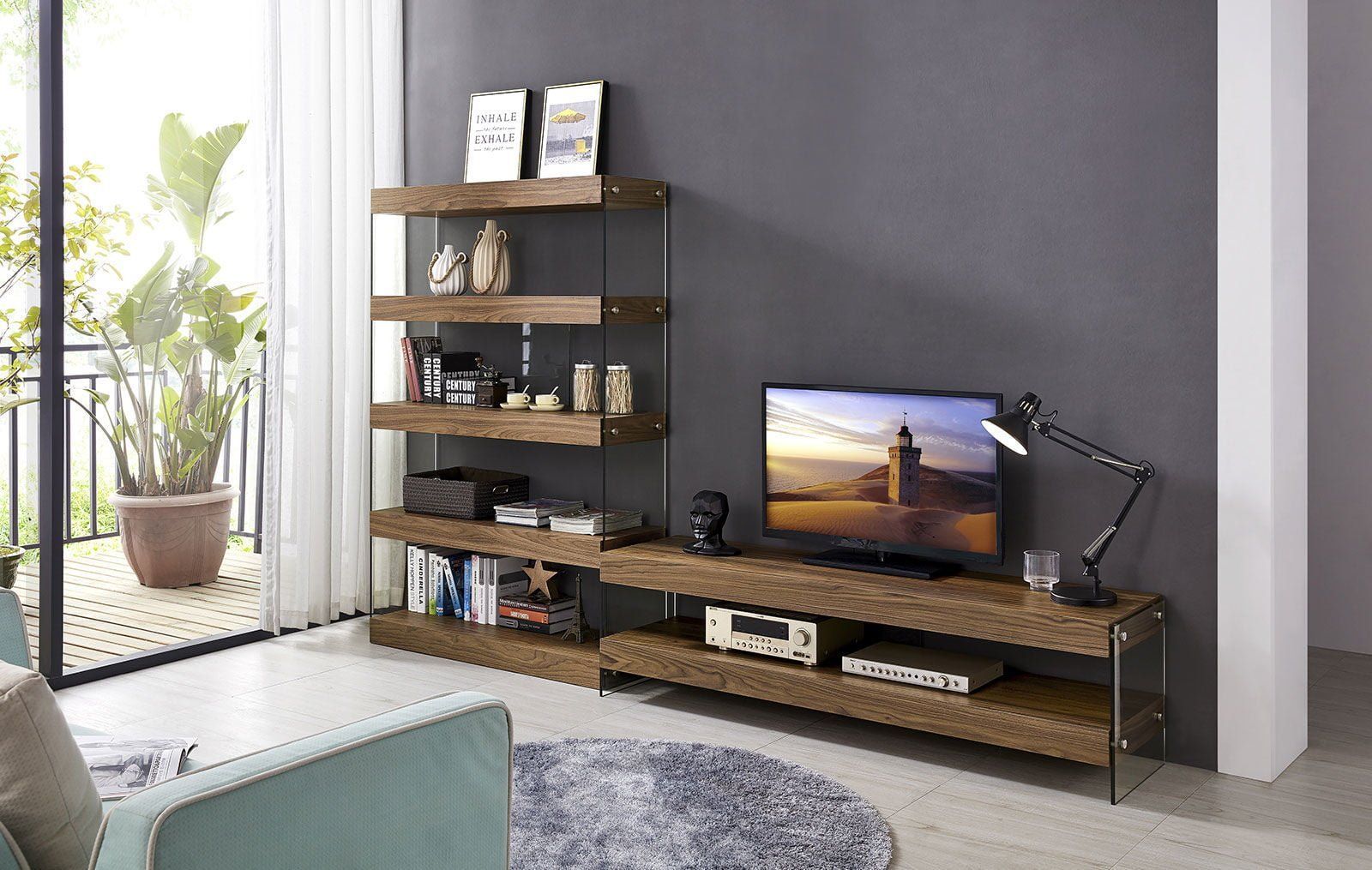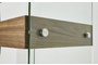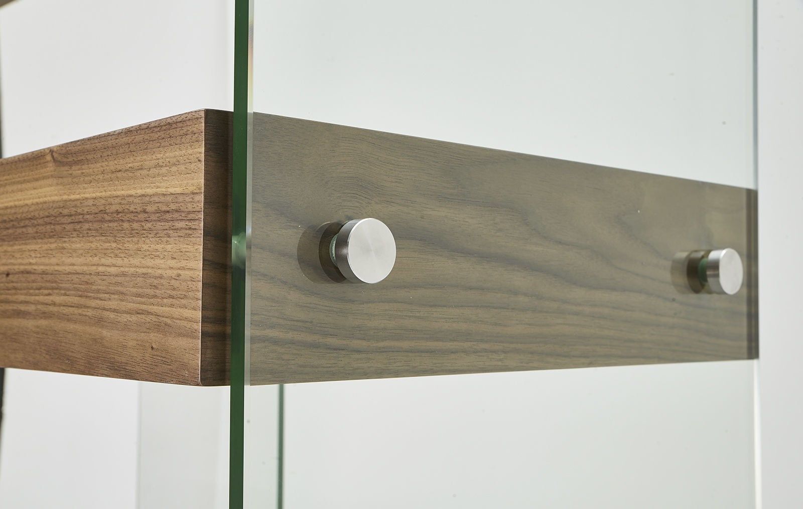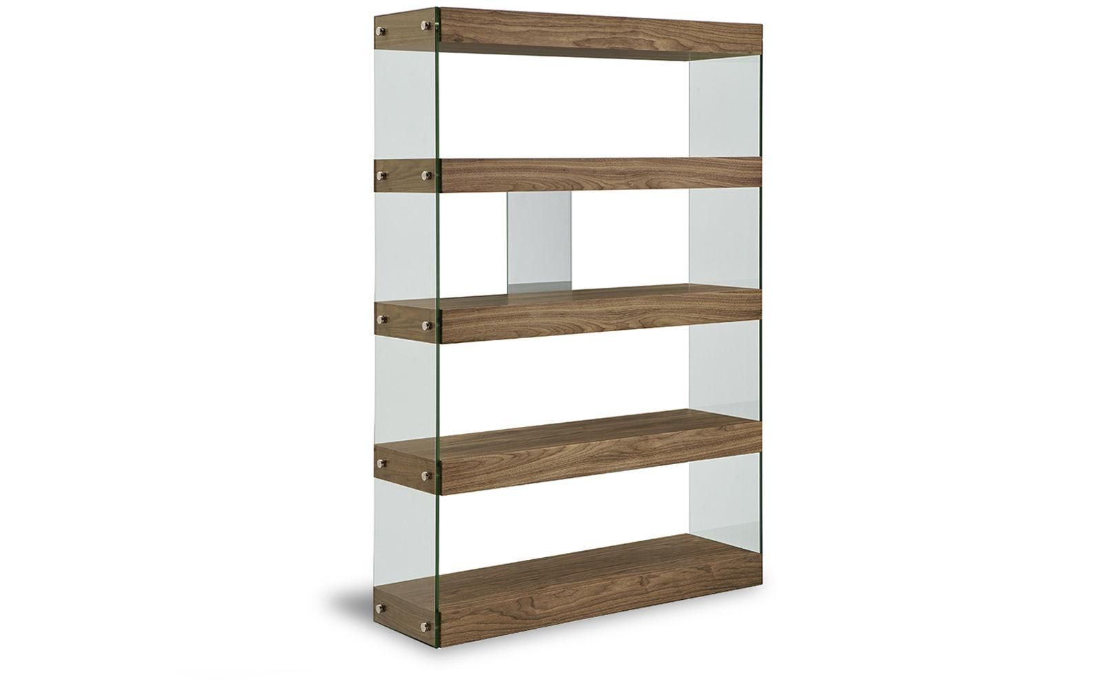 Открытые полки имеют отделку с текстурой американского ореха, боковины из закаленного стекла зафиксированы стильными крепежными элементами.