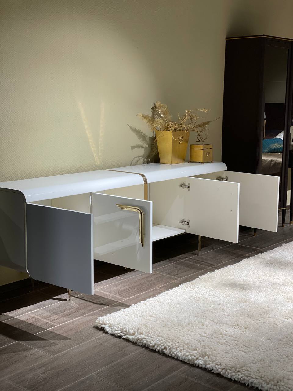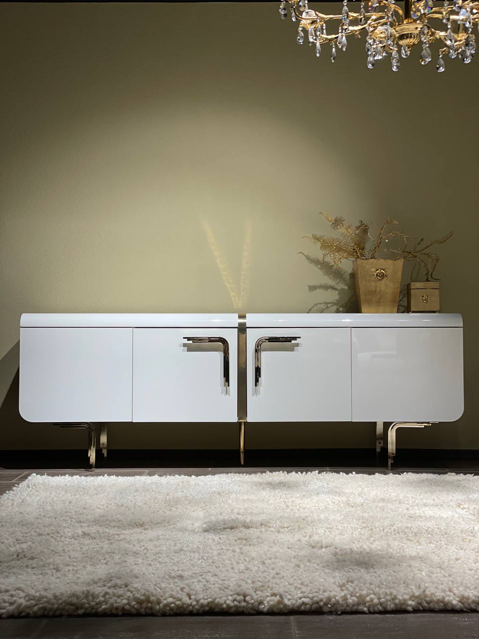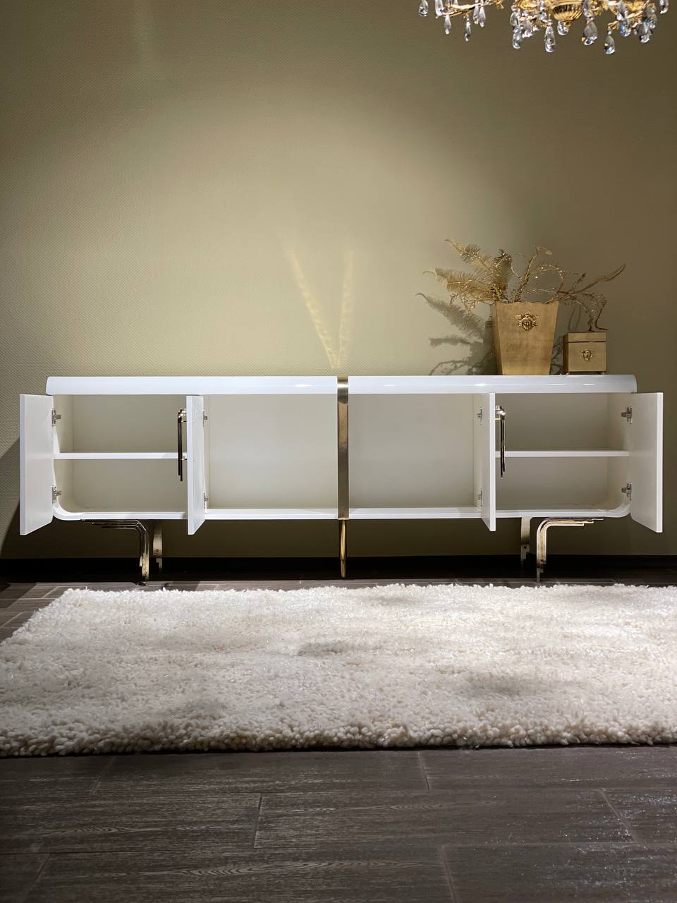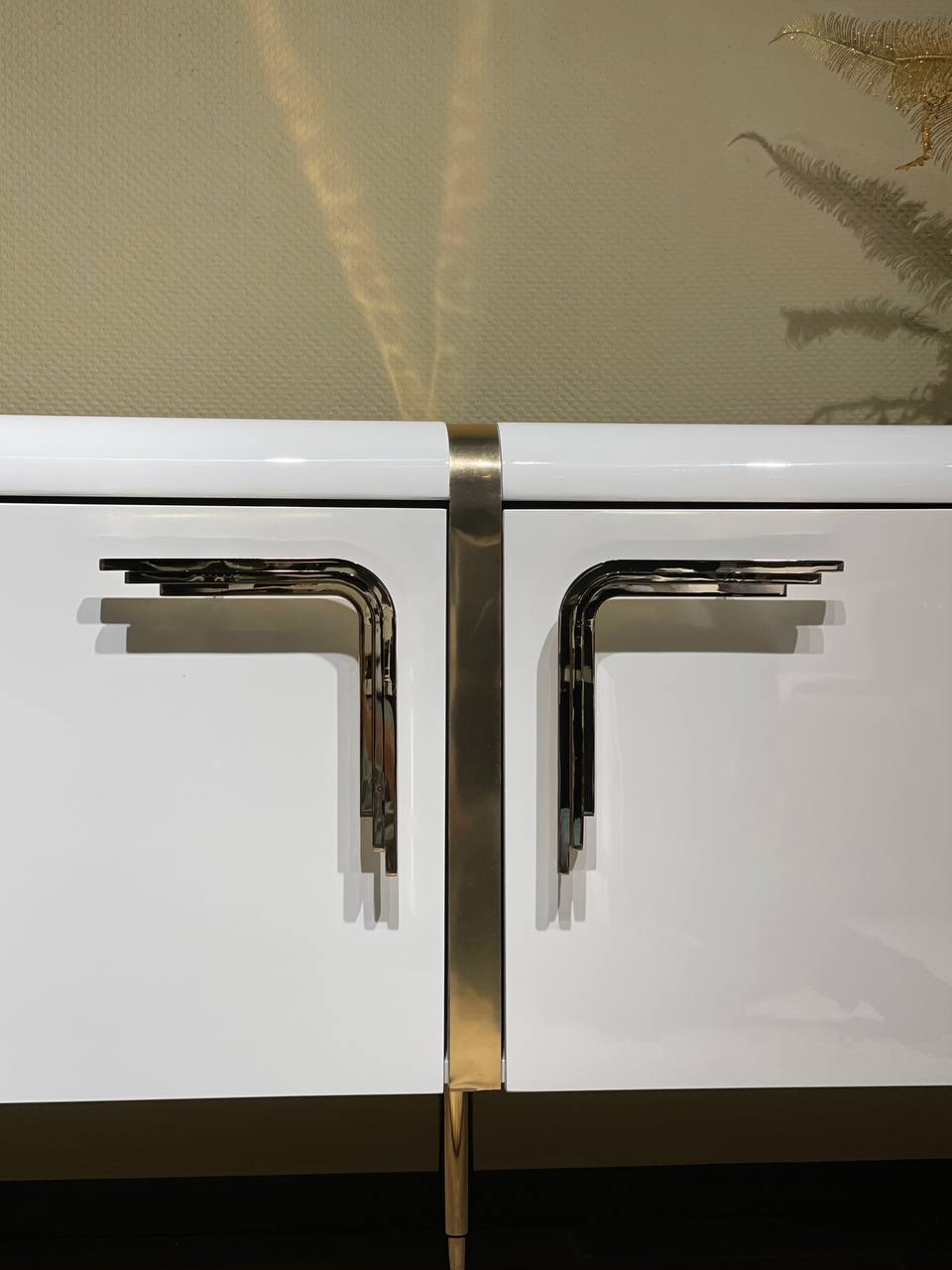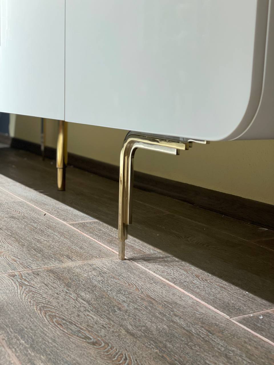 Запросить индивидуальное предложениеВнутренние детали: ДСП покрытое белым меланином. Передняя и боковые понели: МДФ глянцево белого цвета. Ручки и ножки: Золотистое титановое покрытие. Петли и миханизмы: Push open, Hettich.