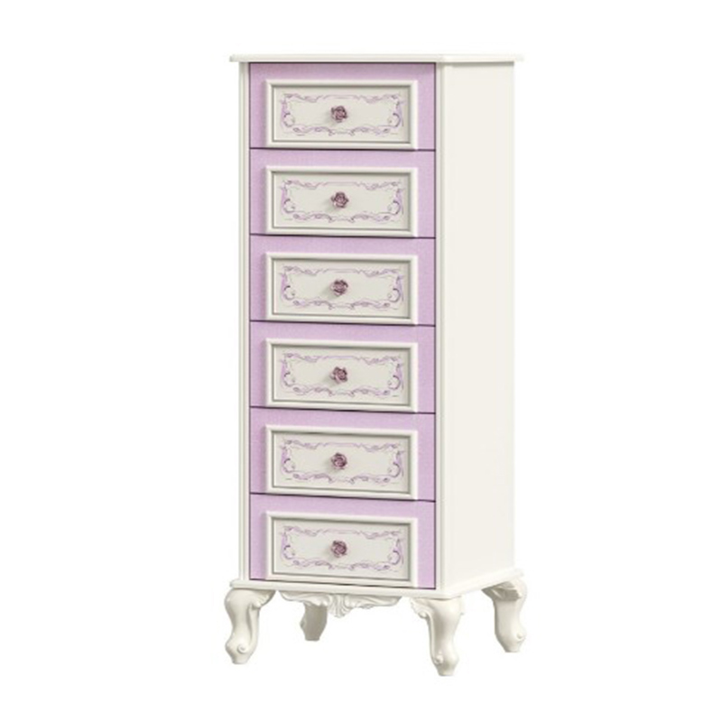Запросить индивидуальное предложениеКомод Маркиза – изящное решение для девичьей комнаты, в оформлении которой использованы элементы классического стиля. Высокая система хранения поможет найти место для множества вещей – в ней предусмотрено целых 6 выдвижных ящиков. Каждый ящик рассчитан на вес до 10 кг, легкость его выдвижения обеспечивают шариковые направляющие. Украшением комода служат пилястры, рамочные фасады с раскладкой из профиля МДФ и изысканные ручки, имитирующие полураспустившиеся бутоны роз. Во избежание случайного опрокидывания модуля рекомендуется фиксировать его к стене посредством входящей в комплект угловой подвески.