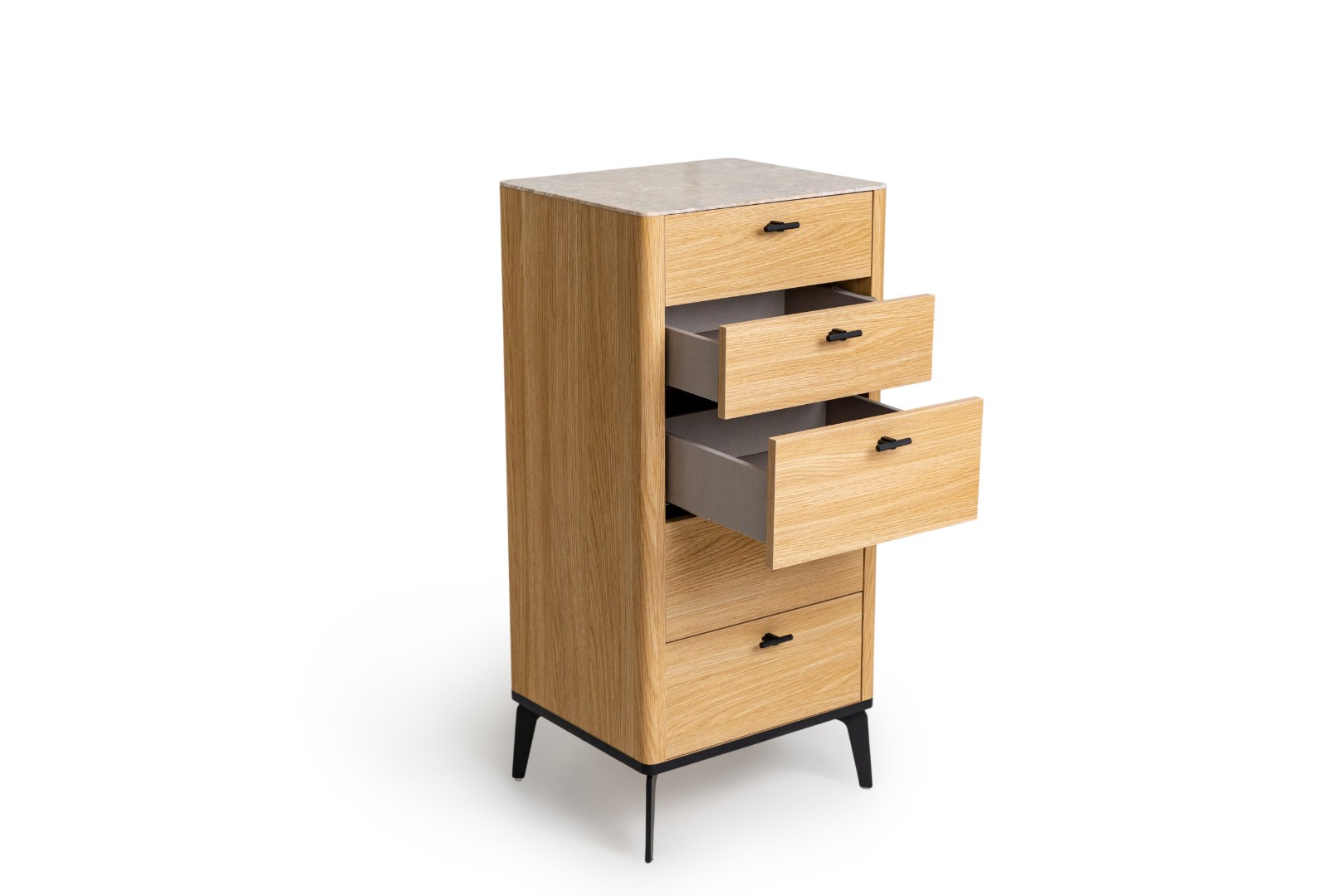 Комод выполнен из МДФ облицованным инновационным материалом с имитацией шпона. Имеет ярко выраженную текстуру и глубокий древесный рисунок. Ящики в отделке текстиль украшают внутреннее пространство комода. Качественная, скрытая система выдвижения придаёт легкость и комфорт при использовании. Топ выполнен из искусственного камня, повторяющего природный рисунок мрамора. Мягкая, обтекаемая форма легко вольется в Ваш интерьер и сделает его уютным и стильным.