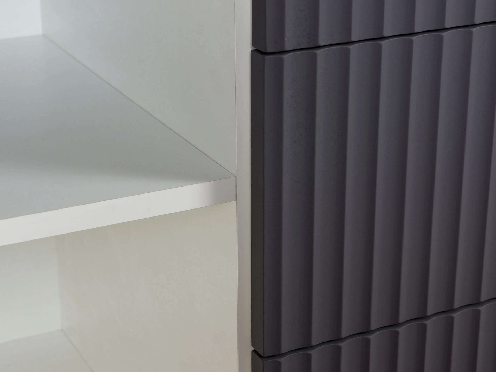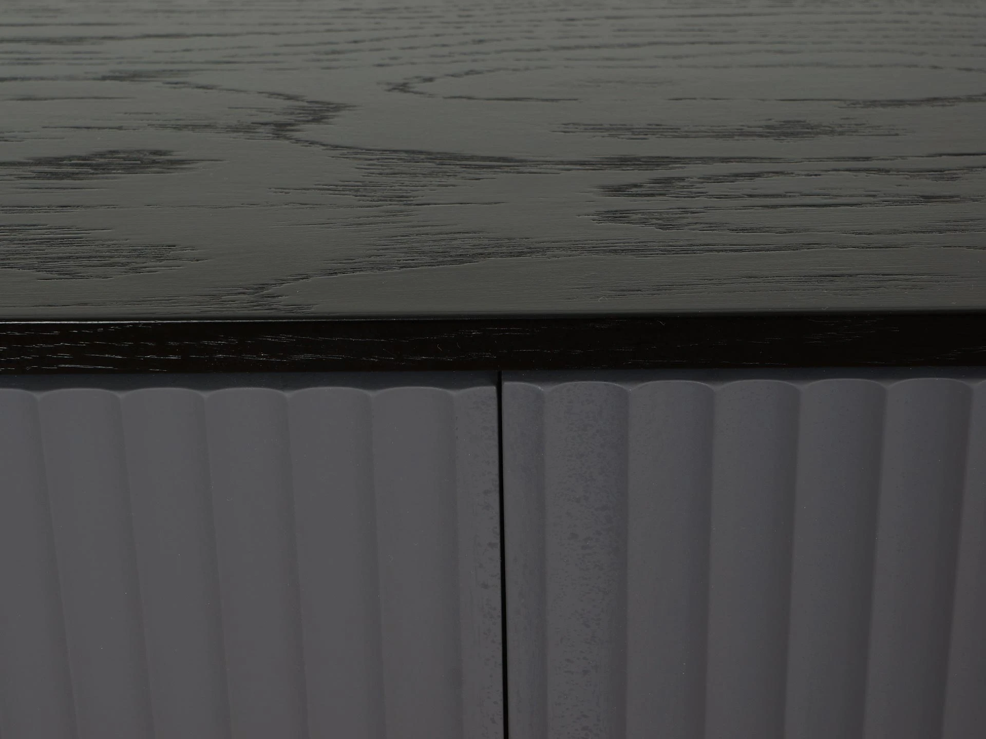 Фасад и боковые стенки коллекции Mikko с фрезеровкой выполнены из МДФ толщиной 18 мм. в декоре Софт Сантьяго. Крышка из МДФ толщиной 16 мм., облицованной строганным шпоном дуба. Остальные детали корпусов выполнены из плиты ламинированной толщиной 16 мм., декор белый гладкий.