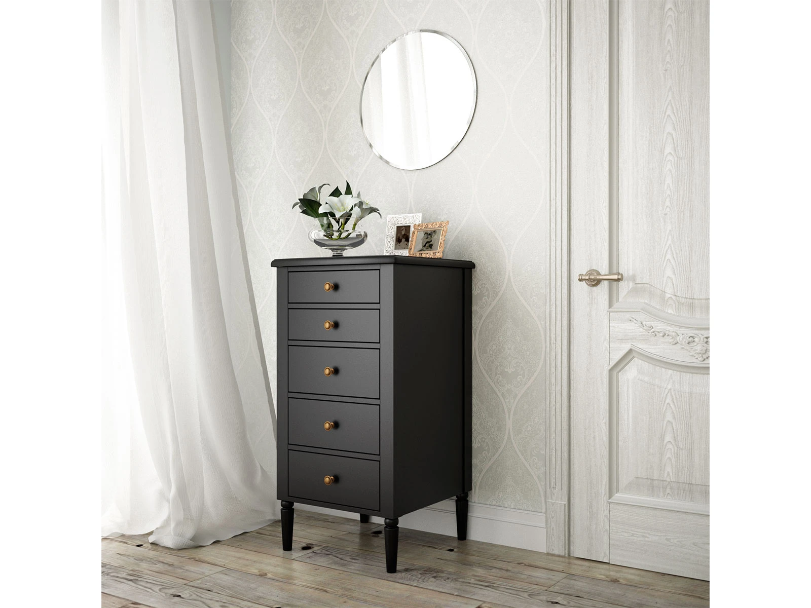 Комод имеет 5 выдвижных ящиков. Рекомендуется крепить к стене.