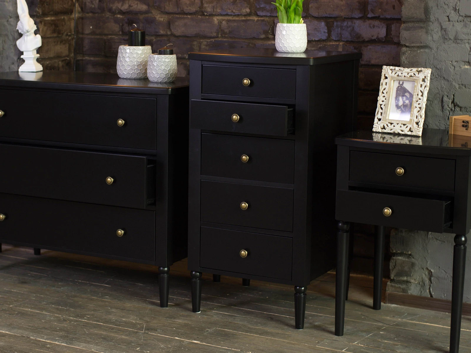 Коллекция Music — респектабельная мебель с классической основой. Обладает притягательной энергетикой изящных форм, поэтичного черного цвета и безупречным исполнением. Комоды, тумбы, банкетки, консольные и журнальные столики подходят для оформления гостиной, спальни, прихожей, мастерской, студии, бьюти-зоны. Идеально вписывается в стилистику неоклассики, арт-деко, минимализма, эклектики. Лейтмотив коллекции — барочные элементы: фигурные ножки из массива дерева, каретная стяжка «капитоне», акцентные детали в бронзовом и золотистом цвете. Изделия подчеркнут в интерьере смелость, выразительность, спокойствие. Они надежно сохранят ваши секреты, помогут разложить вещи по местам и поддержат настроение «тихой роскоши». Могут выступать на контрасте с главенствующим светлым оттенком или быть частью ненавязчивого темного фона.