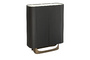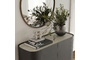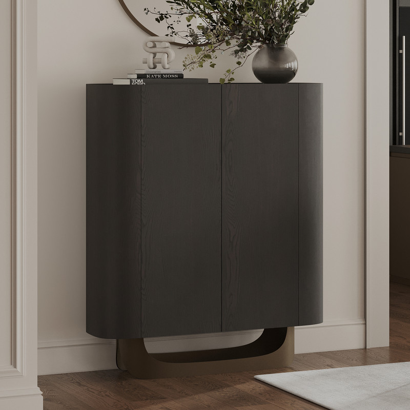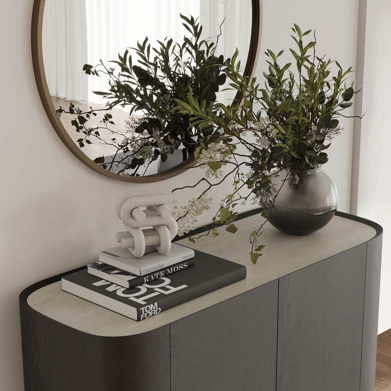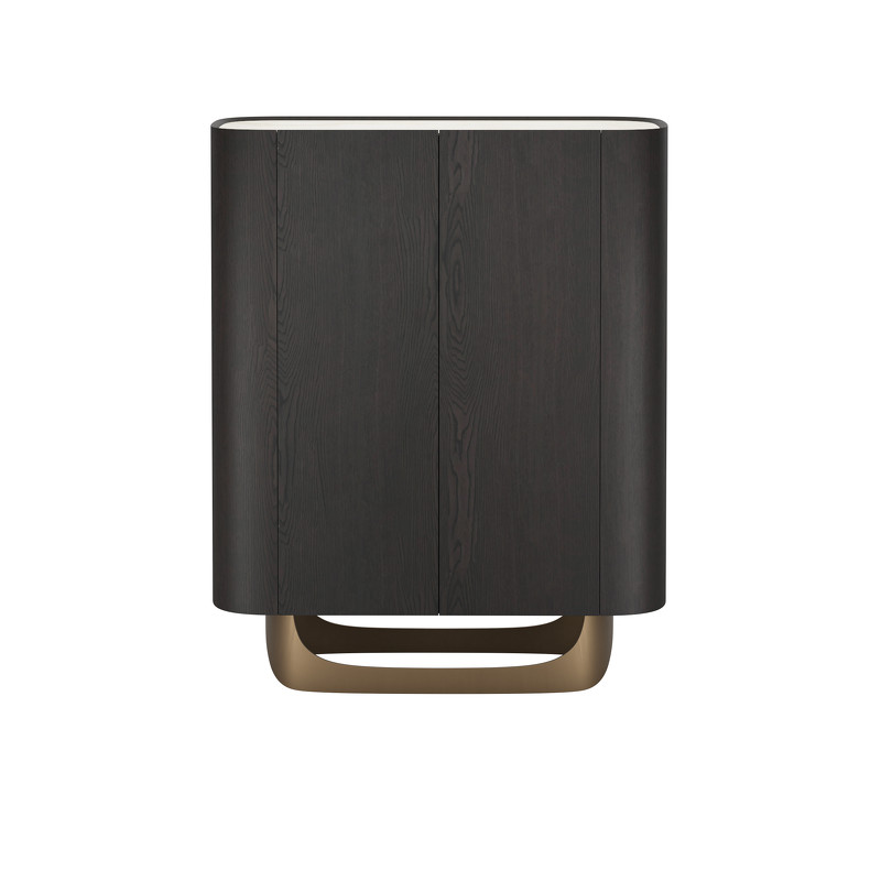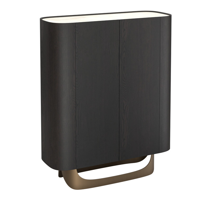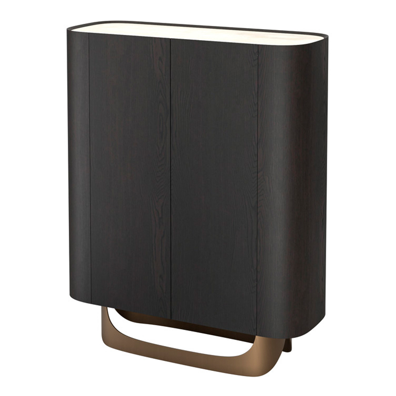 Буфет выполнен из высококачественного МДФ высокой плотности. Столешница - керамика, корпус в отделке матовый шпон вяза, внутренние панели меламиновые, ножки металлические - в цвете матовая латунь. Внутренняя задняя стенка зеркальная.