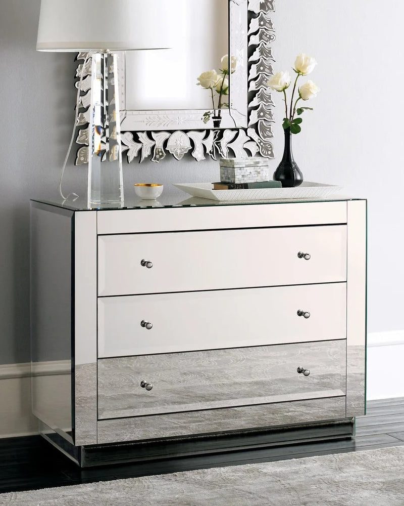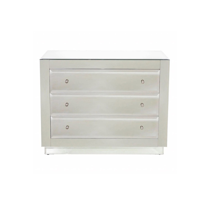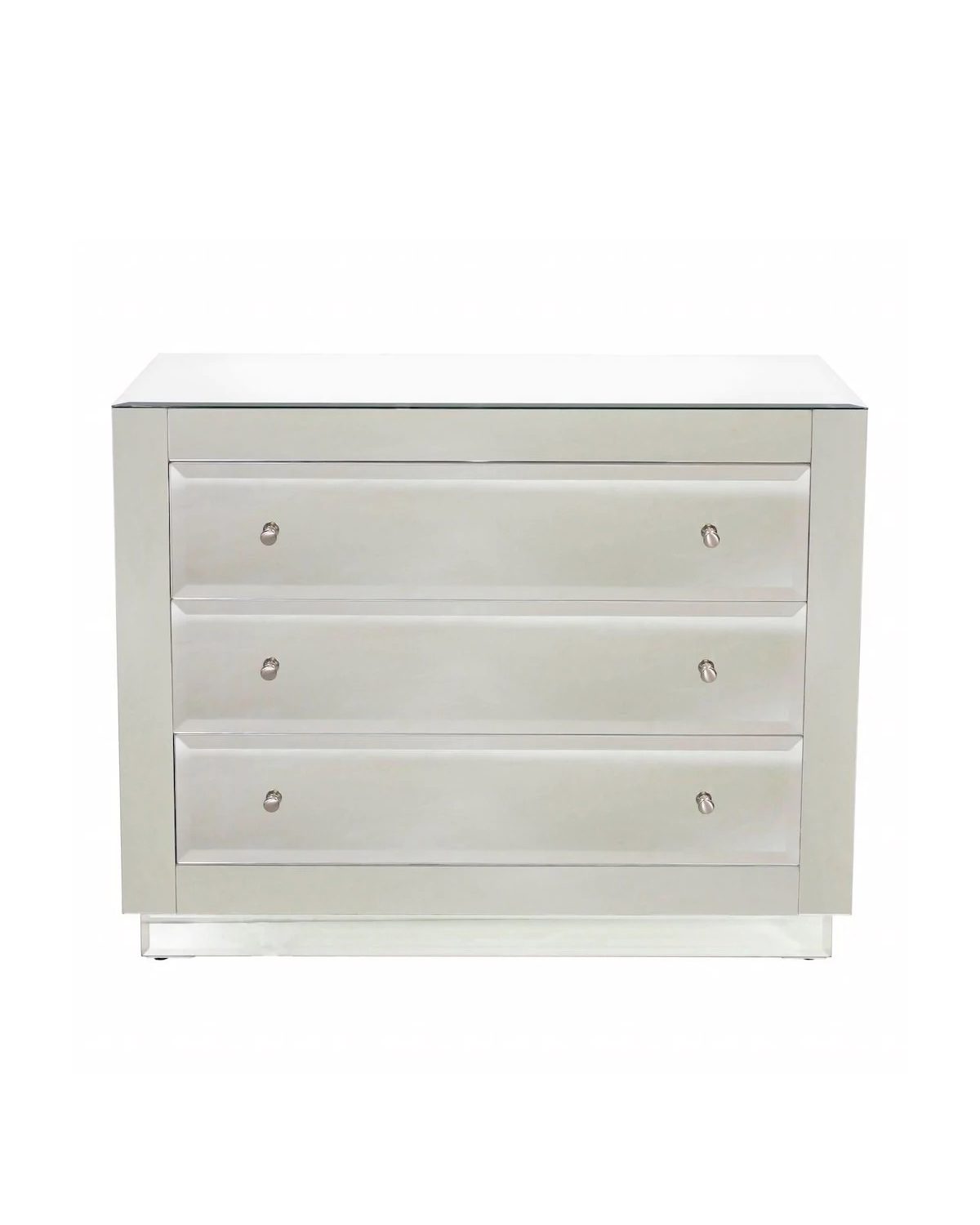Запросить индивидуальное предложениеУниверсальная и функциональная зеркальная тумба “Мишель” с тремя ящиками. Прямые линии придают минималистичный и стильный вид, прямоугольная форма, подчеркивает зеркальную отделку. В соответствии со светоотражающей концепцией, ящики дополняются хромированными ручками. Три вместительных ящика, где ваши личные вещи будут аккуратно и организованно собраны, верхняя часть может быть использована для настольной лампы или некоторых декоративных аксессуаров. Зеркальная поверхность тумбы делает его идеальным вариантом для освещения любого слабоосвещенного угла вашей спальни.