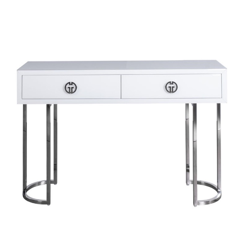 Запросить индивидуальное предложениеНежная белая консоль в стиле арт-деко станет прекрасным дополнением современного интерьера гостиной или спальни. Оригинальный дизайн позволяет хозяевам дома заявить о своем статусе. Стильная консоль с 2 ящиками отличается элегантностью, особой эстетикой и эргономичностью. Особого шика мебели придает стеклянная столешница и изящные, необычные ножки из нержавеющей стали в хромированной отделке. Закажите консоль в спальню или гостиную – подчеркните индивидуальность вашего интерьера за счет уникальной модели, разработанной дизайнерами Garda Decor.