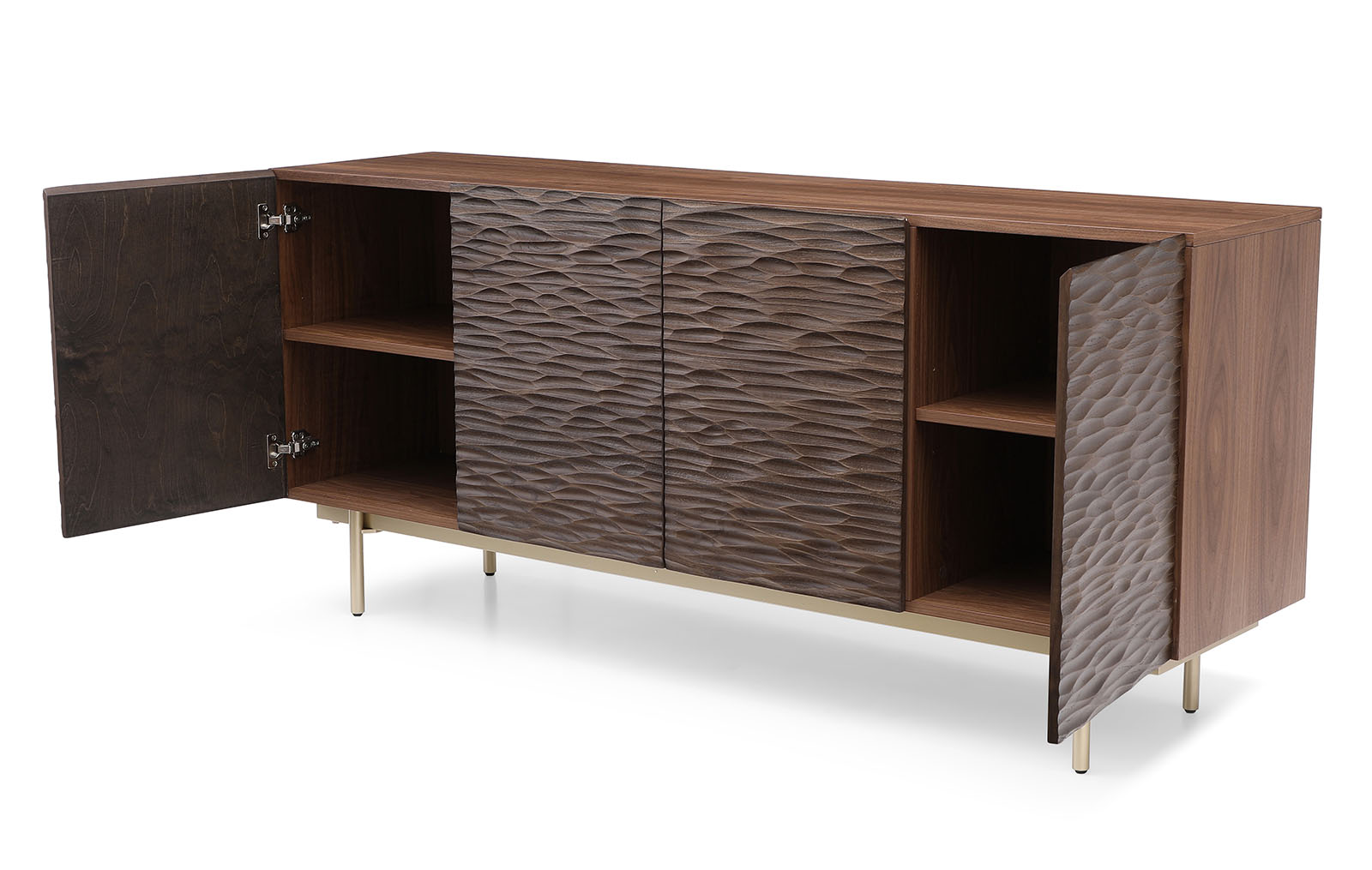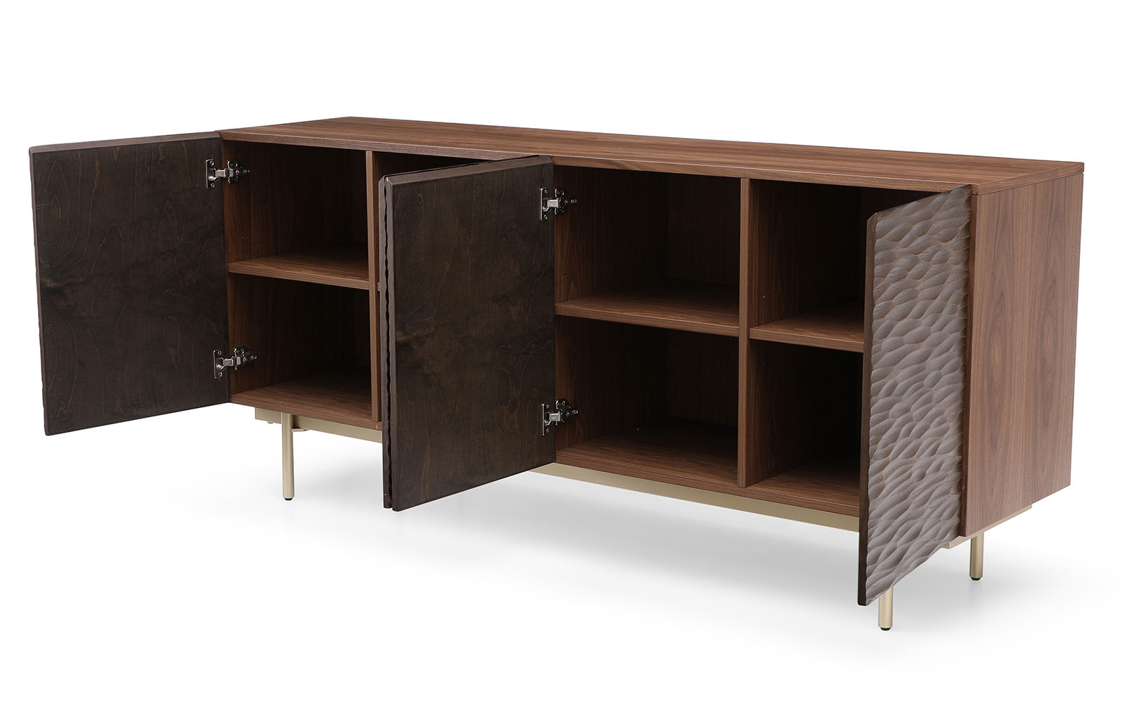 Буфет имеет четыре дверцы, за которыми скрываются вместительные отделения с полочками, обеспечивая удобное хранение вещей и позволяя поддерживать порядок в пространстве.