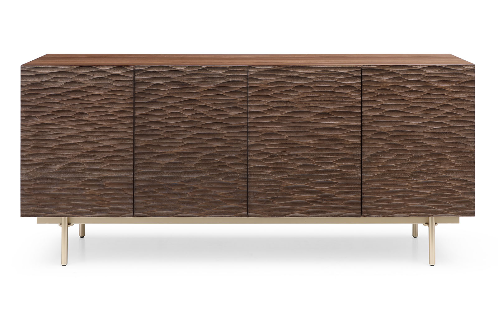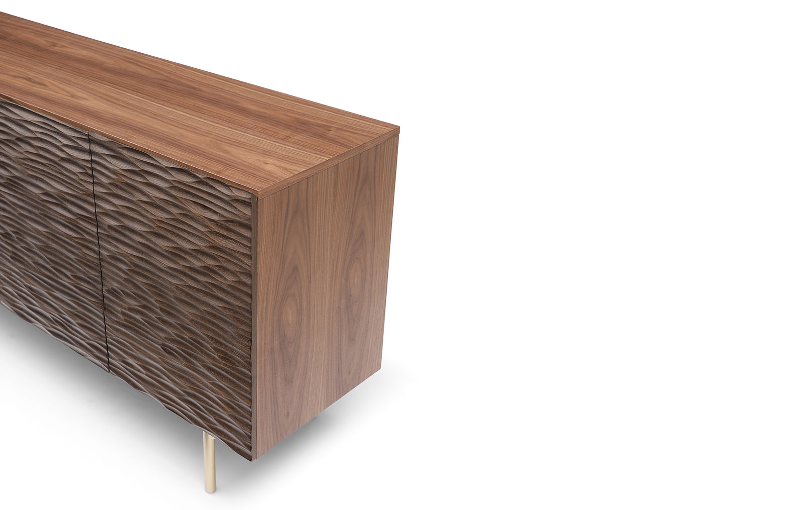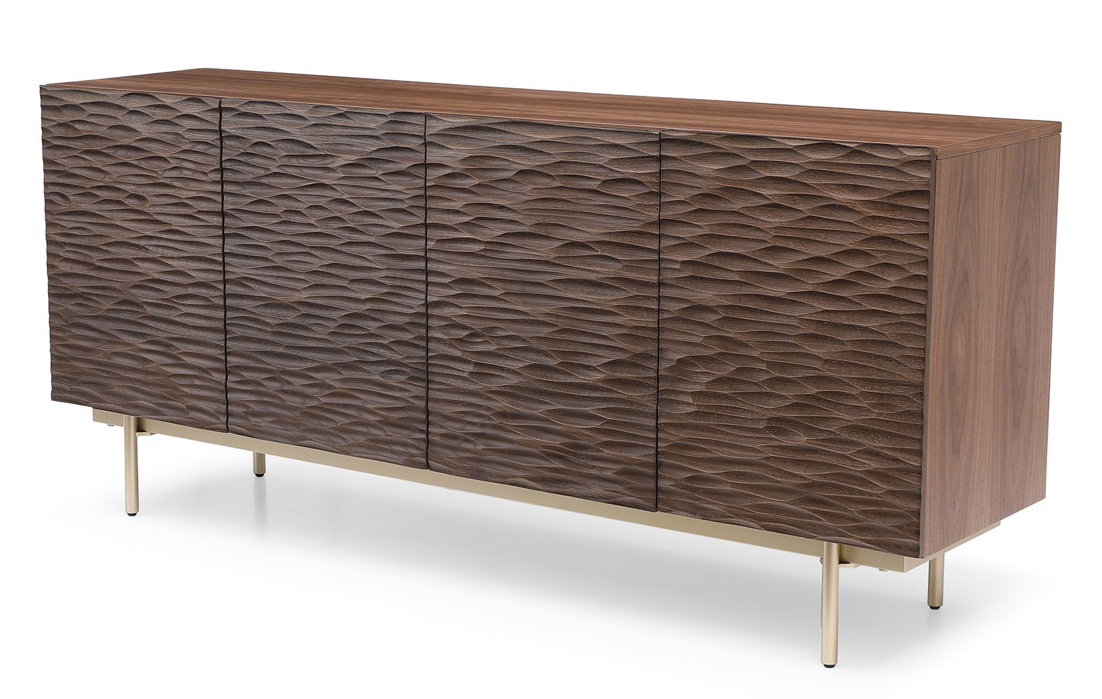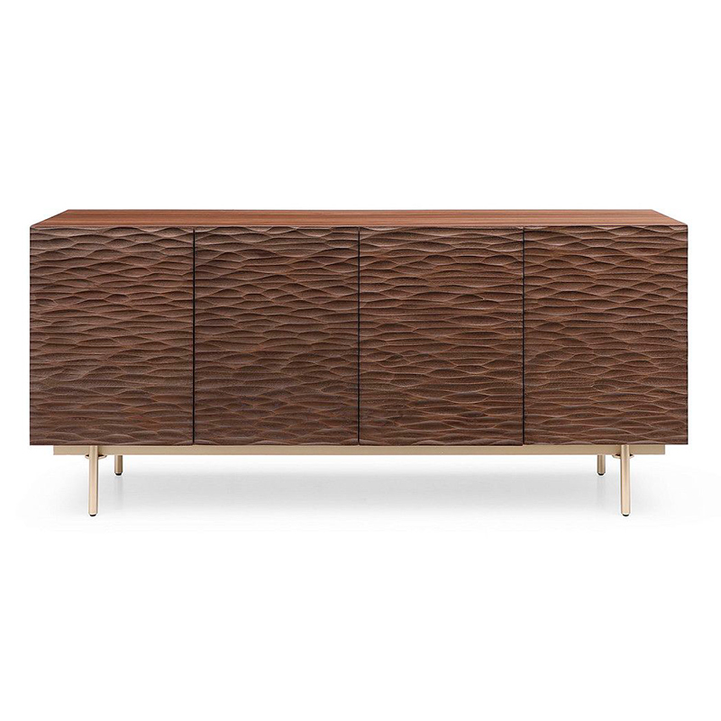 Корпус буфета выполнен из MDF в натуральном шпоне ореха и декорирован фактурными фасадами с покрытием из резного дерева (массив дуба, тонированный в оттенок ореха).