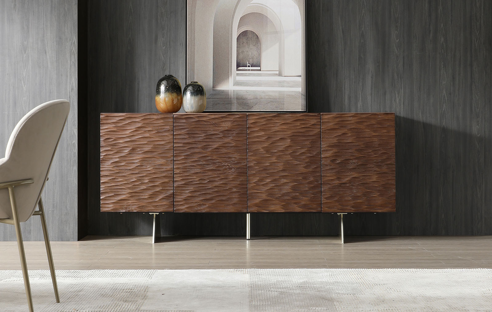Текстура дерева подчеркивает изысканность интерьера, а золотистый металл добавляет нотку роскоши в обстановку.