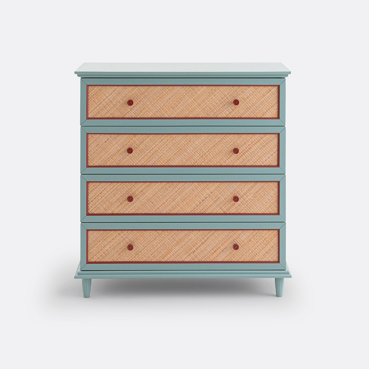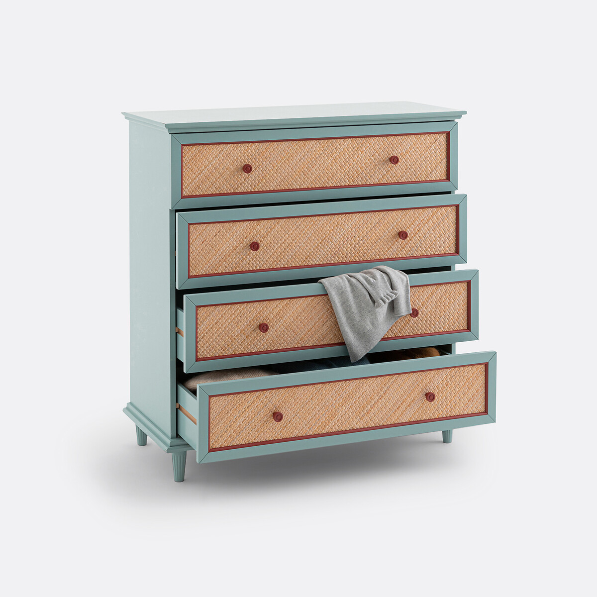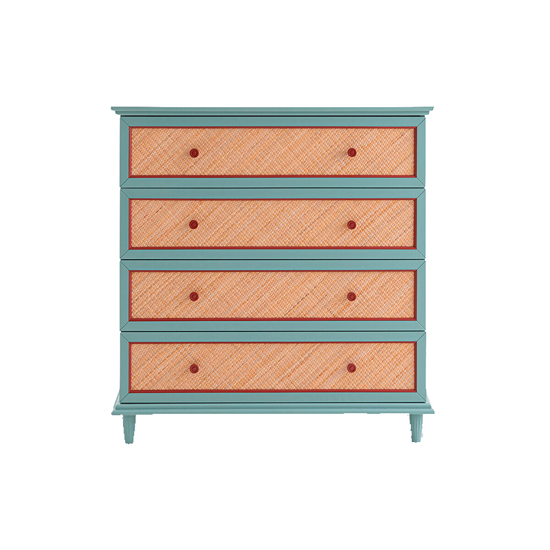 • Фасад ящиков из окрашенной МДФ с акриловым покрытием, из плетеного ротанга и рамки из окрашенного ясеня